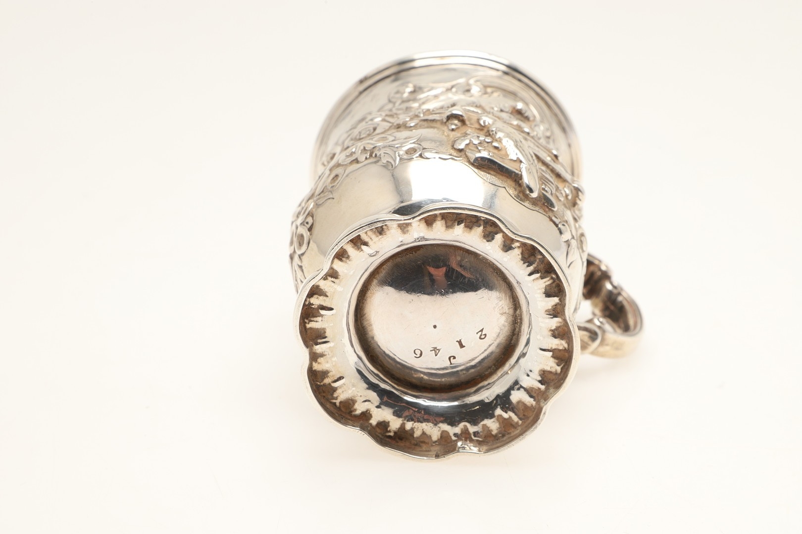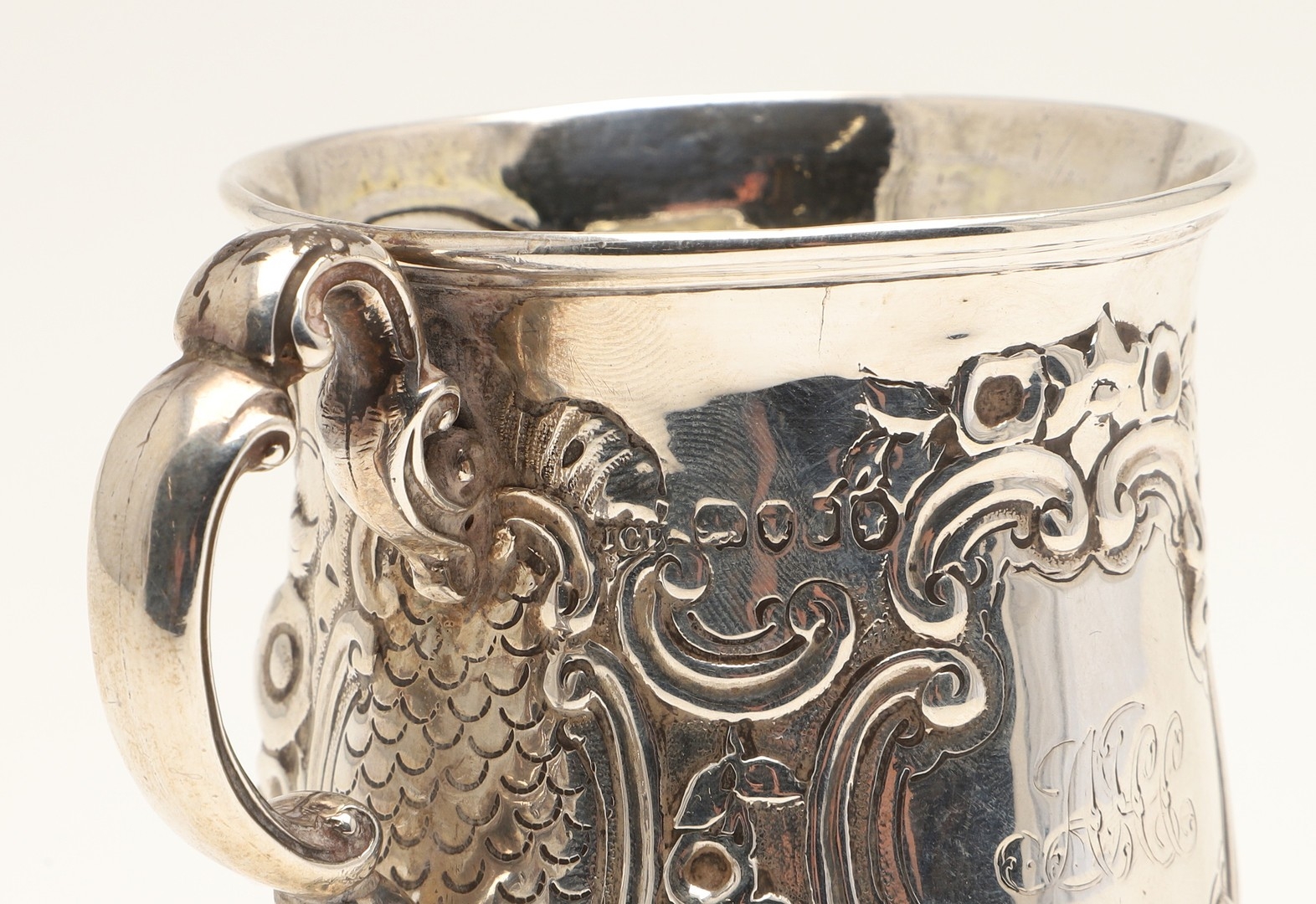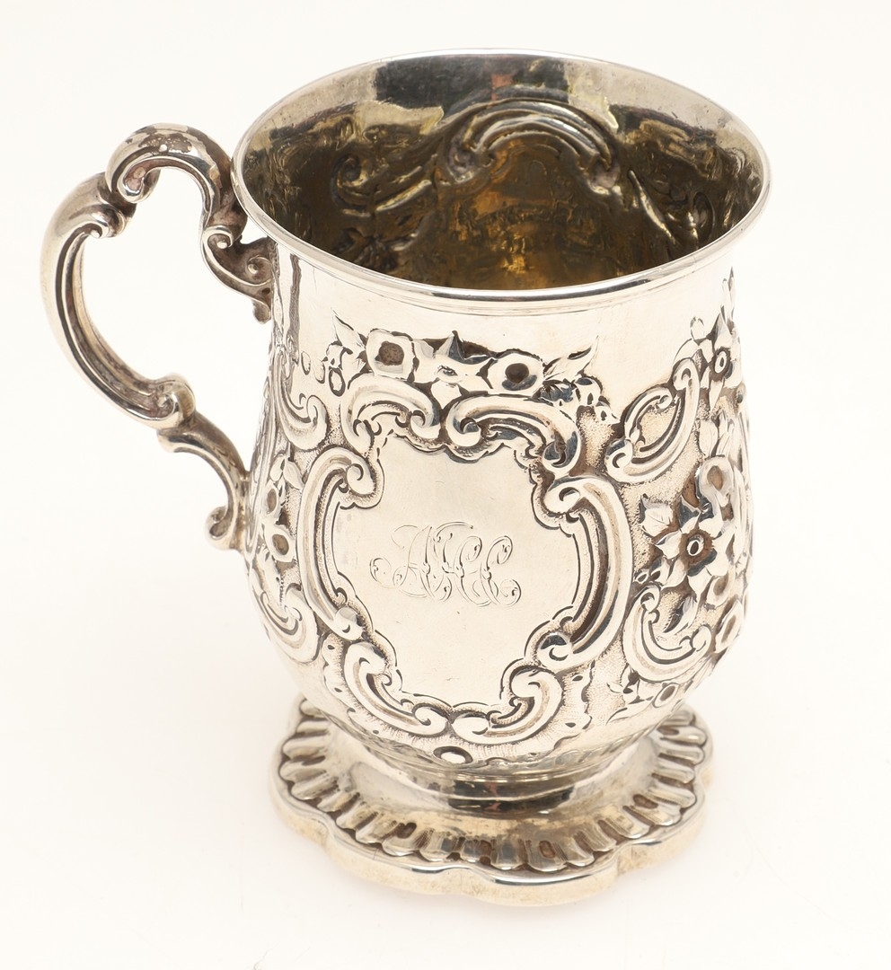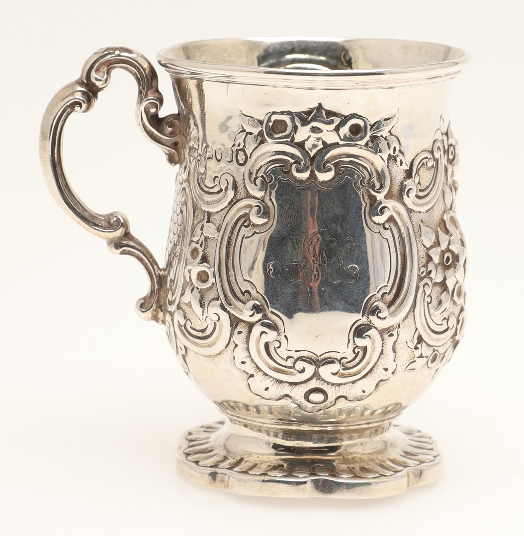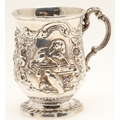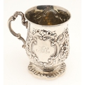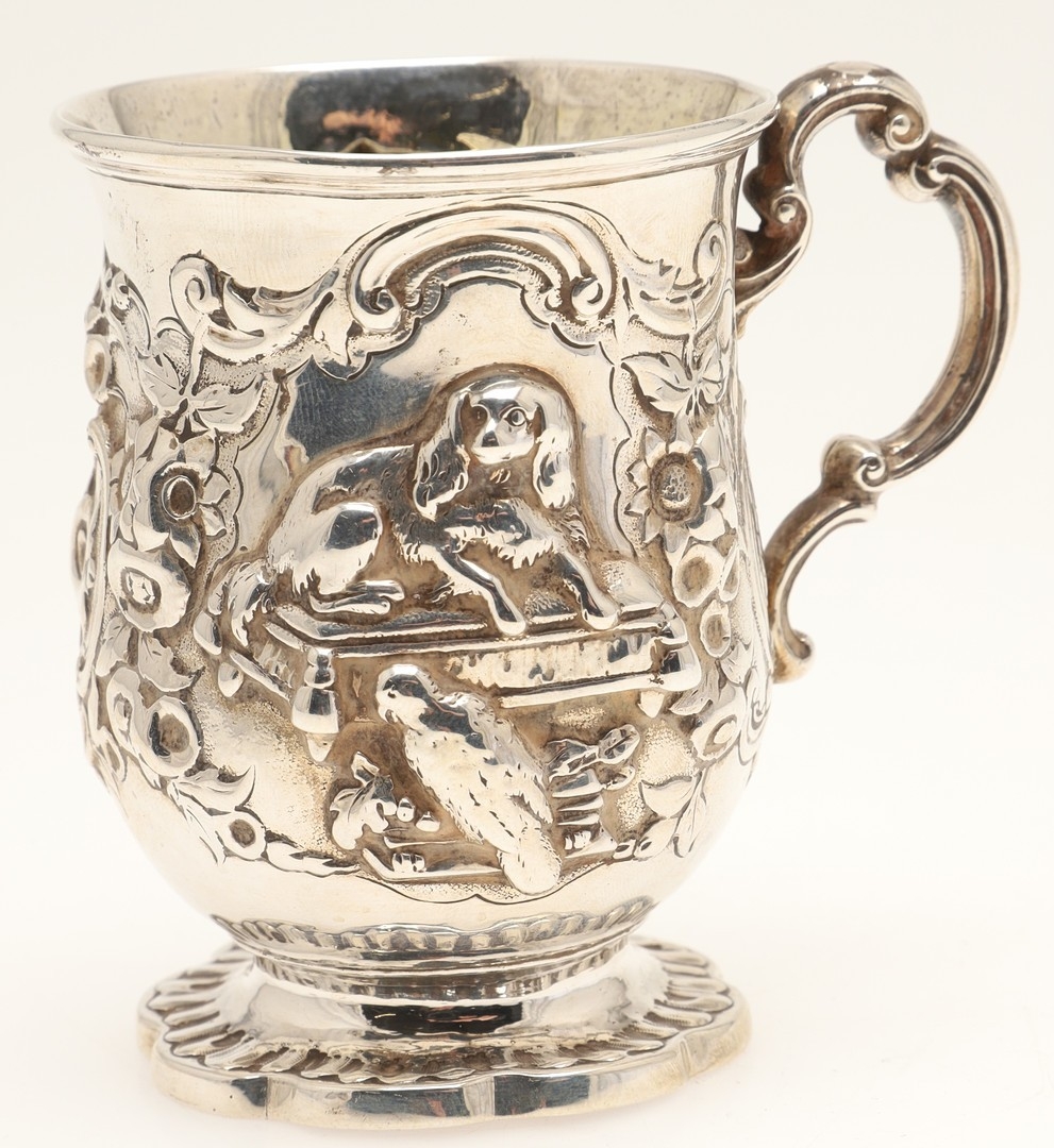 A VICTORIAN SILVER ROCOCO DECORATED CHRISTENING MUG. Of baluster form, with floral and c-scroll decoration throughout, one side centred a recumbent spaniel and a parrot, the opposing side with initialed tablet, on ribbed octofoil base,