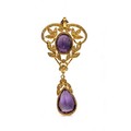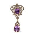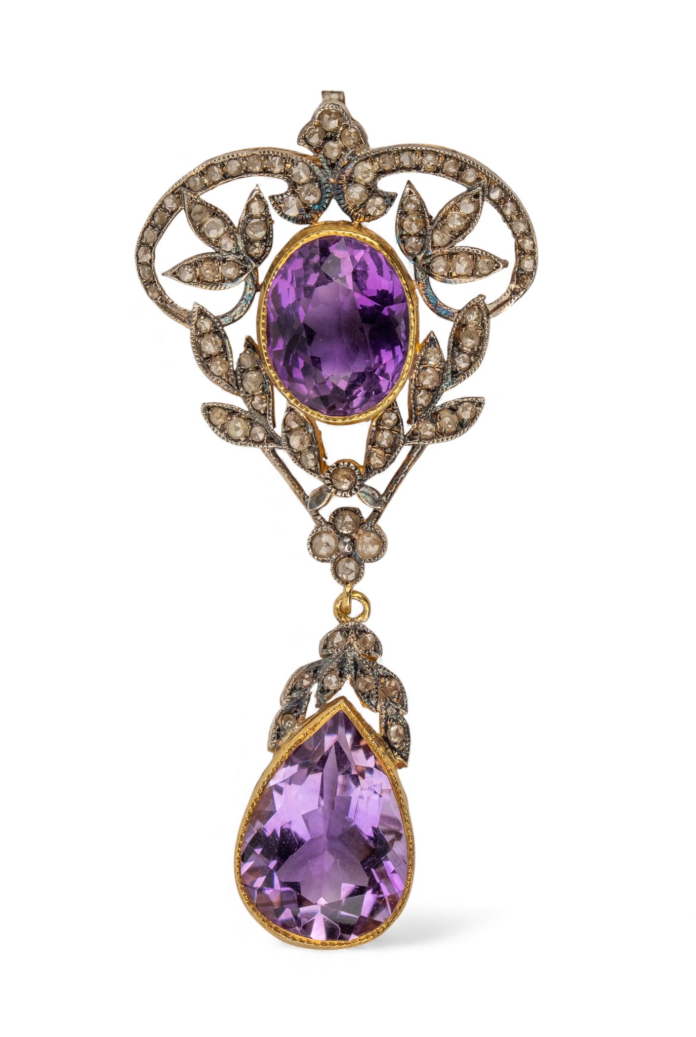 The oval-shaped amethyst top within a scrolled rose-cut diamond surround, and suspending a pear-shaped mixed-cut amethyst.