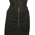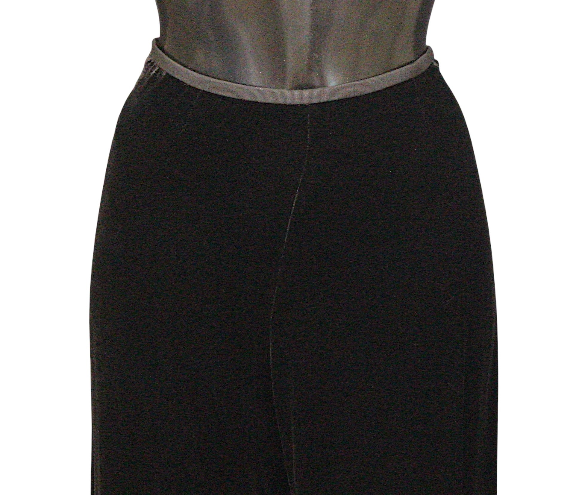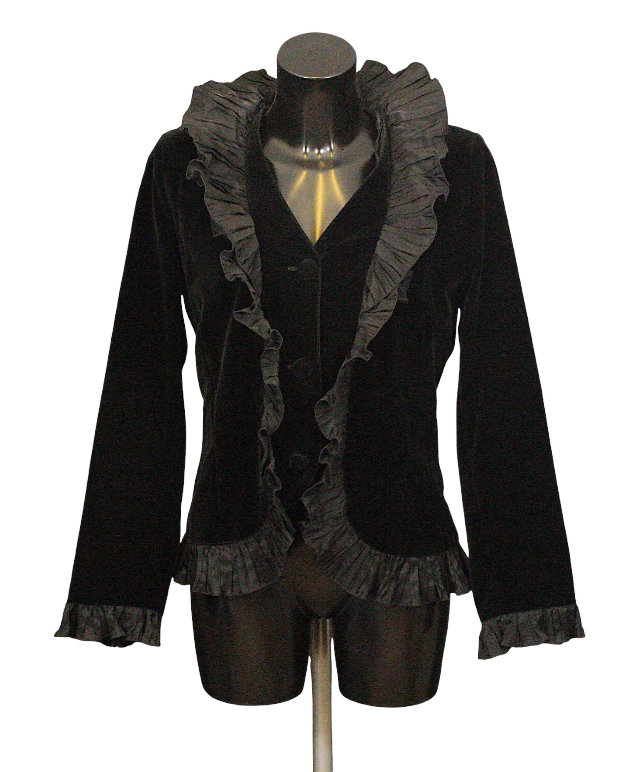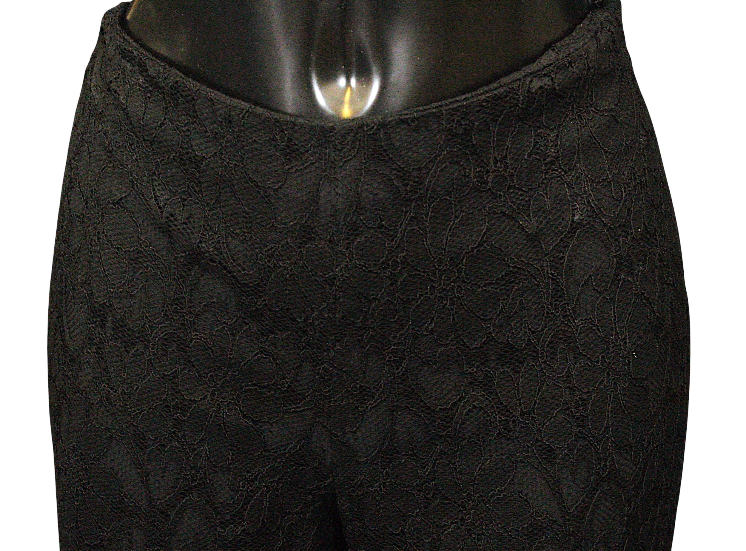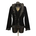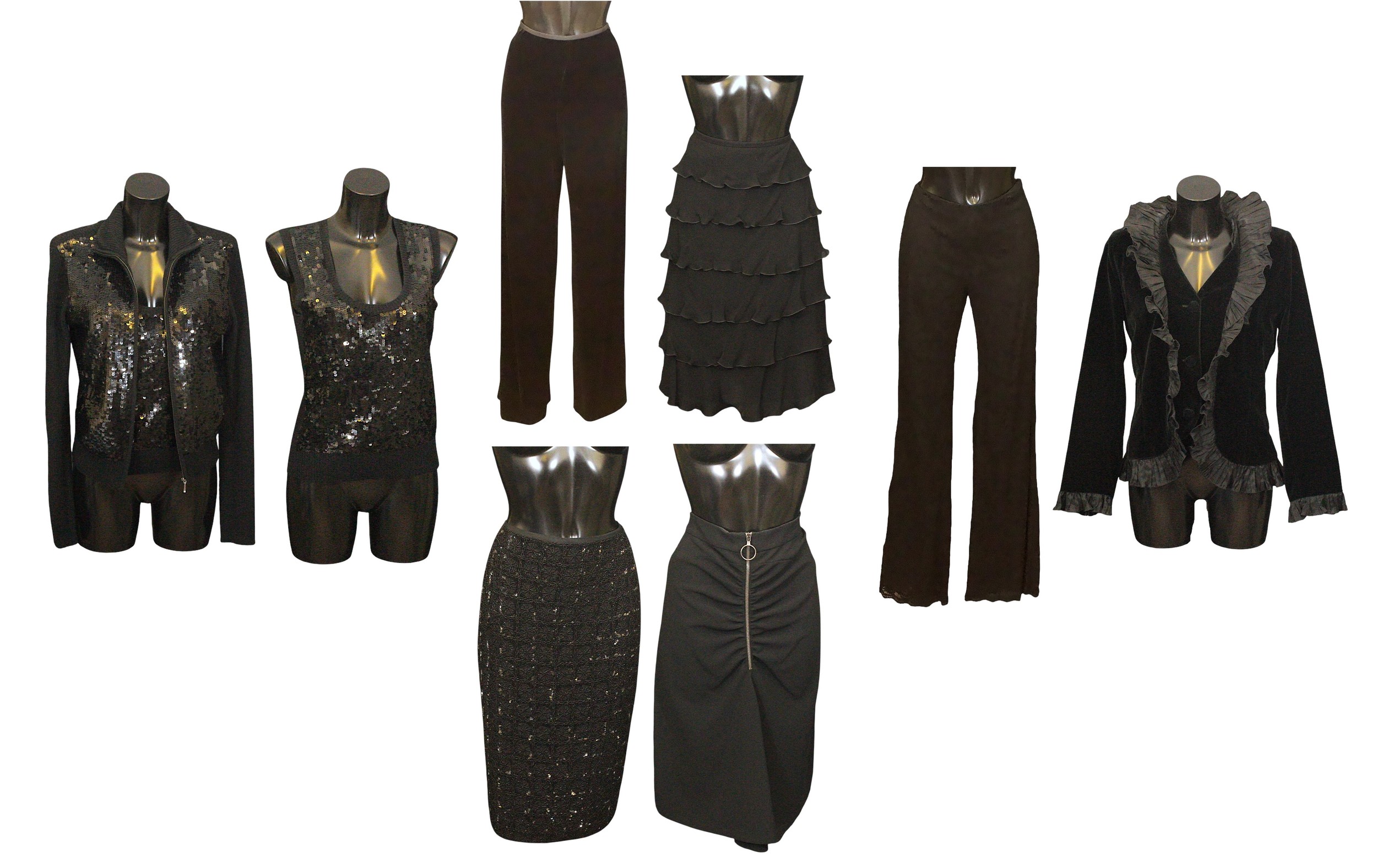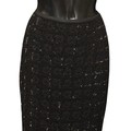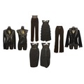 Designer Fashion: A collection of eight garments, the majority in black colours, including: an Armani Collezioni pair of velvet trousers, size 42; a Louis Kennedy black beaded pencil skirt, waist flat 38cm; a DKNY knitted cardigan and vest set, embellished with sequins, wool mix, size M; a Moschino pencil skirt, synthetic, UK size 10; an Armani Collezioni black skirt, with ruffle detail, size 42; a pair of black lace trousers, made in Italy, size 42; a Janes Lakeland black velvet jacket, ruffle sleeve and cuffs, made in Italy (8)
