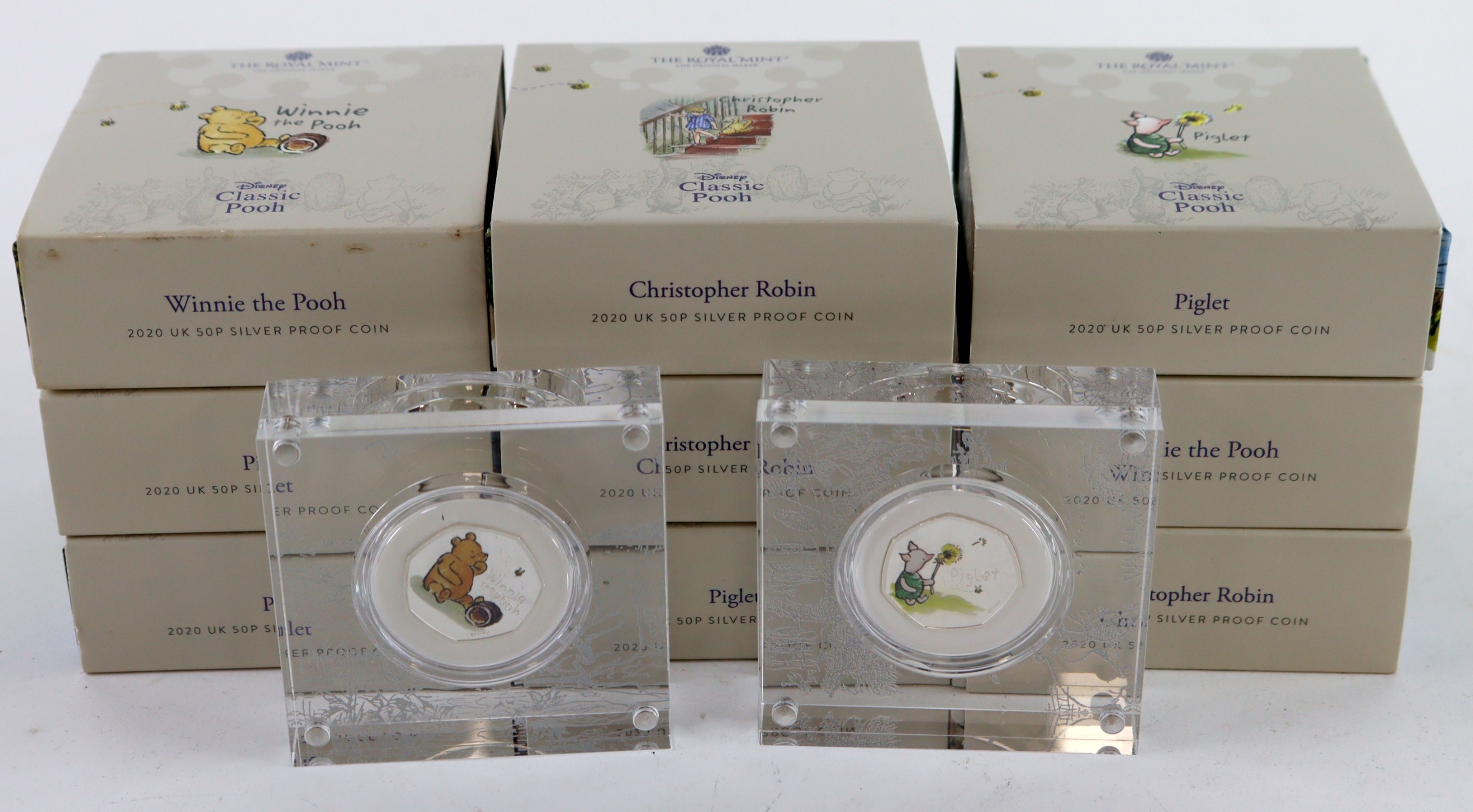GB Silver Proof Fifty Pences (11) All from the "Winnie the Pooh" series 2020-2022. Piglet x5, Eeyore, Christpher Robin x3, Winnie the Pooh x3. aFDC/FDC all boxed as issued