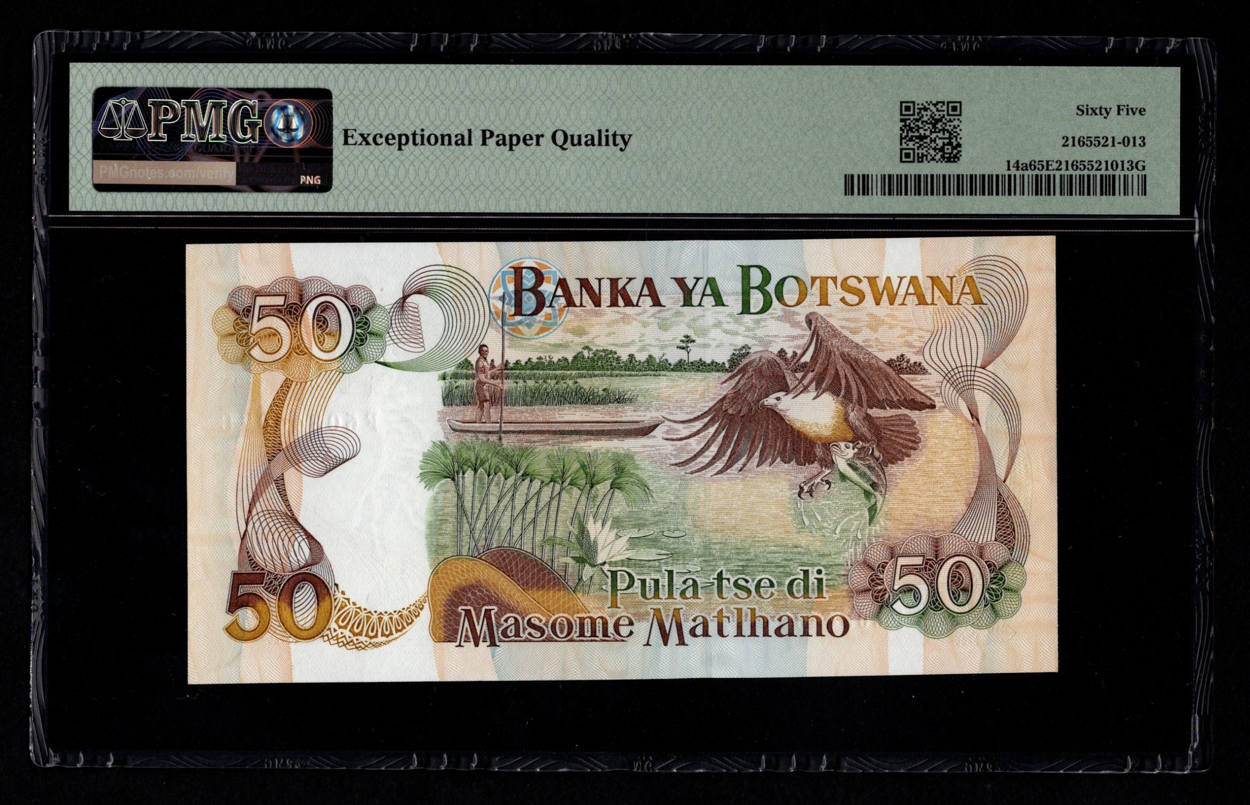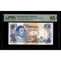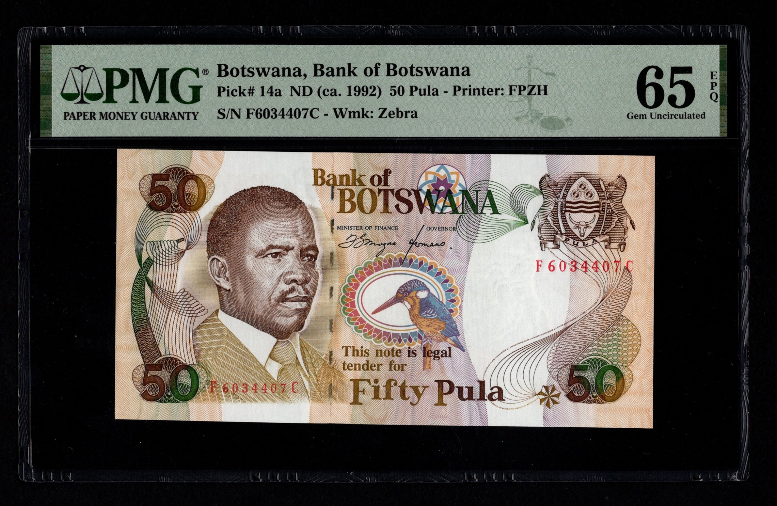 Botswana 50 Pula issued 1992, serial F6034407C (BNB B114a, Pick14a) in PMG holder graded 65 EPQ Gem Uncirculated, exceptional paper quality