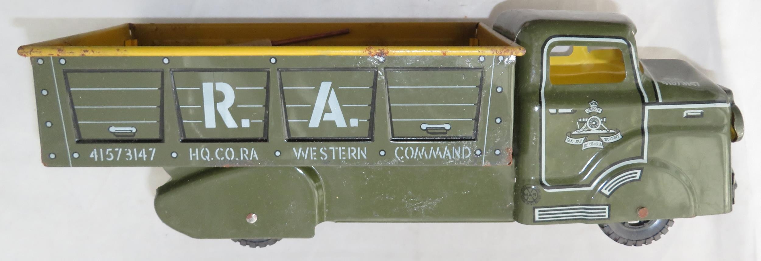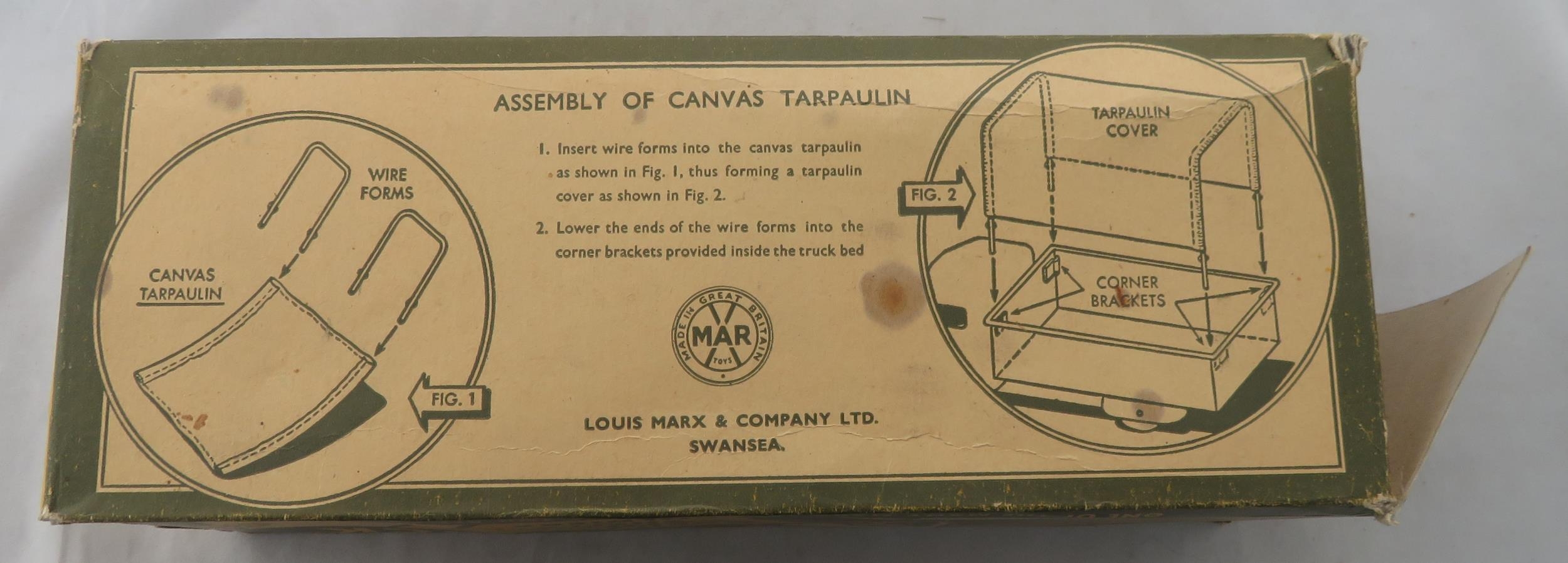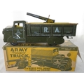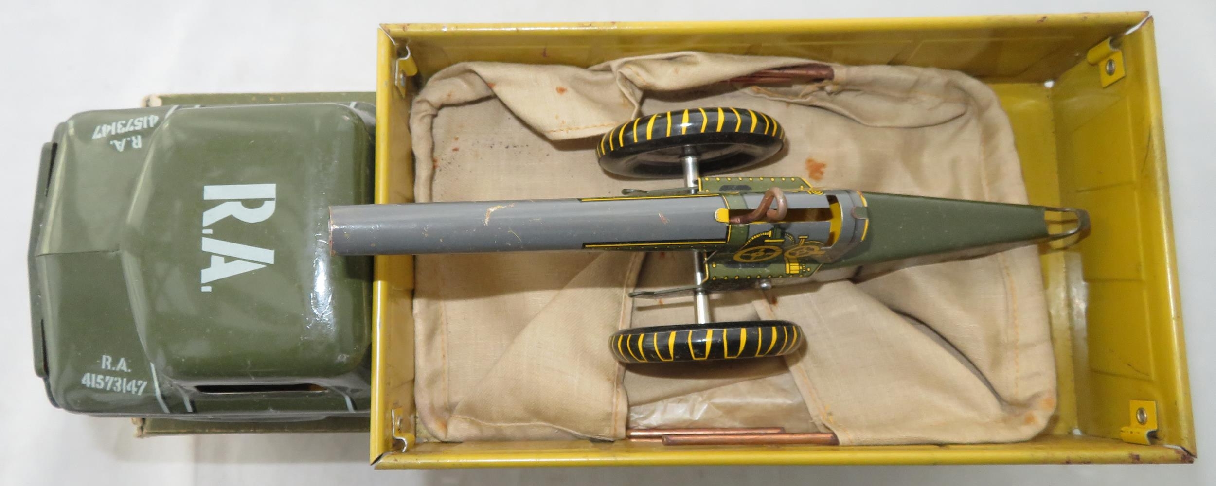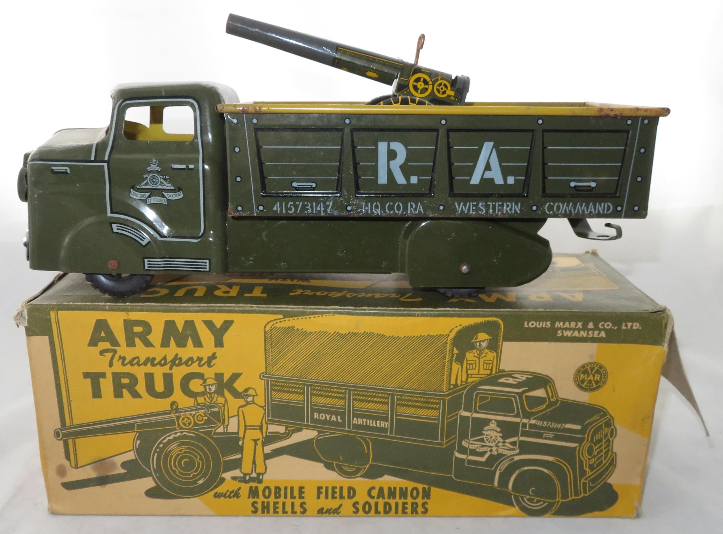 Marx (UK). Army Transport Truck with Mobile Field Cannon, generally excellent (some light surface corrosion) in good plus pictorial box, with Royal Artillery tinplate truck, beige canvas tilt and copper-finish frame, RA marking to sides, rubber wheels, tin-printed spring loaded cannon with silver painted wood shells (5) and plastic soldier figures (5-4 poses). Contents appear complete but unchecked. Viewing recommended. (B)