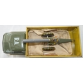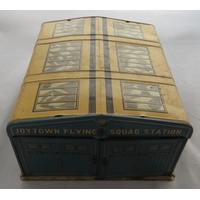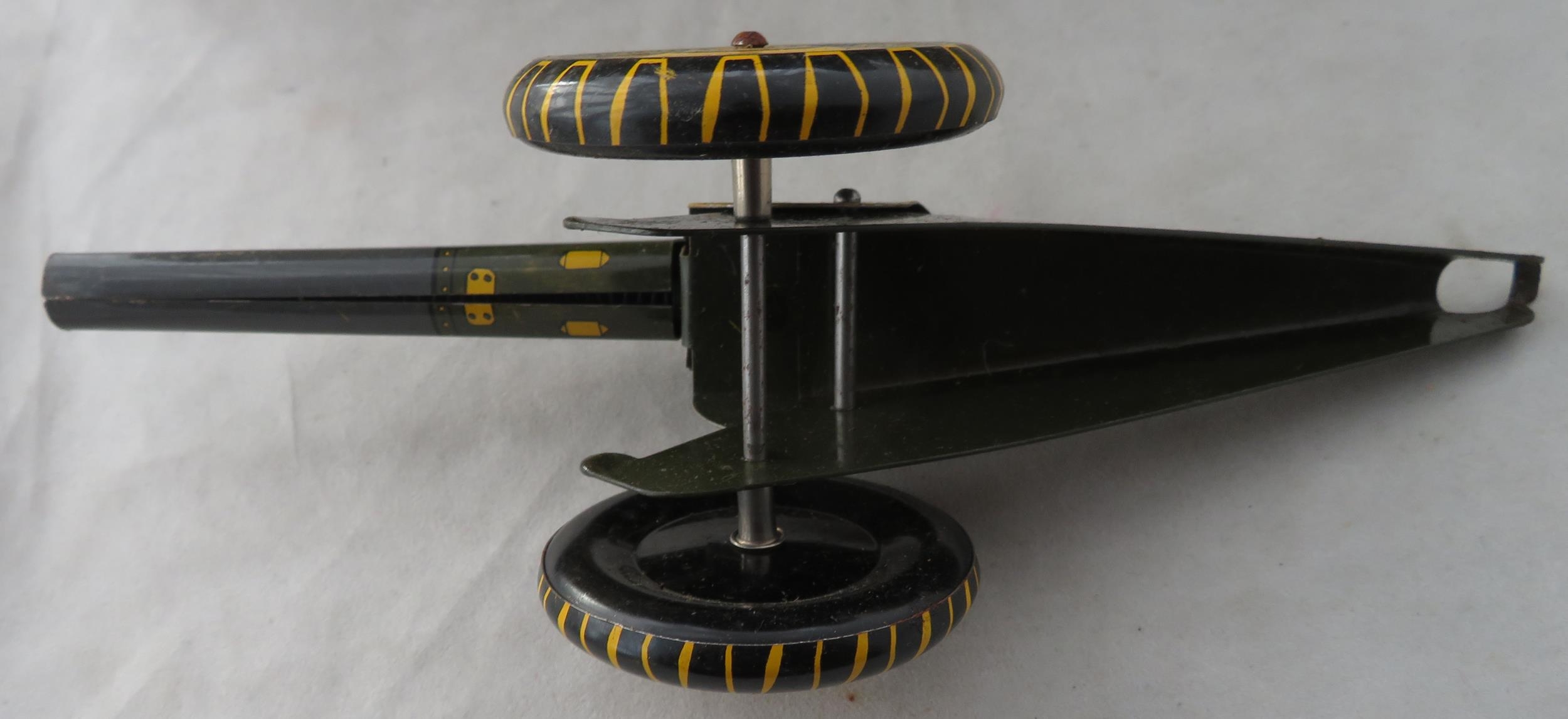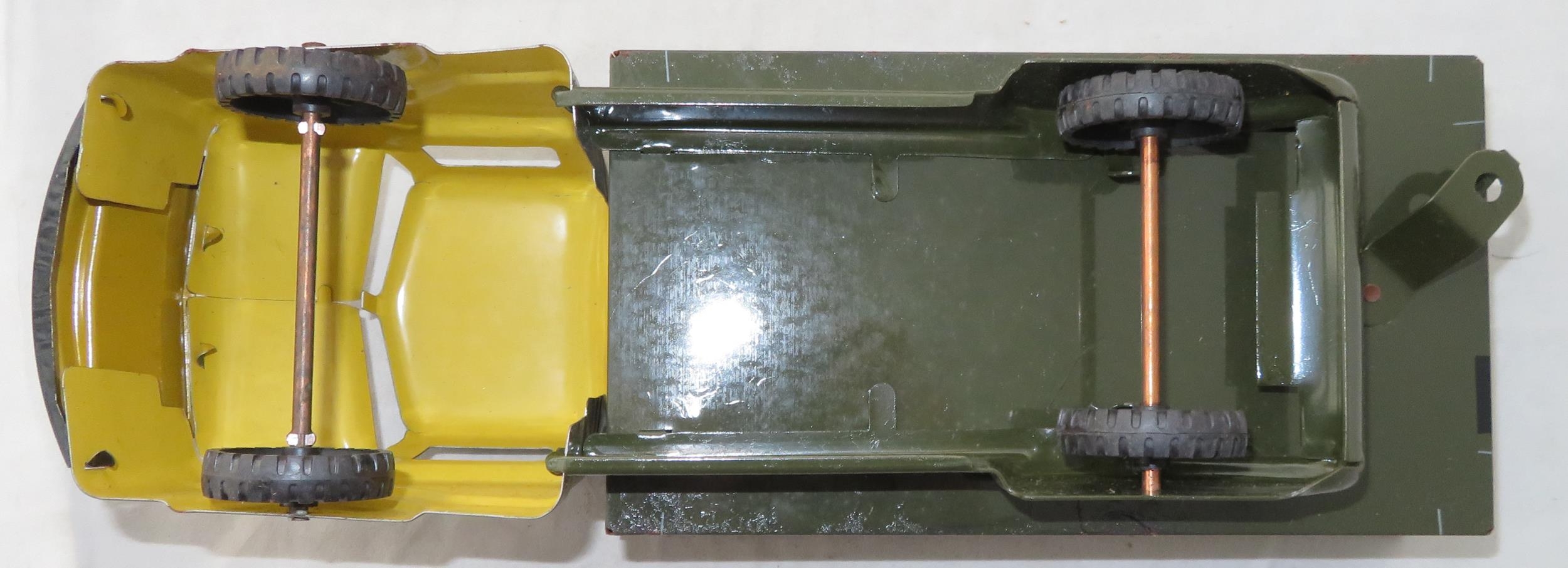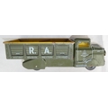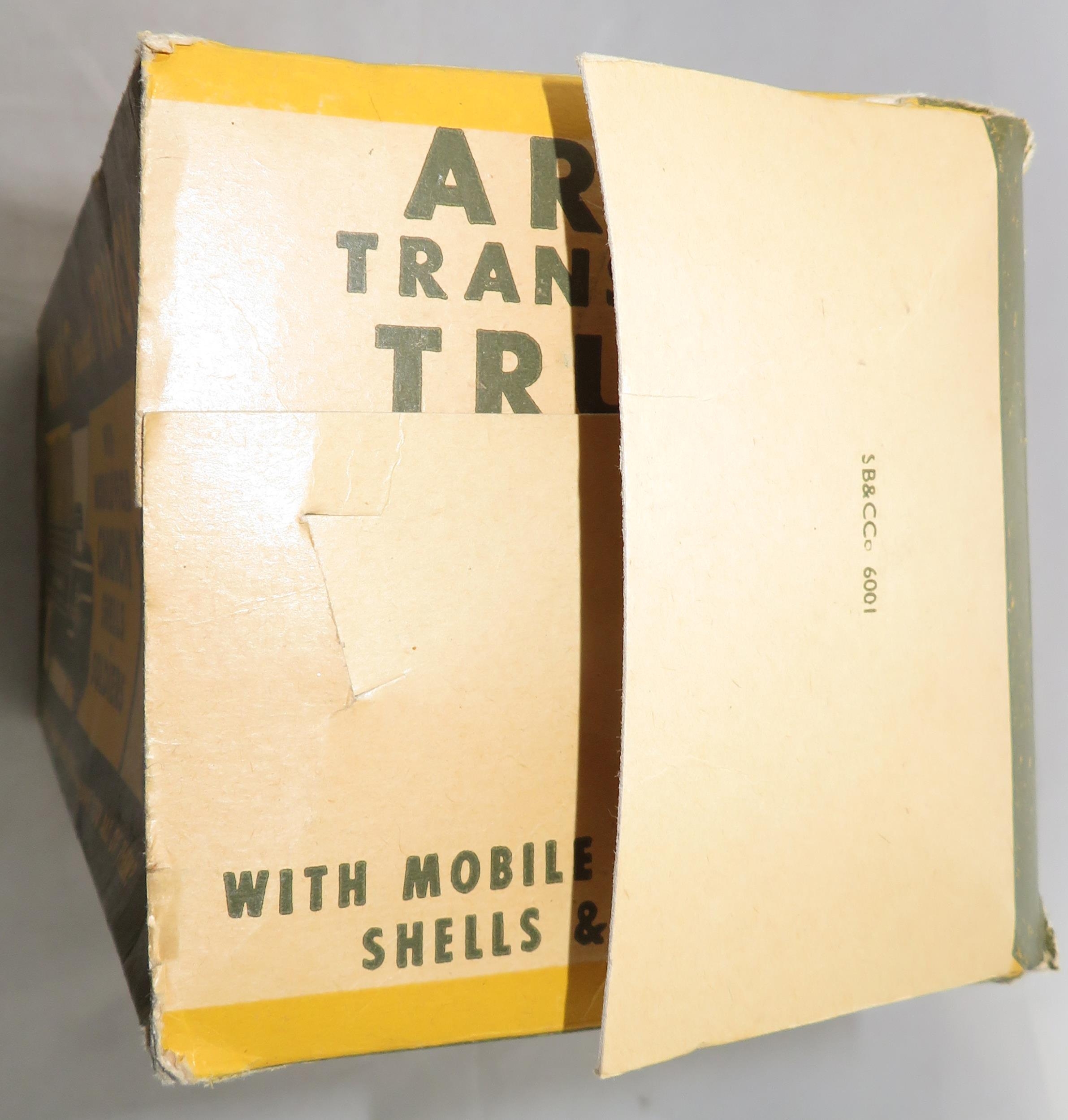 Marx (UK). Army Transport Truck with Mobile Field Cannon, generally excellent (some light surface corrosion) in good plus pictorial box, with Royal Artillery tinplate truck, beige canvas tilt and copper-finish frame, RA marking to sides, rubber wheels, tin-printed spring loaded cannon with silver painted wood shells (5) and plastic soldier figures (5-4 poses). Contents appear complete but unchecked. Viewing recommended. (B)