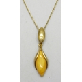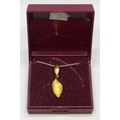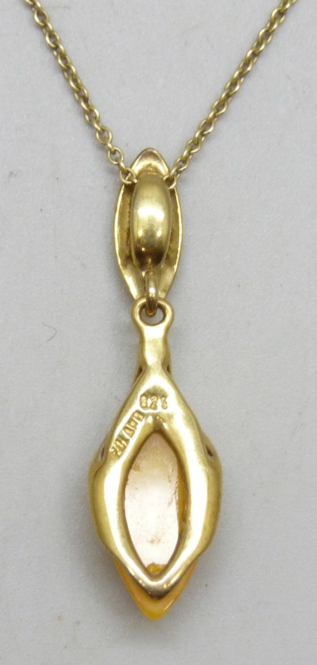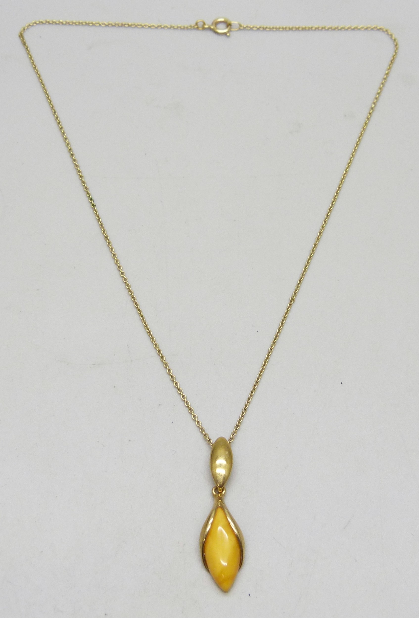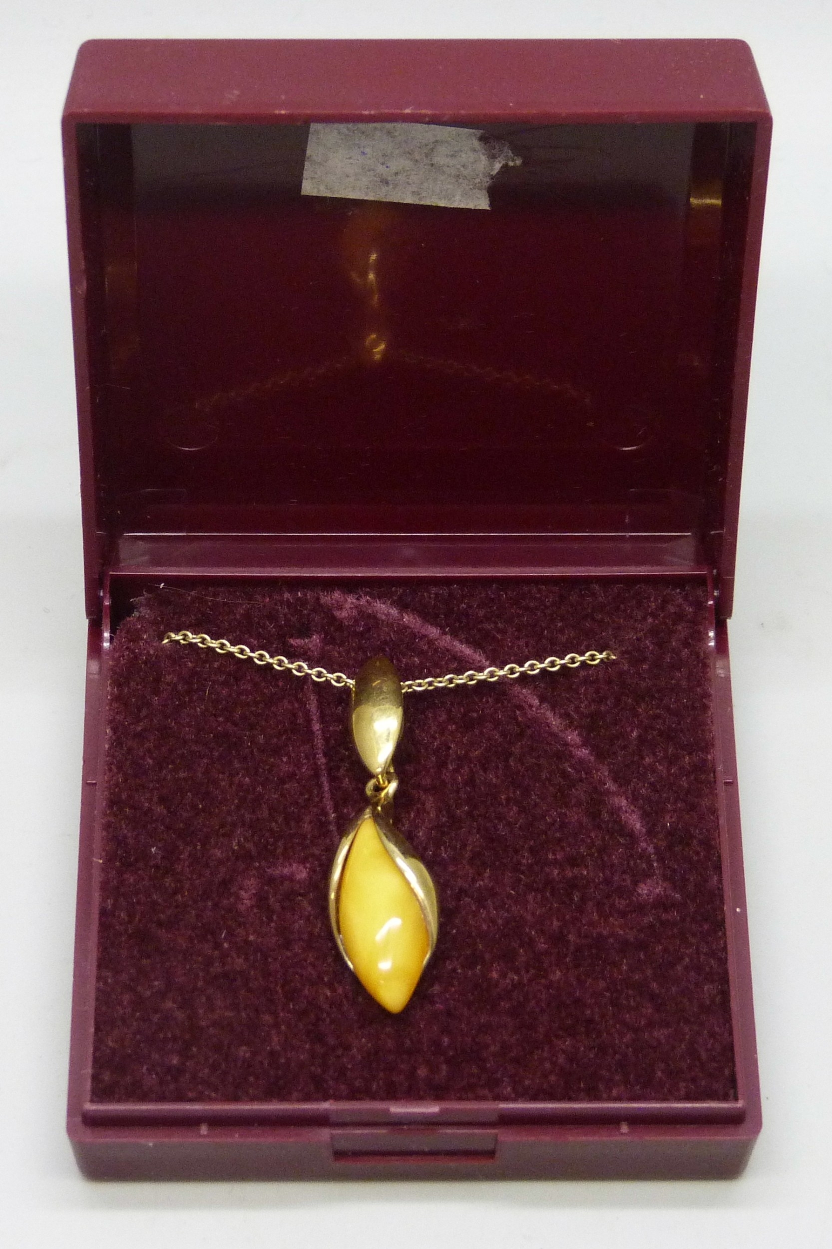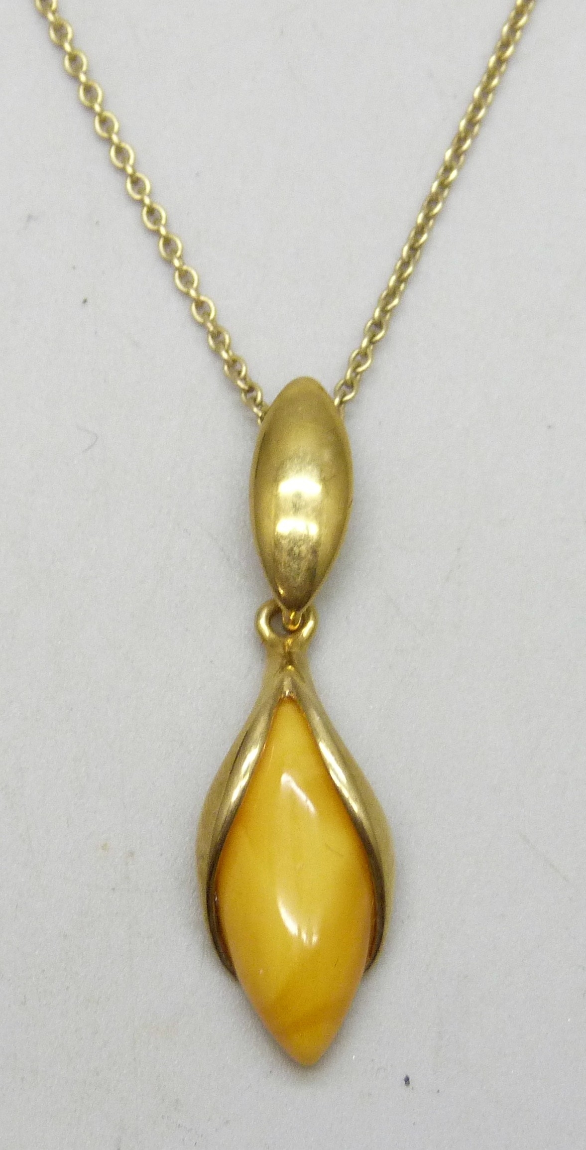 A silver gilt egg yolk amber pendant, 3.5cm, on a gilt chain, boxed