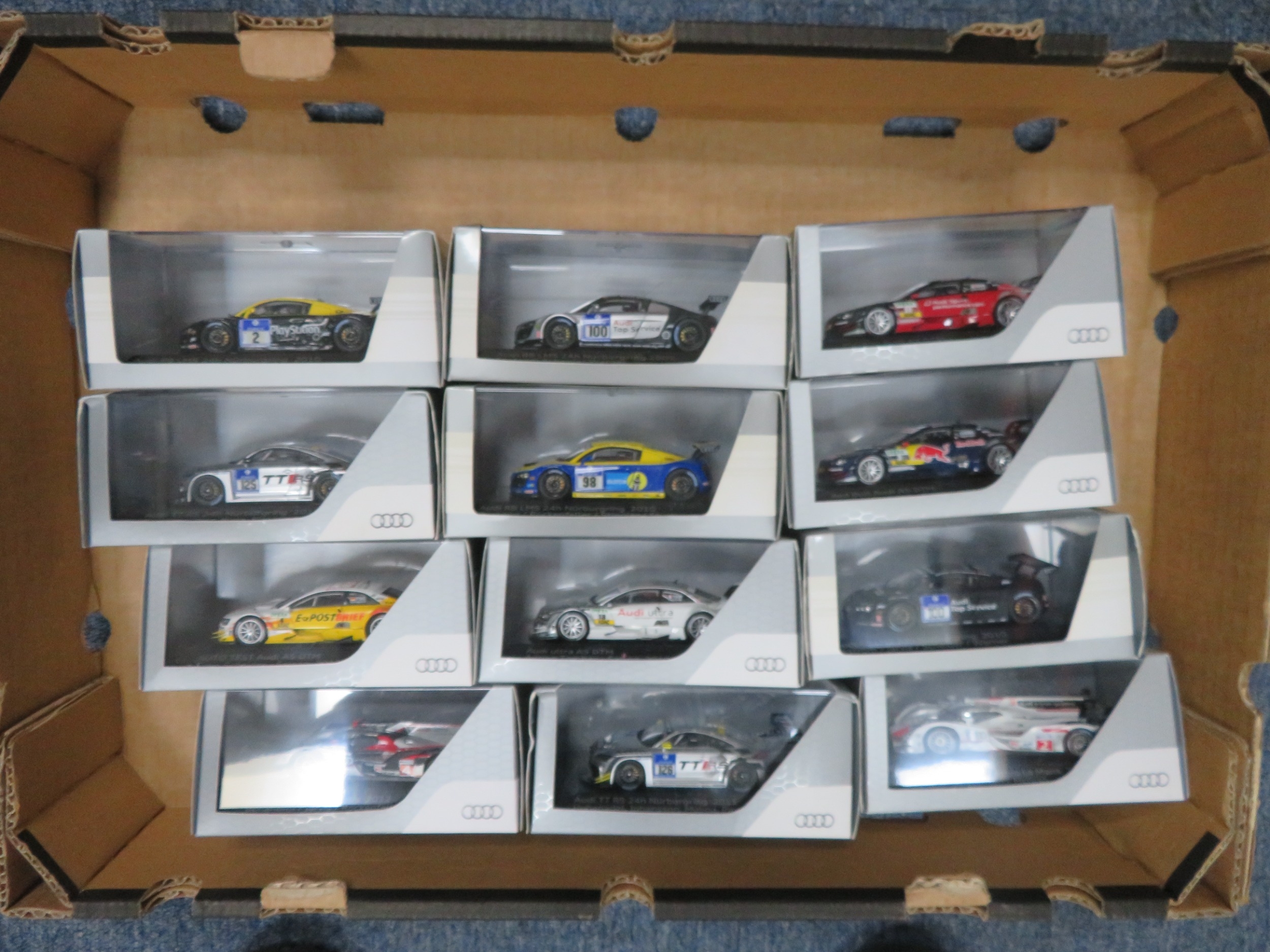 Audi Collection 1/43rd scale motorsport collection, official licensed models, generally excellent in excellent to good plus plastic cases and card outer sleeves, including A5, TT RS, R18, etc. Contents appear complete but unchecked. Viewing recommended. Qty 12