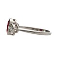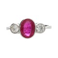 Attractive modern platinum diamond and glass-filled ruby three stone ring, the oval centre stone with round brilliant-cut diamonds to either side, 0.40ct approx in total, clarity SI, colour K/L, width 9mm, 3.4gm, ring size O