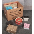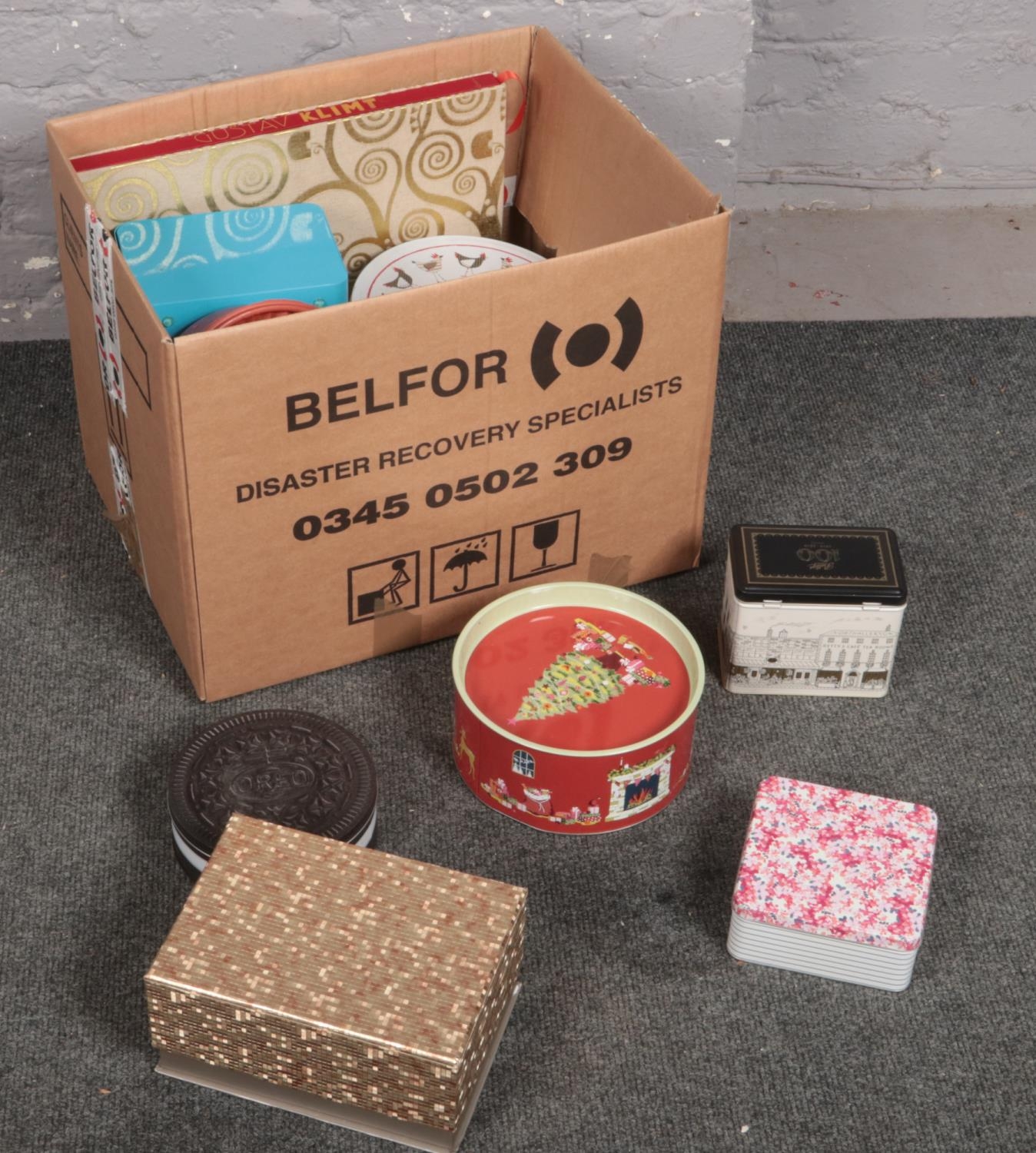 A box of mostly advertising tins.