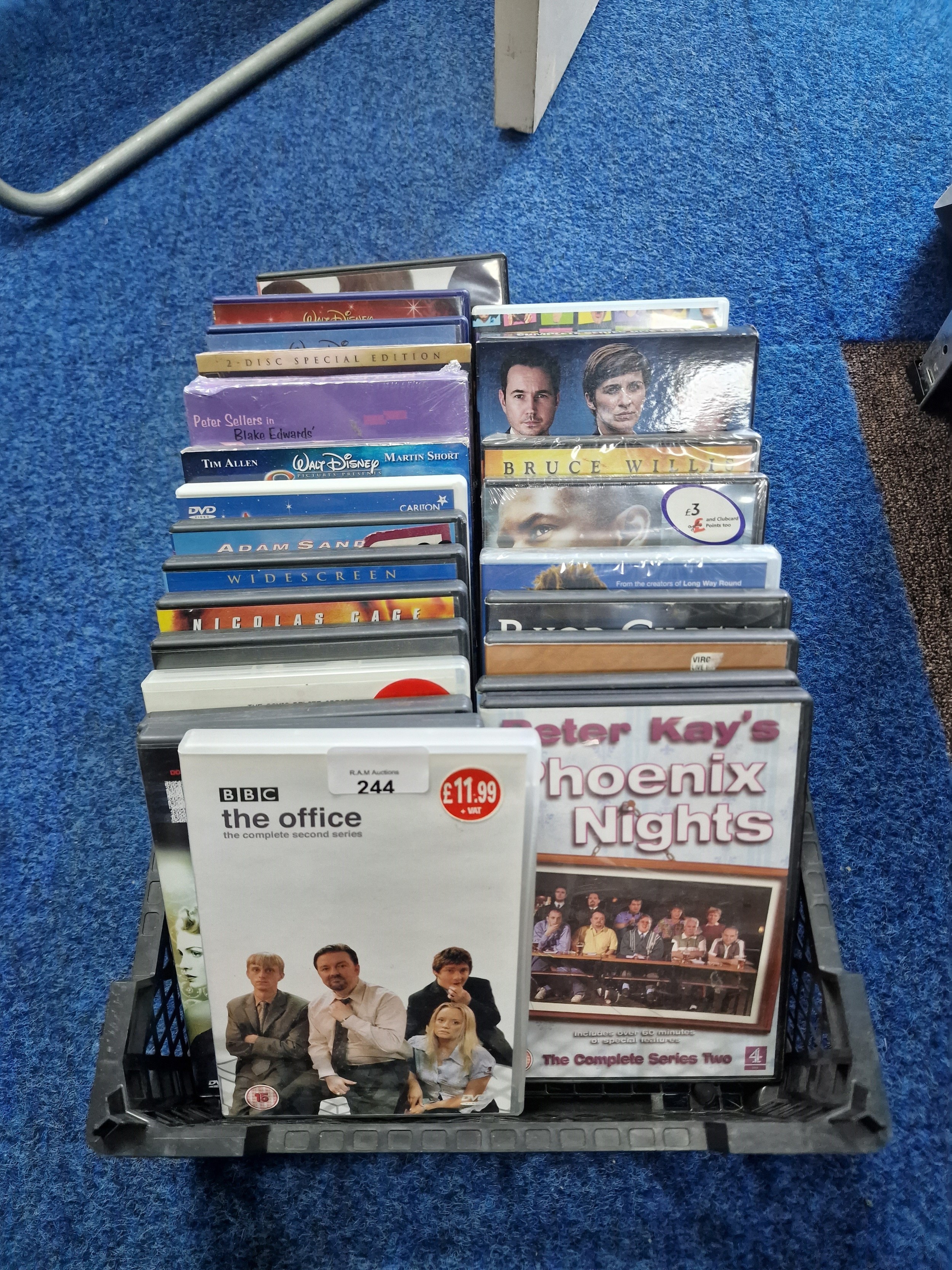 Tray Of 25 DVD's To Include Disney, The Office, Little Britain, Peter Kay Etc.