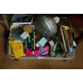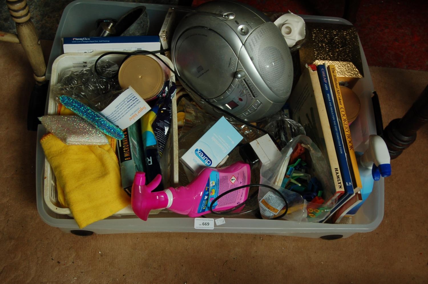 BOX OF BOOKS, CLEANING ITEMS AND RADIO