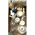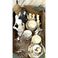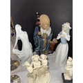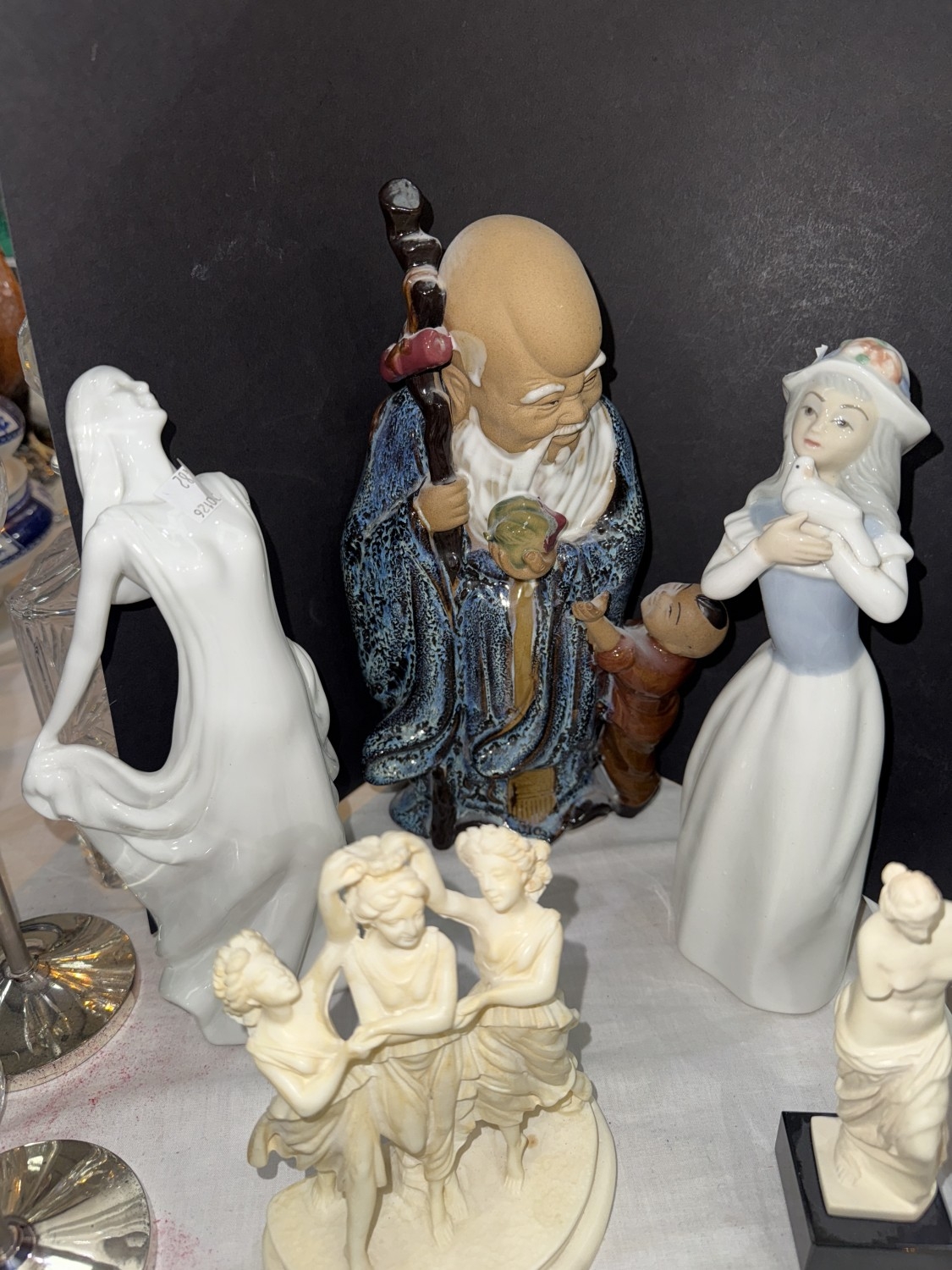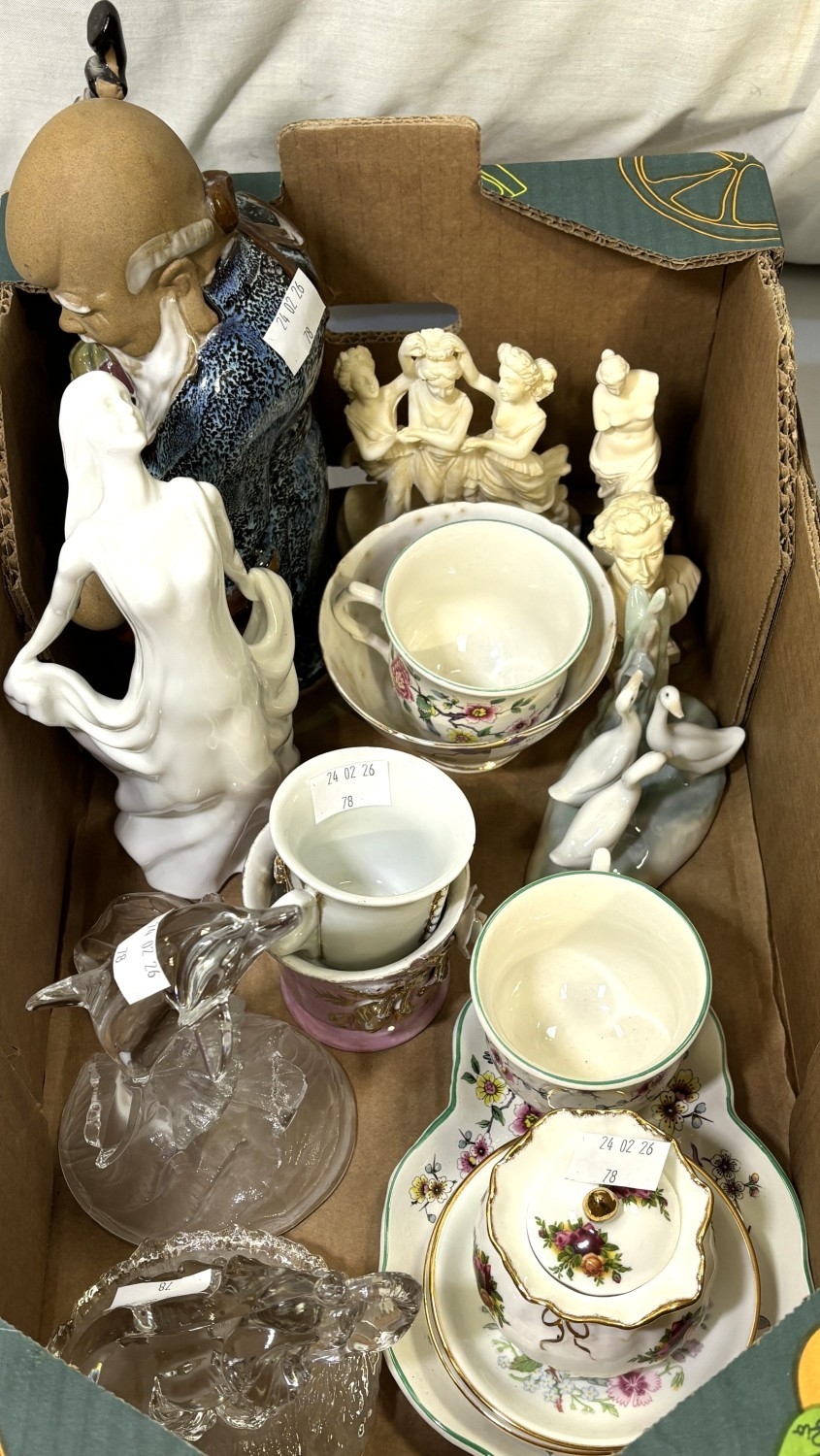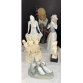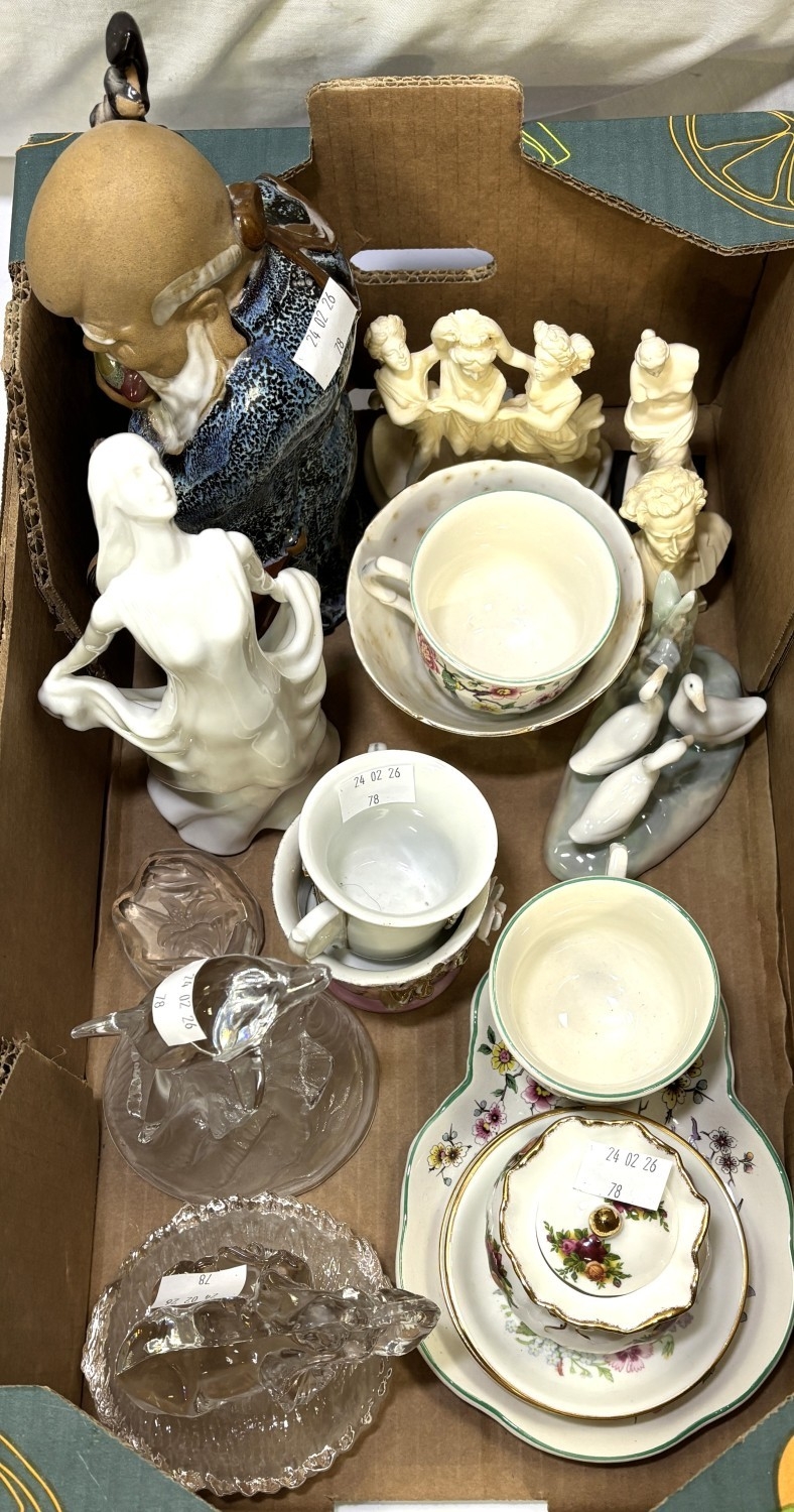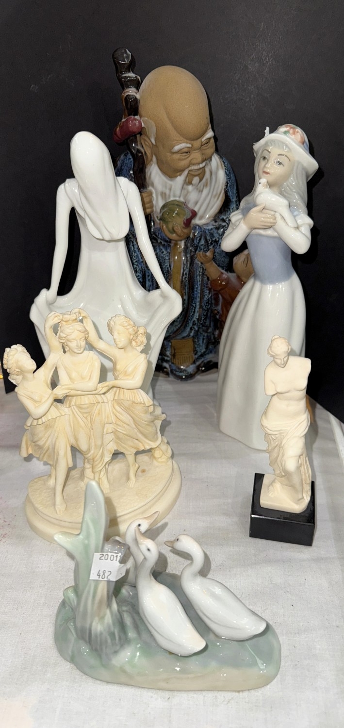 A Chinese figure of a Sage with a small child; glass animal figures, Nao ducks and similar figures.