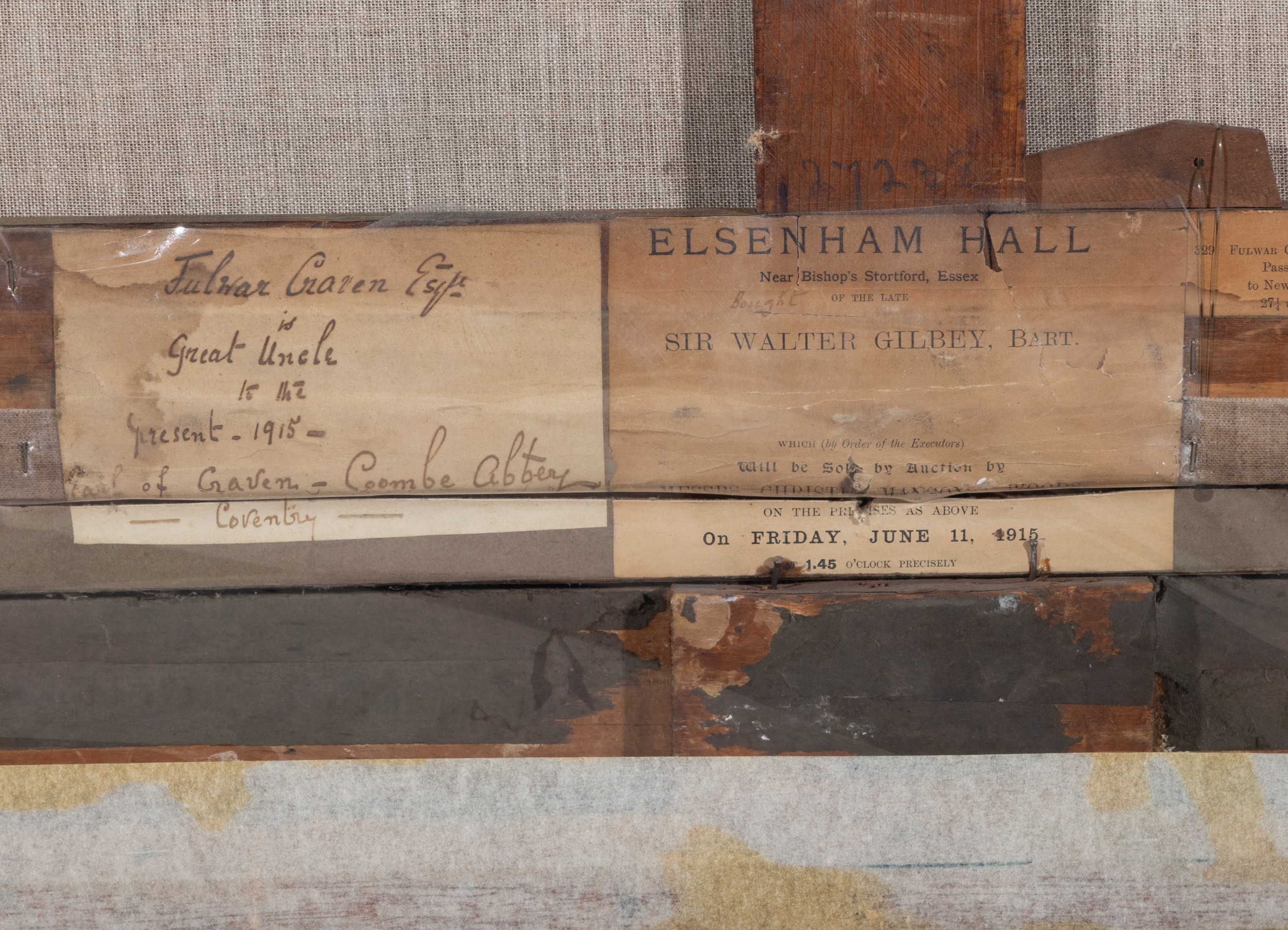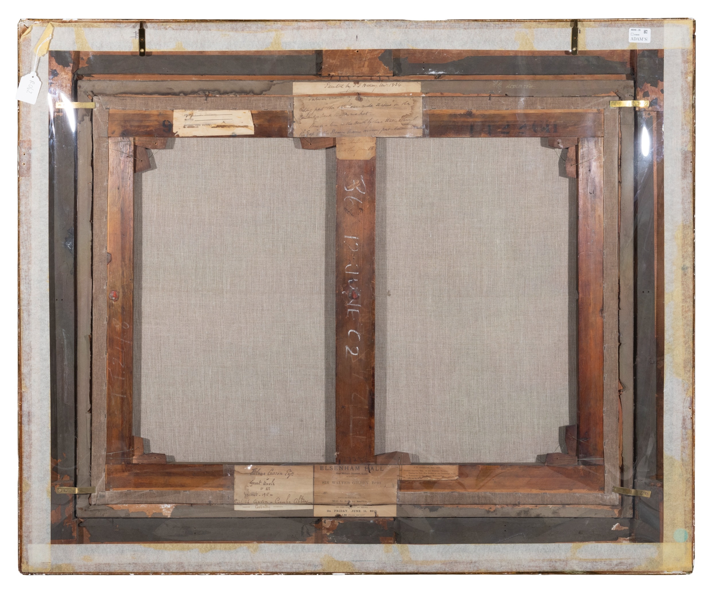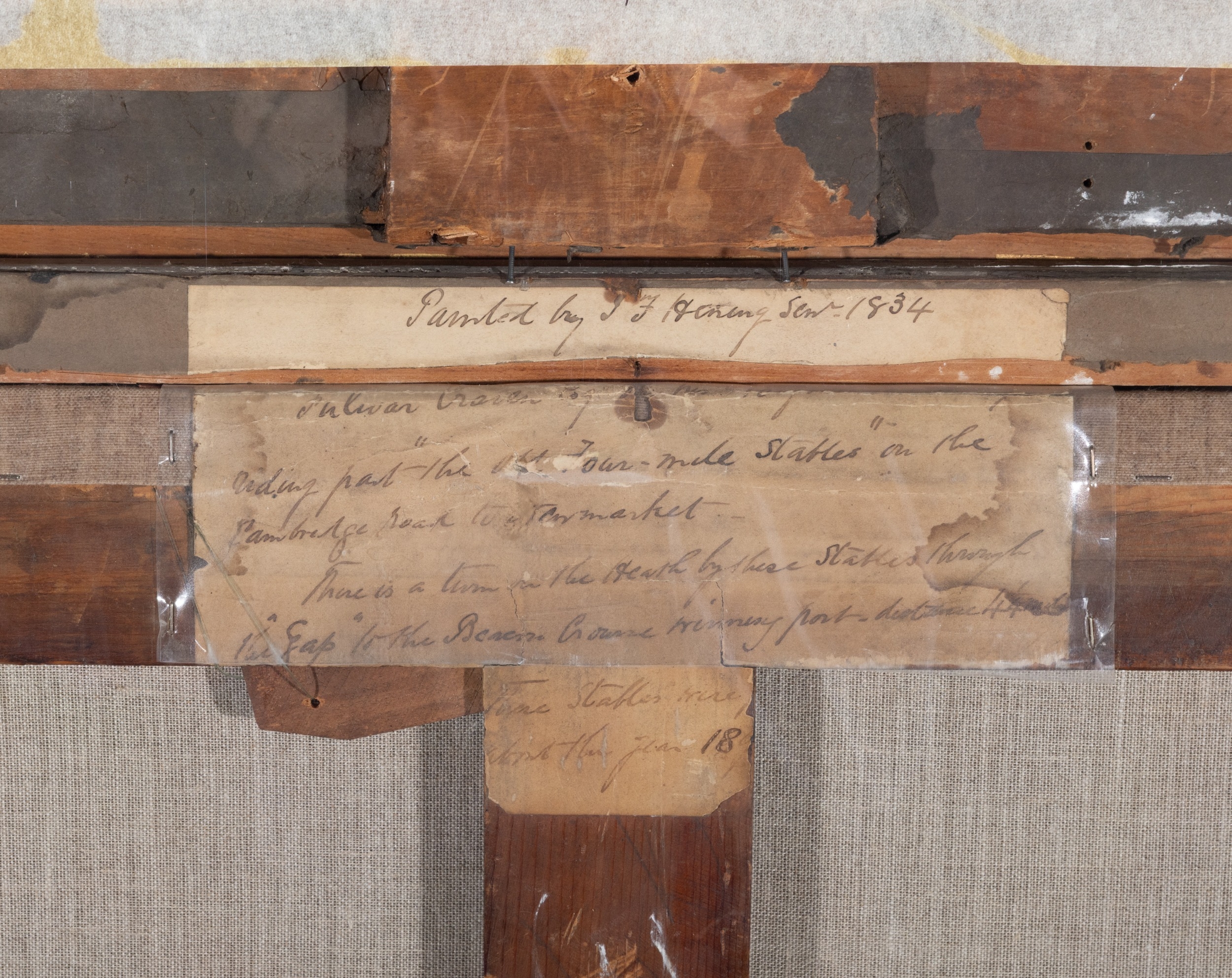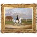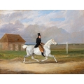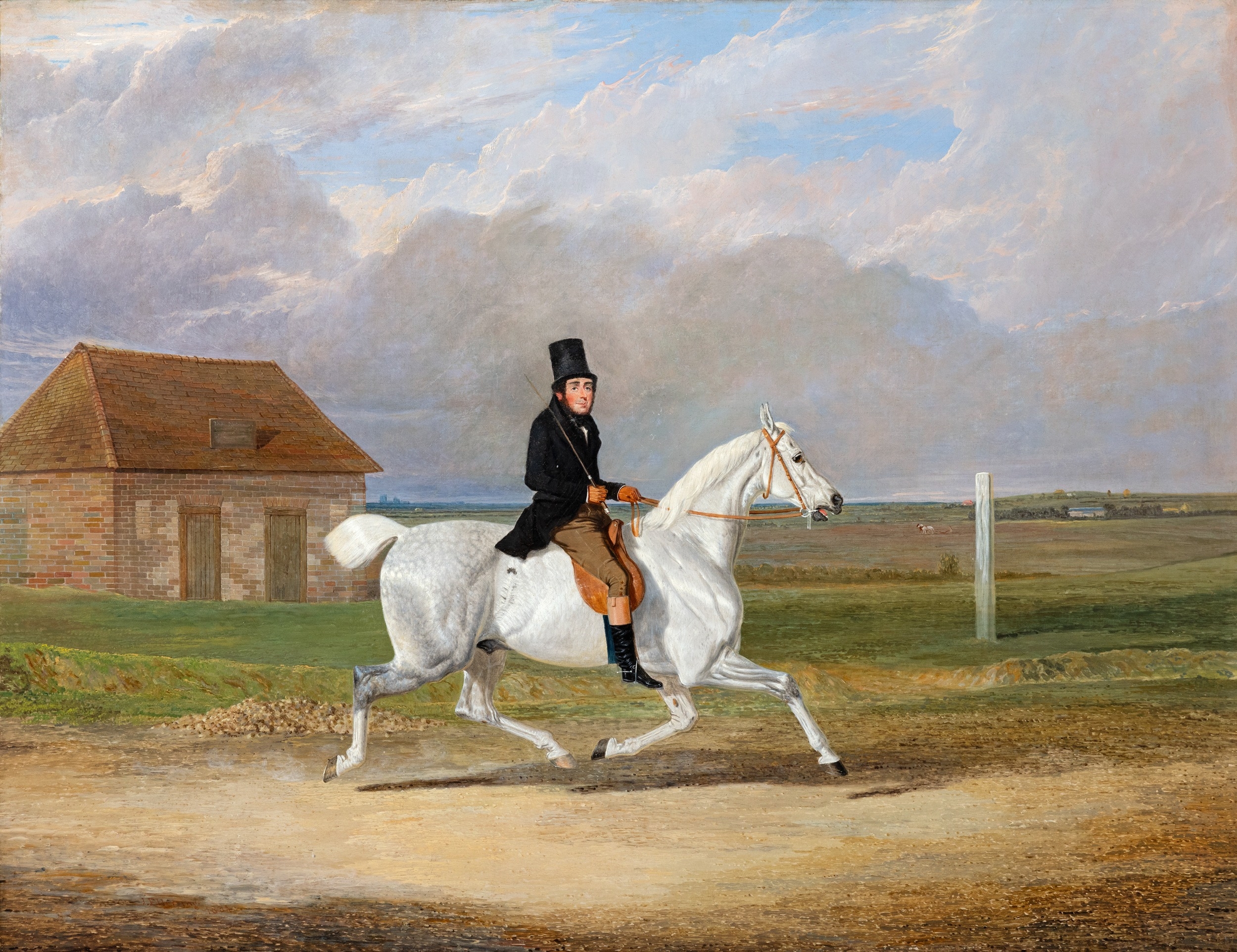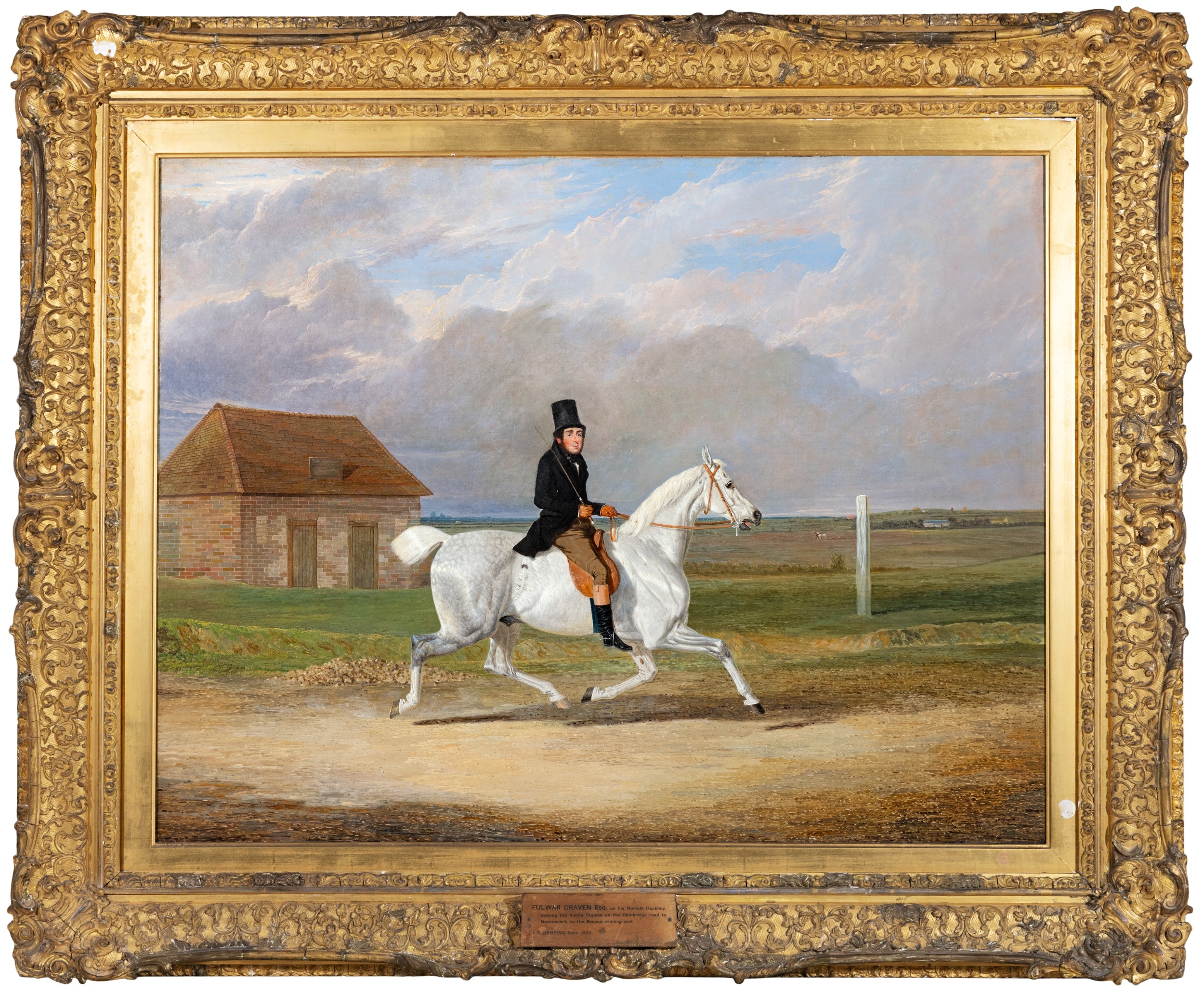 JOHN FREDERICK HERRING, SEN. (1795-1865) Fulwar Craven Esq. (1782-1860), mounted on his Norfolk Hackney, passing the Four Mile Stables on the Cambridge Road to Newmarket, to the beacon winning post signed and dated 'J.F. Herring./ 1834'. (lower left) Oil on canvas 69 x 89.5 cm Provenance: Sir Walter Gibney, 1st Bt., of Elsenham Hall, Essex; Christies's, London, 11 June 1915, lot 329 (75 gns. to Ackerman); almost certainly William Westenra, 6th Baron Rossmore (1892-1958), Rossmore Castle, Co. Monaghan, moved to Camla Vale, Co. Monaghan in the 1940s, thence by descent The subject of this portrait, a Mr Fulwar Craven Esq. of Brockhampton Park held an assured position in aristocratic English society as a well-connected, landed gentleman. Regarded however as a sportsman first and foremost, Craven is depicted astride his grey Norfolk Hackney against the backdrop of the 4-miles stables on the road to Newmarket. Craven was immensely proud of his horses, having sketched a portrait of of his mare Bess, better known as 'The Cow', a portrait currently held in the Royal Collection Trust. Fulwar Craven appears himself as a foppish raven-haired and pigeon-chested bloodstock owner 'The Craven' in a series by Richard Dighton (1795-1880) – a depiction that when seen alongside Dighton's other lithographs, portrays a man of considerable ostentatious flair and swagger as noted in Taunton's book 'Portraits of Celebrated Racehorses' In all that he did, and all that he said, there was a dry, eccentric humour, which was peculiarly his own, but which never overstepped the bounds of good breeding and kindly feeling…[…]…The tout-ensemble of the man was so remarkable, that it could not fail to attract the general attention of visitors on the course. The careless cock of his battered white hat was in itself all character Taunton, Thomas Henry. Portraits of Celebrated Racehorses of the Past and Present Centuries. Searle & Rivington, London, 1883. Page 422 In Herring's lively portrait here presented, our subject exudes a more restrained appearance, excepting his recognisable tall top-hat. This encourages the viewer to instead admire the profile and muscle tone of his steed in keeping with equine portraits of the time. Craven's commissioned painting was intended to advertise the quality and presentation of the horse as seen in the glossy flank, muscular tone and cropped tail of the animal. The horse is depicted mid-canter during the fleeting moment of suspension where all four hooves are above the ground at once. Herring's depiction of the horse and rider in canter rather than in a stationary posed portrait is an interesting one as it presents Craven as a high society sportsman rather than a gentleman bloodstock owner. In this sense, the horse is presented as of equal importance to its rider, a impressive feat when compared to a man of such an electric impression.
