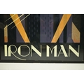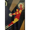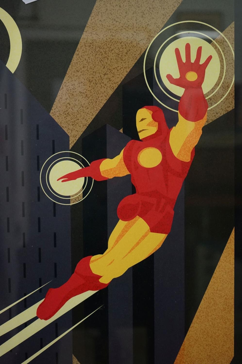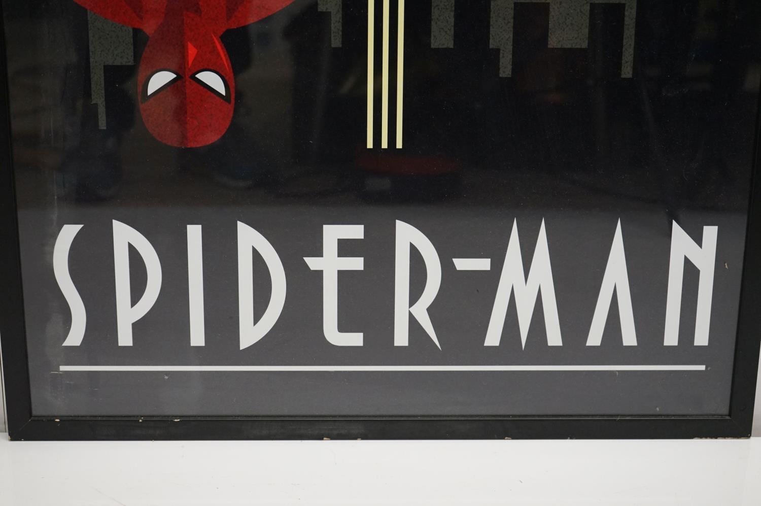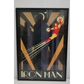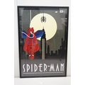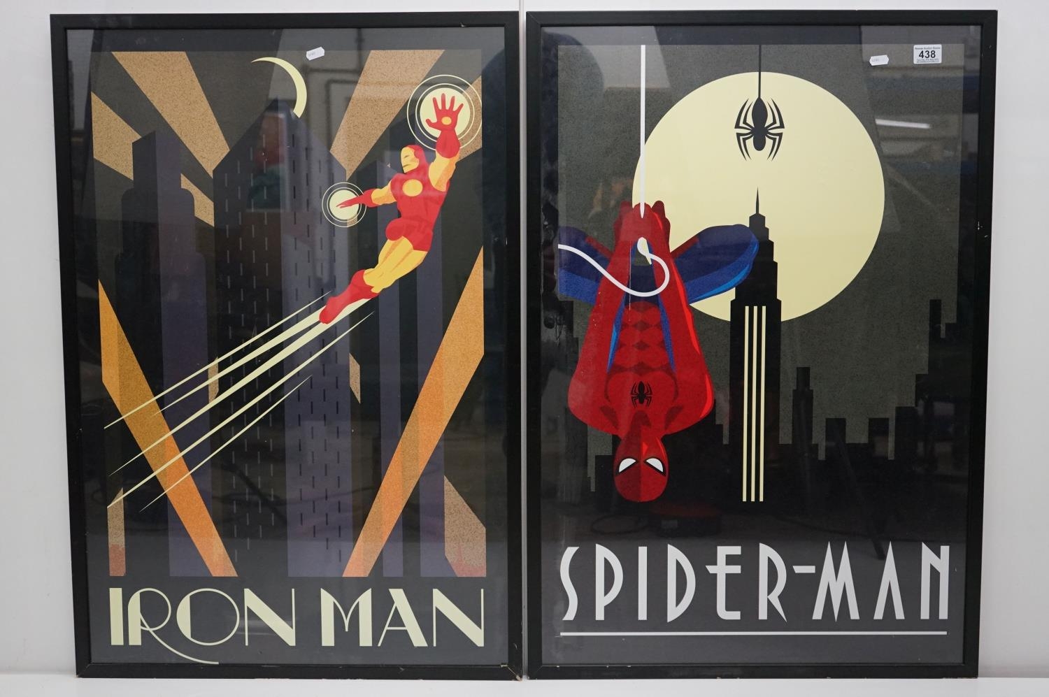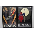 Two Art Deco style Spiderman and Iron Man posters, 89 x 60cm, framed and glazed