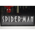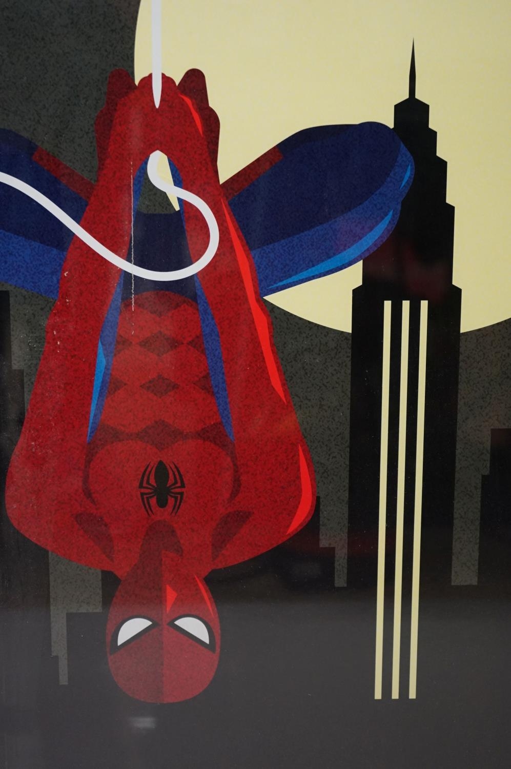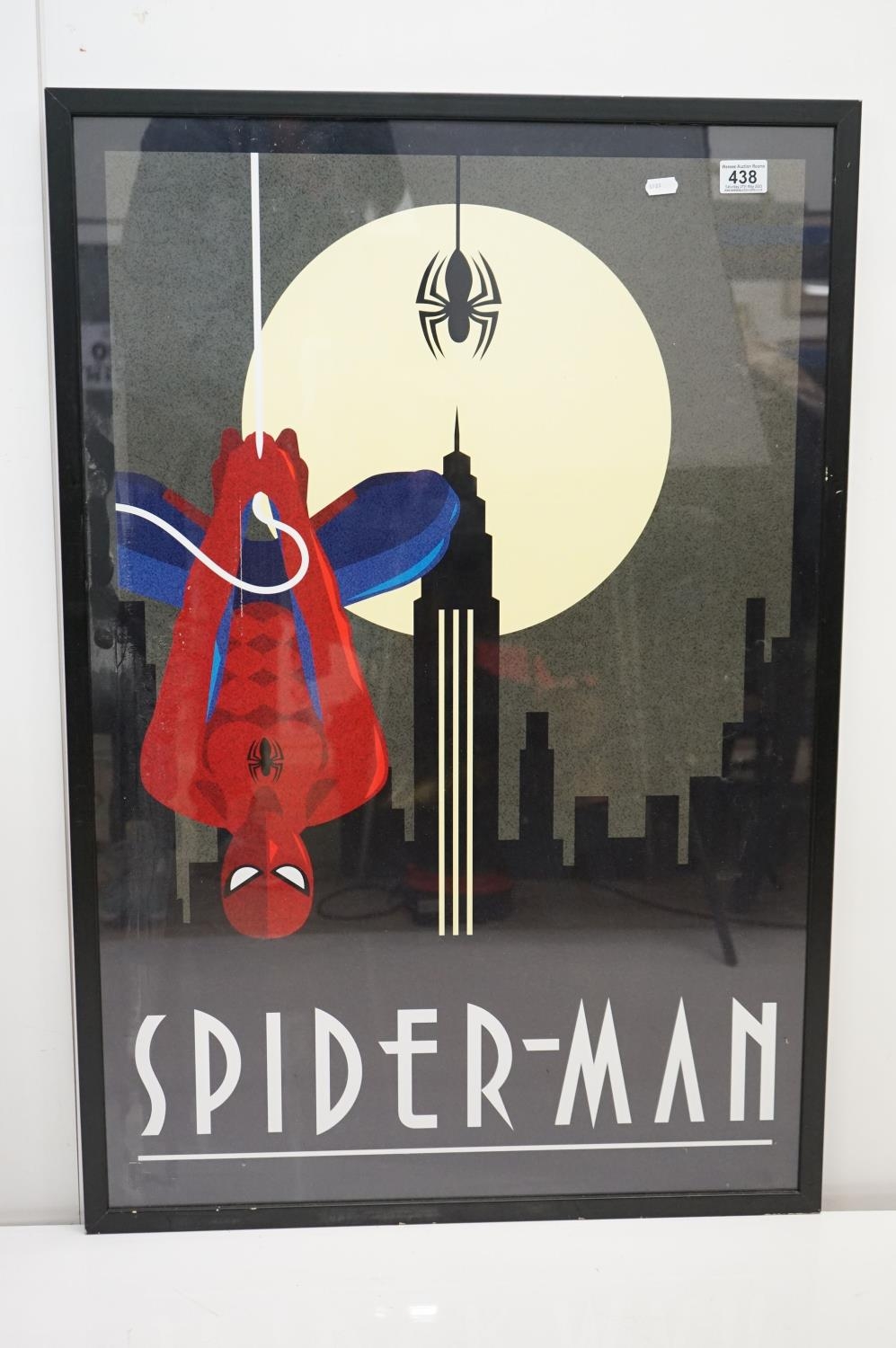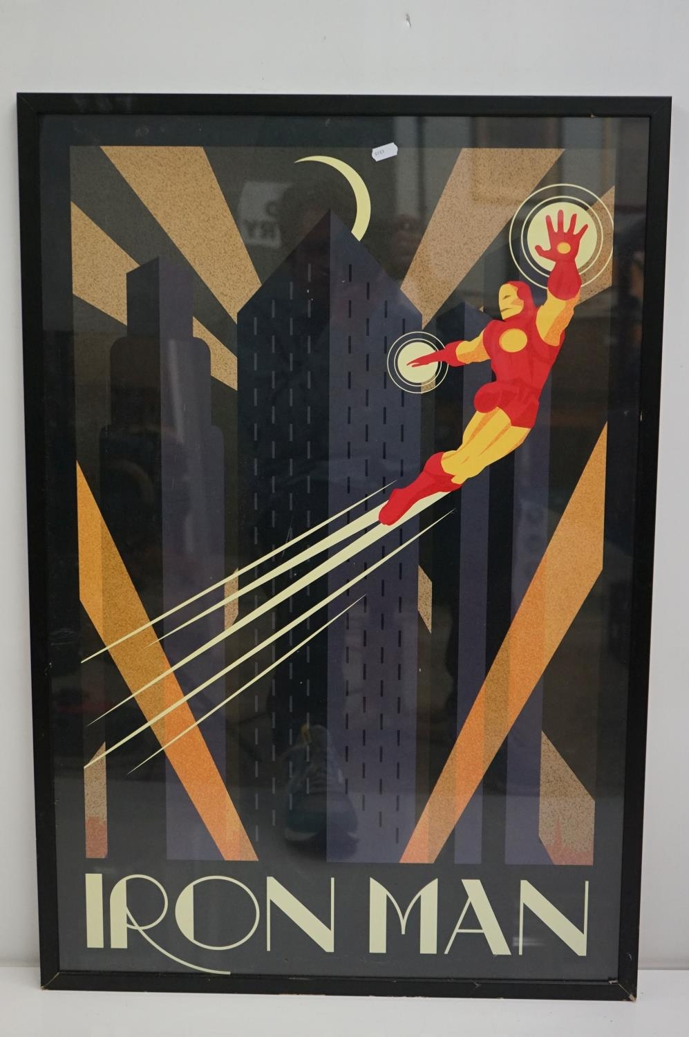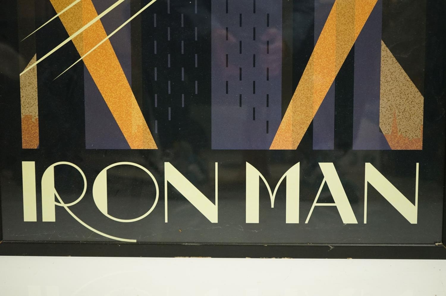Two Art Deco style Spiderman and Iron Man posters, 89 x 60cm, framed and glazed