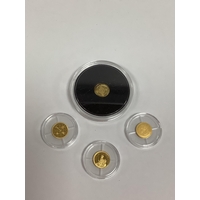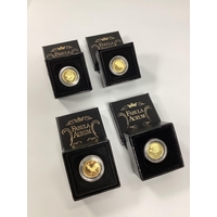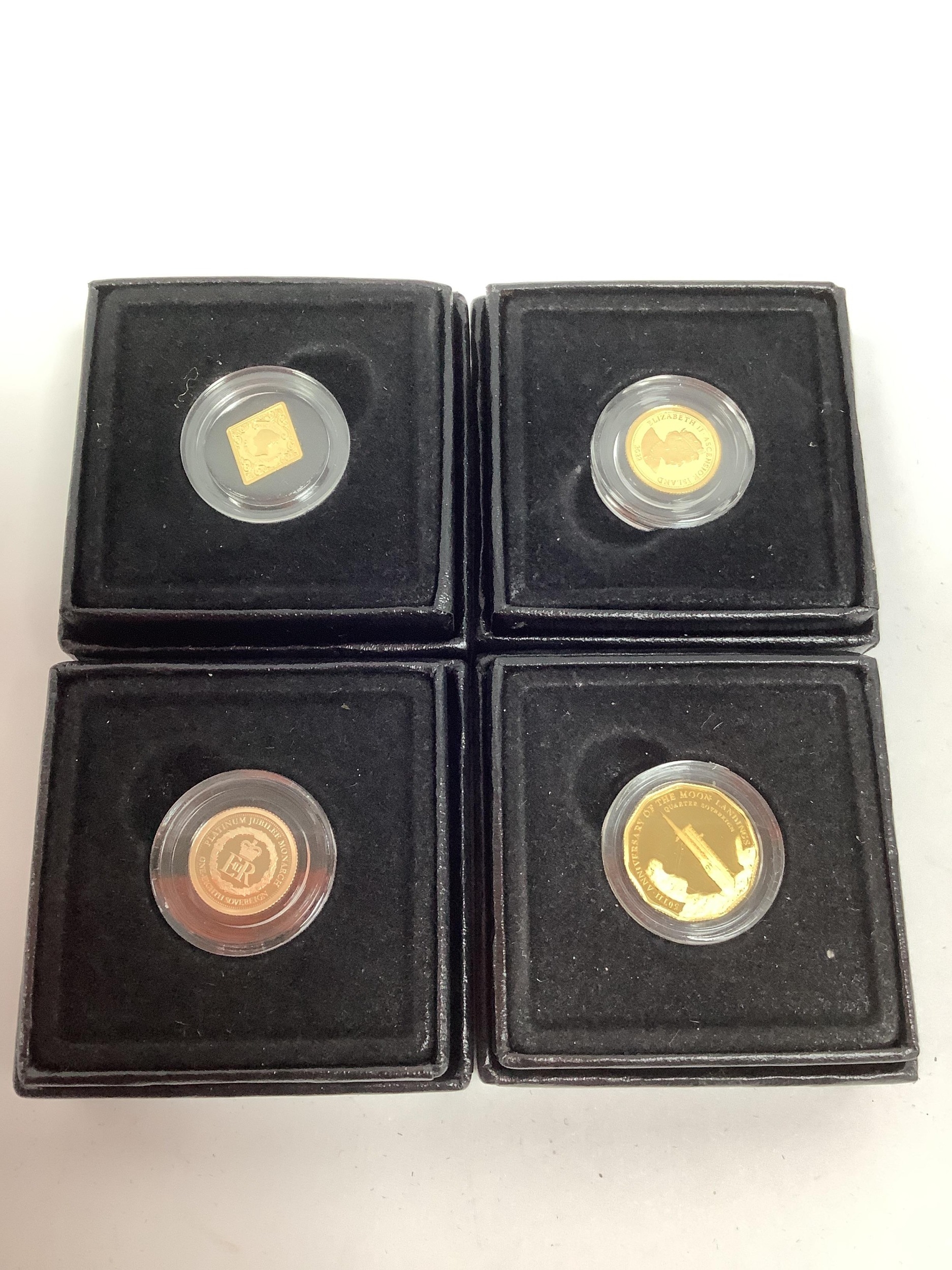 Four Hattons Of London Commemorative Gold Coins, includes two Tristan Da Cunha 1/8th Sovereigns, Ascension Island 1/8th Sovereign and an East Caribbean States quarter Sovereign.