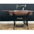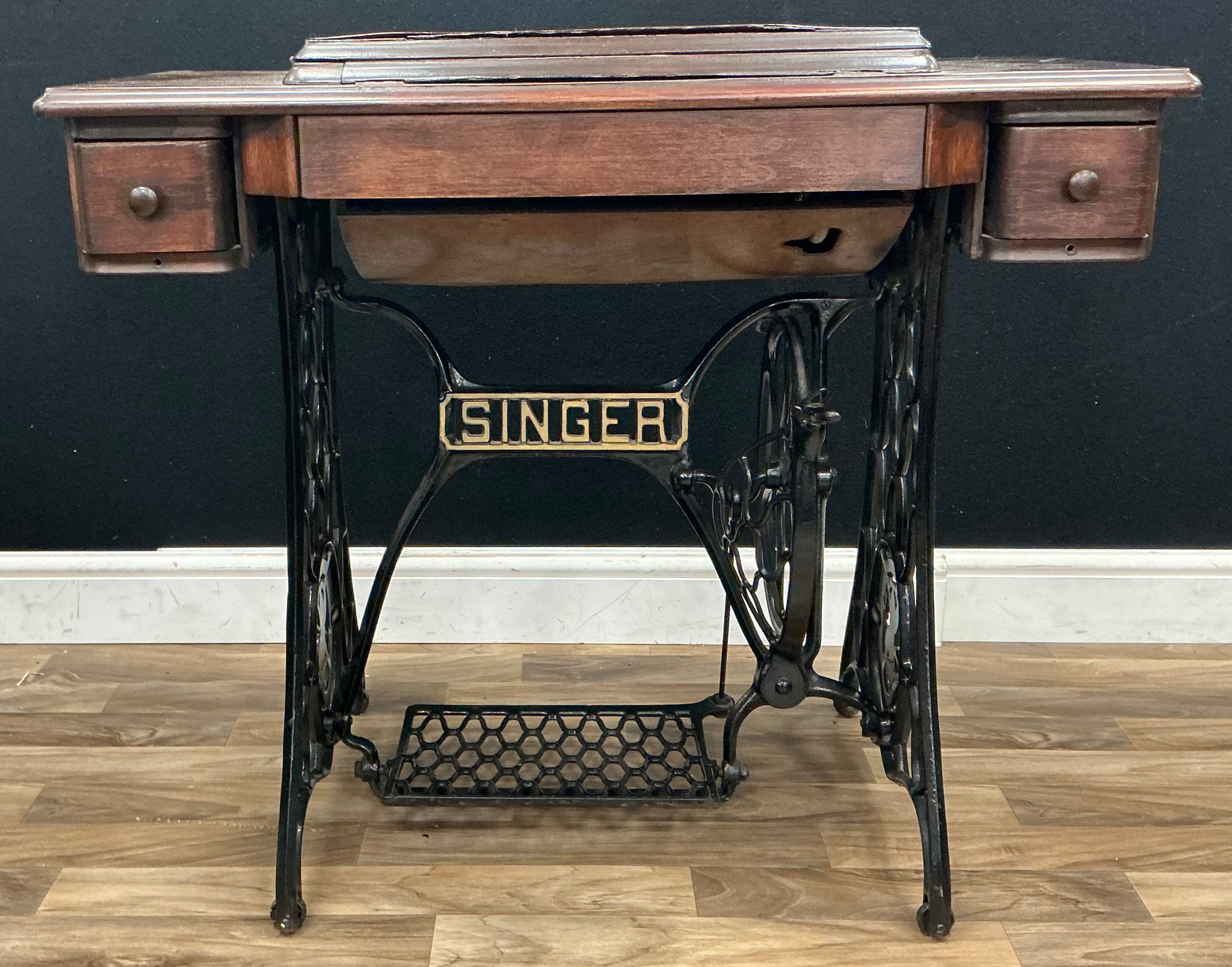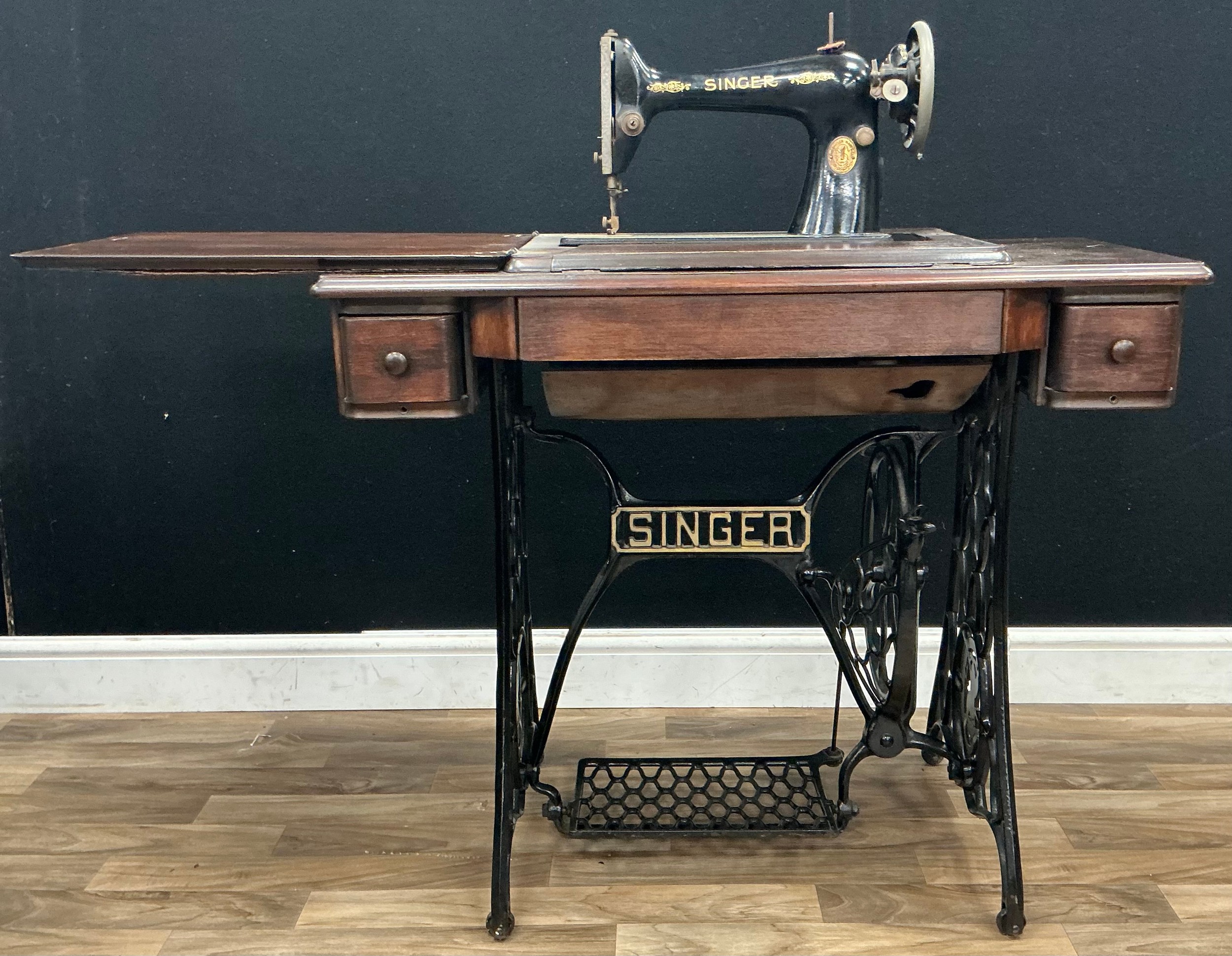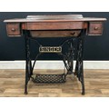 A treadle Singer sewing machine, with an oak and cast iron table base, 77cm high.