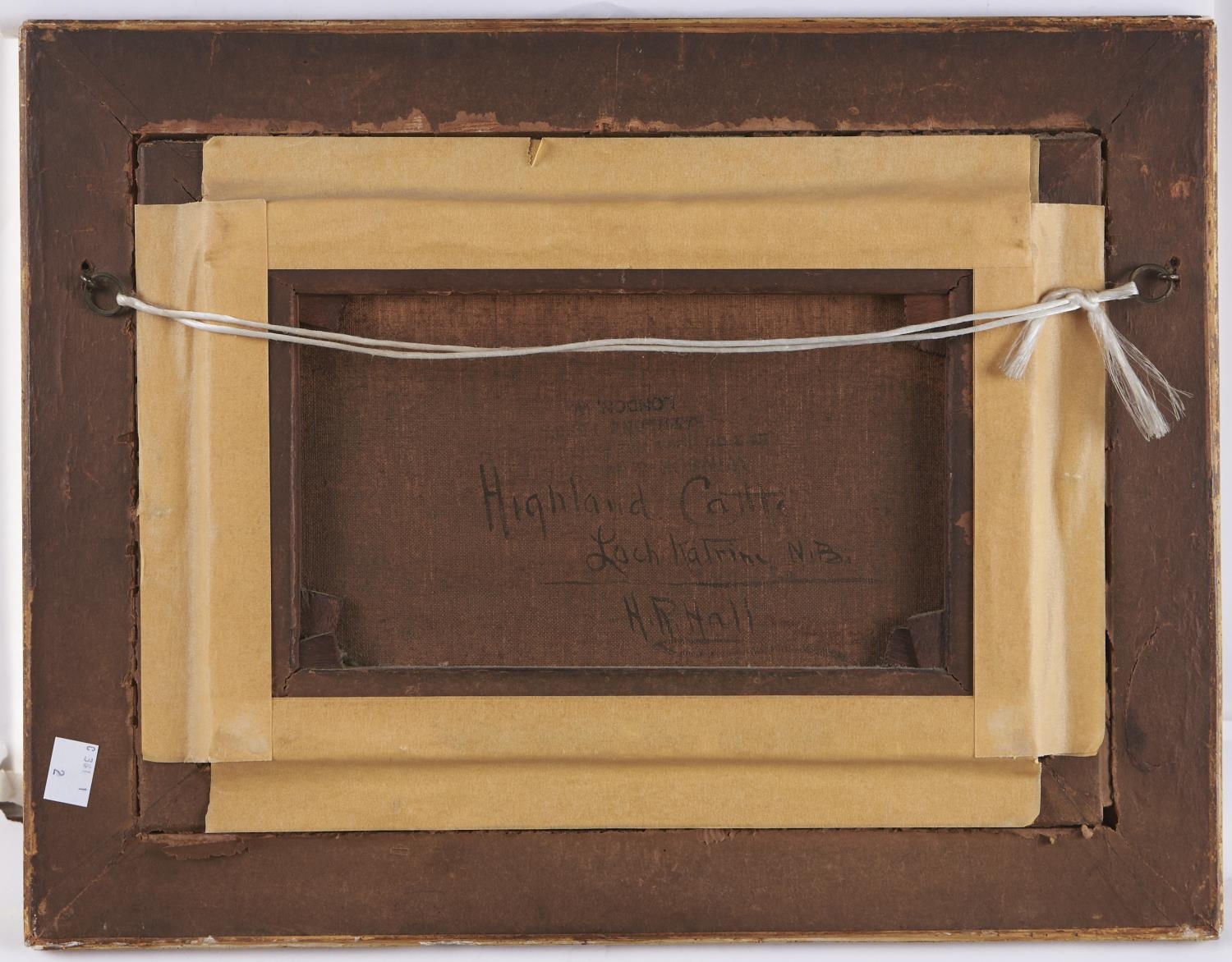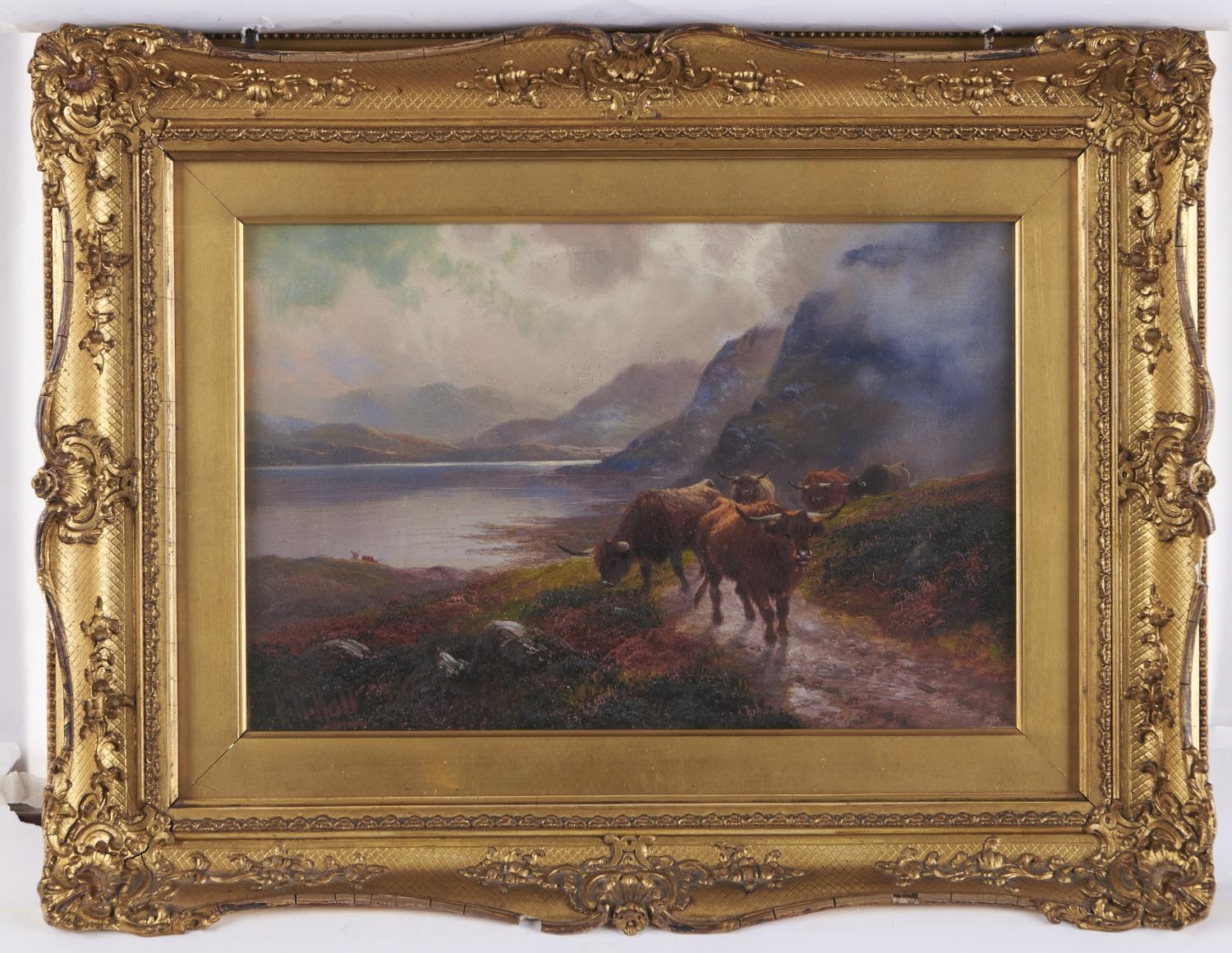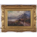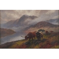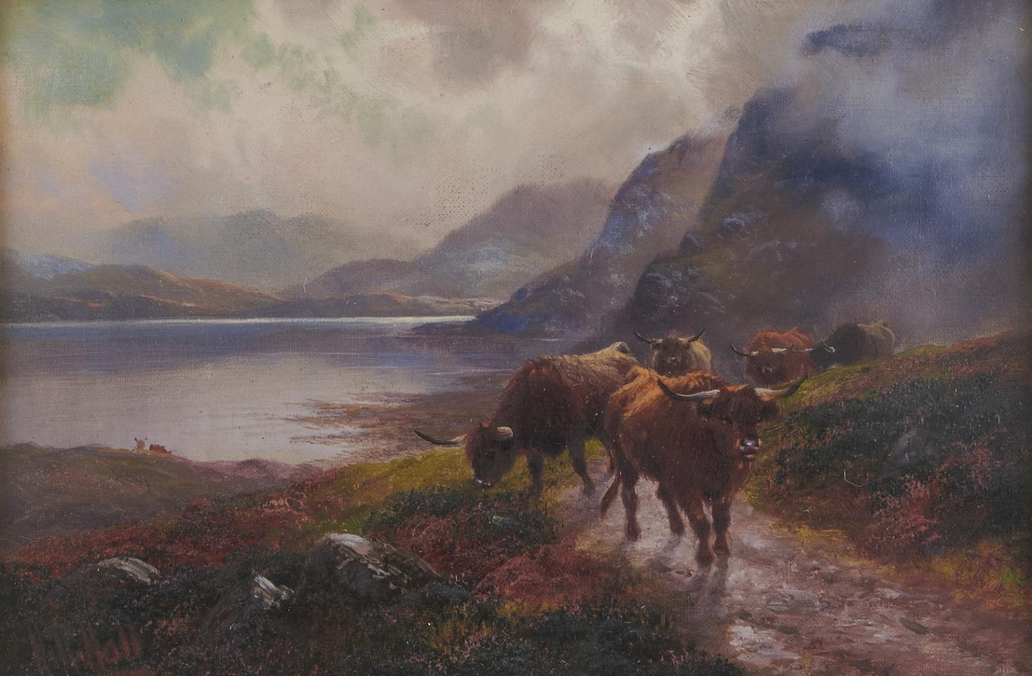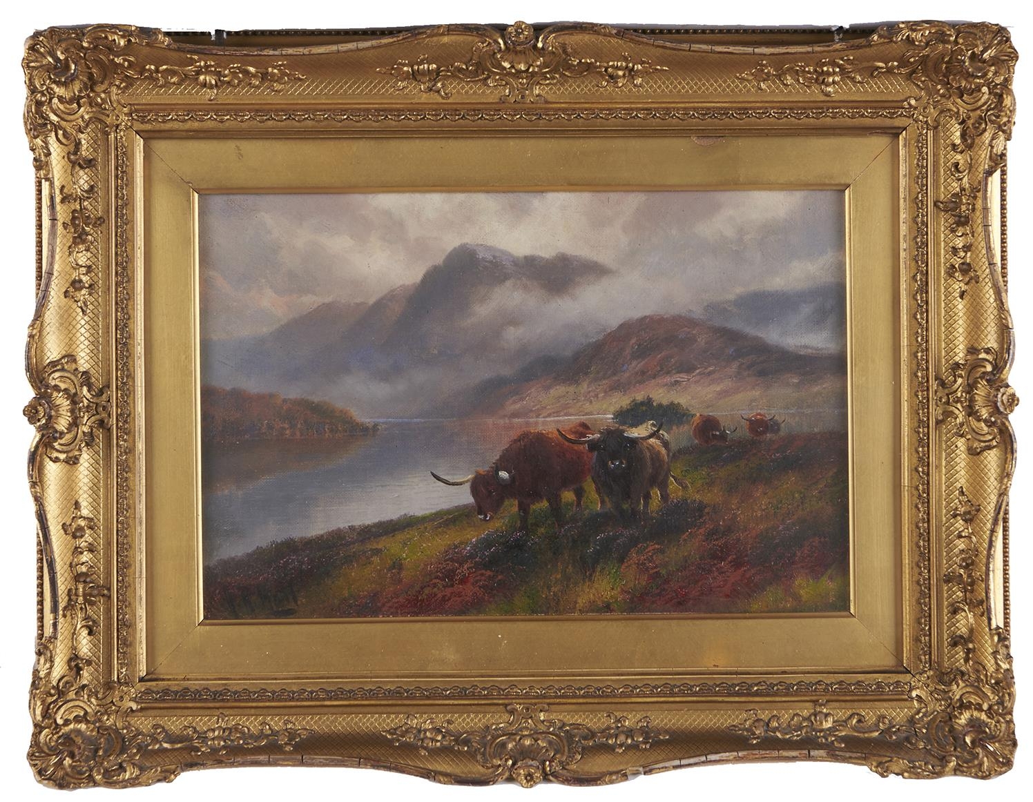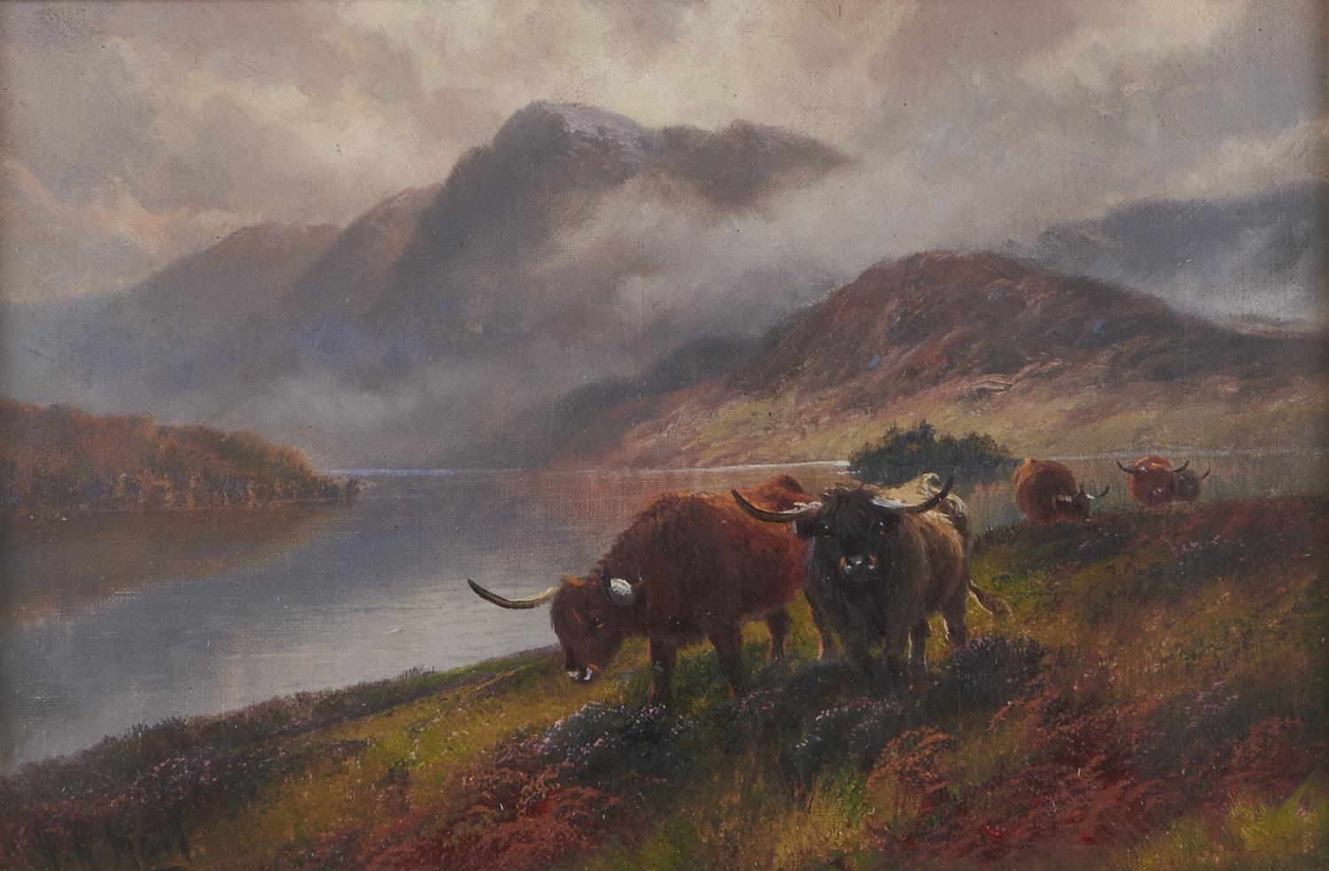Henry Robinson Hall (1859-1927) - Highland Cattle, Loch Katrine; Highland Rovers, Loch Maree, a pair, both signed, signed again and inscribed with the title verso, oil on canvas, 19 x 29cm