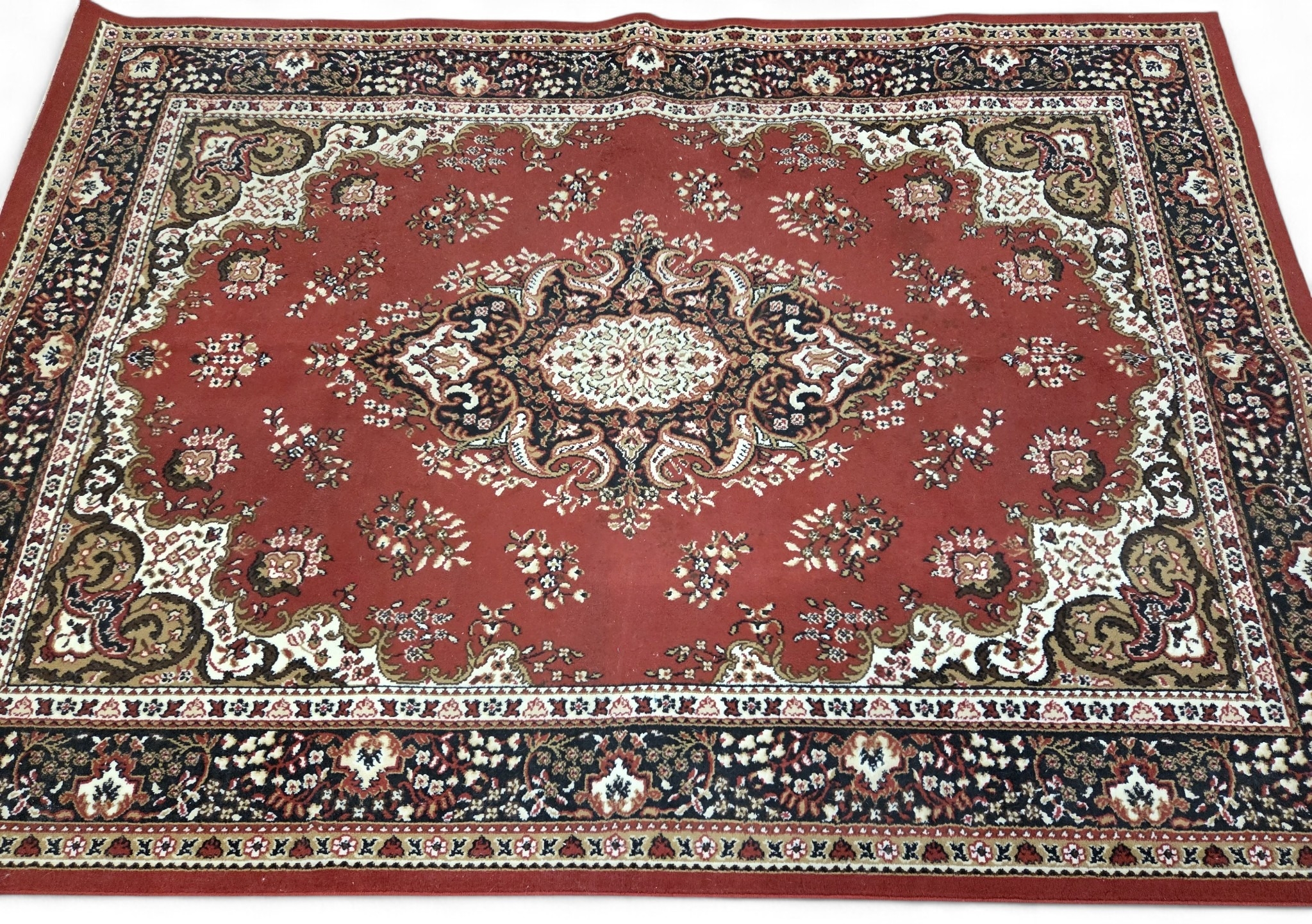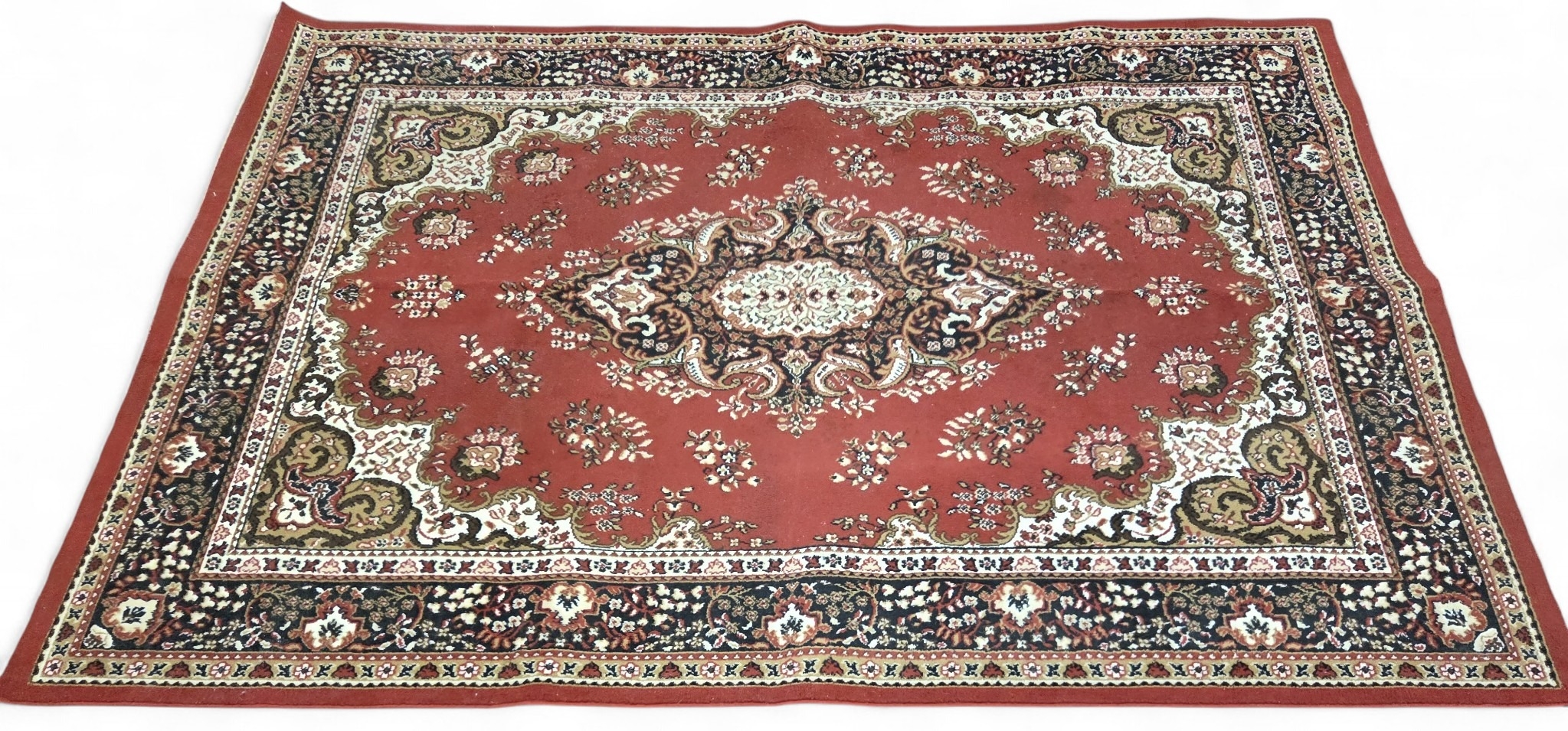 A large European red ground Rug with central floral motif floral spandrels and multiple floral borders 278cm x 200 cm approx.