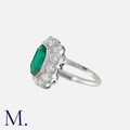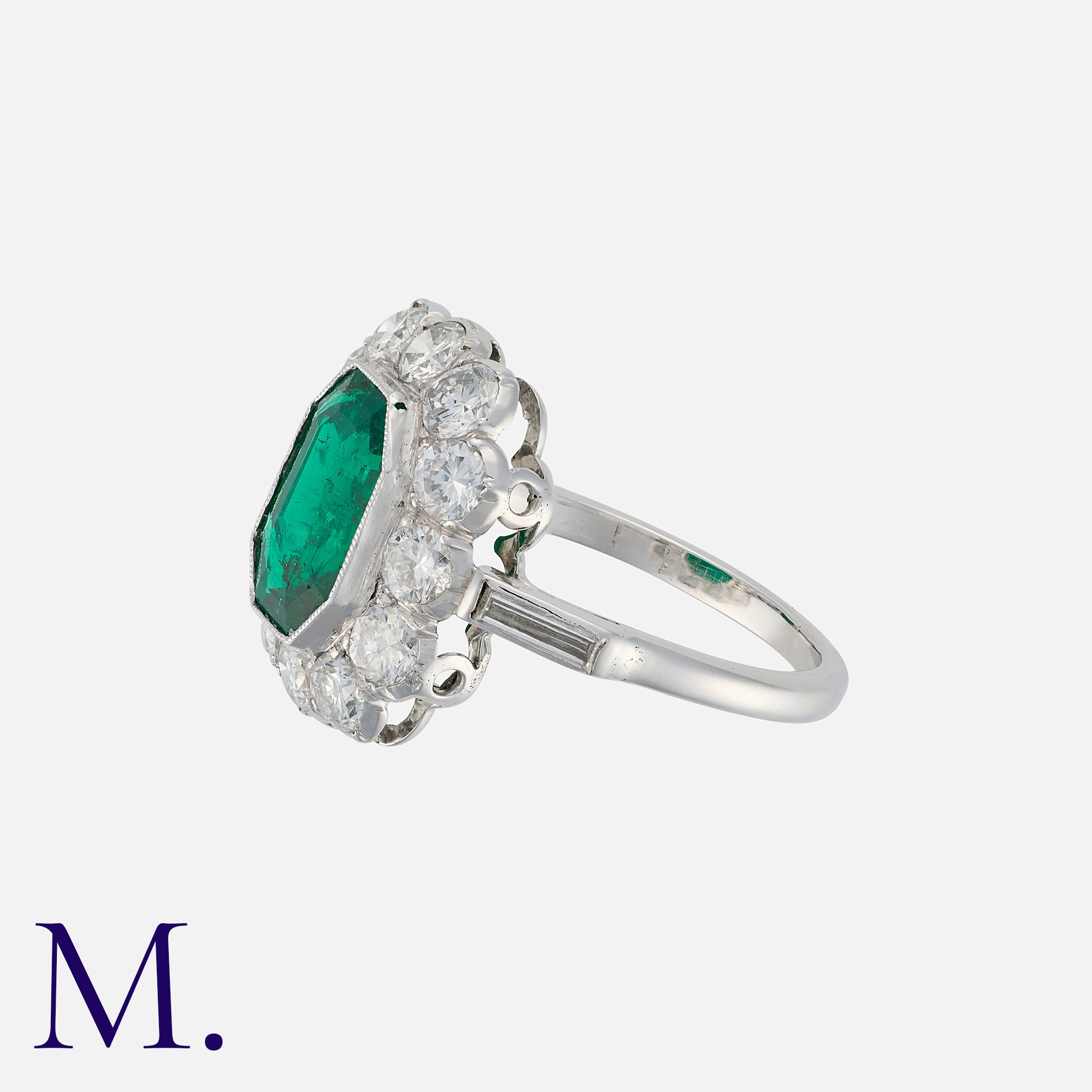 A Colombian Emerald and Diamond Cluster Ring in platinum, set with a principal octagonal step cut emerald of approximately 1.90 carats, within a border of round brilliant cut diamonds, with a baguette cut diamond to each shoulder. French Assay Mark. Accompanied by a gemmological report stating the emerald is of Colombian origin, with moderate clarity enhancement.