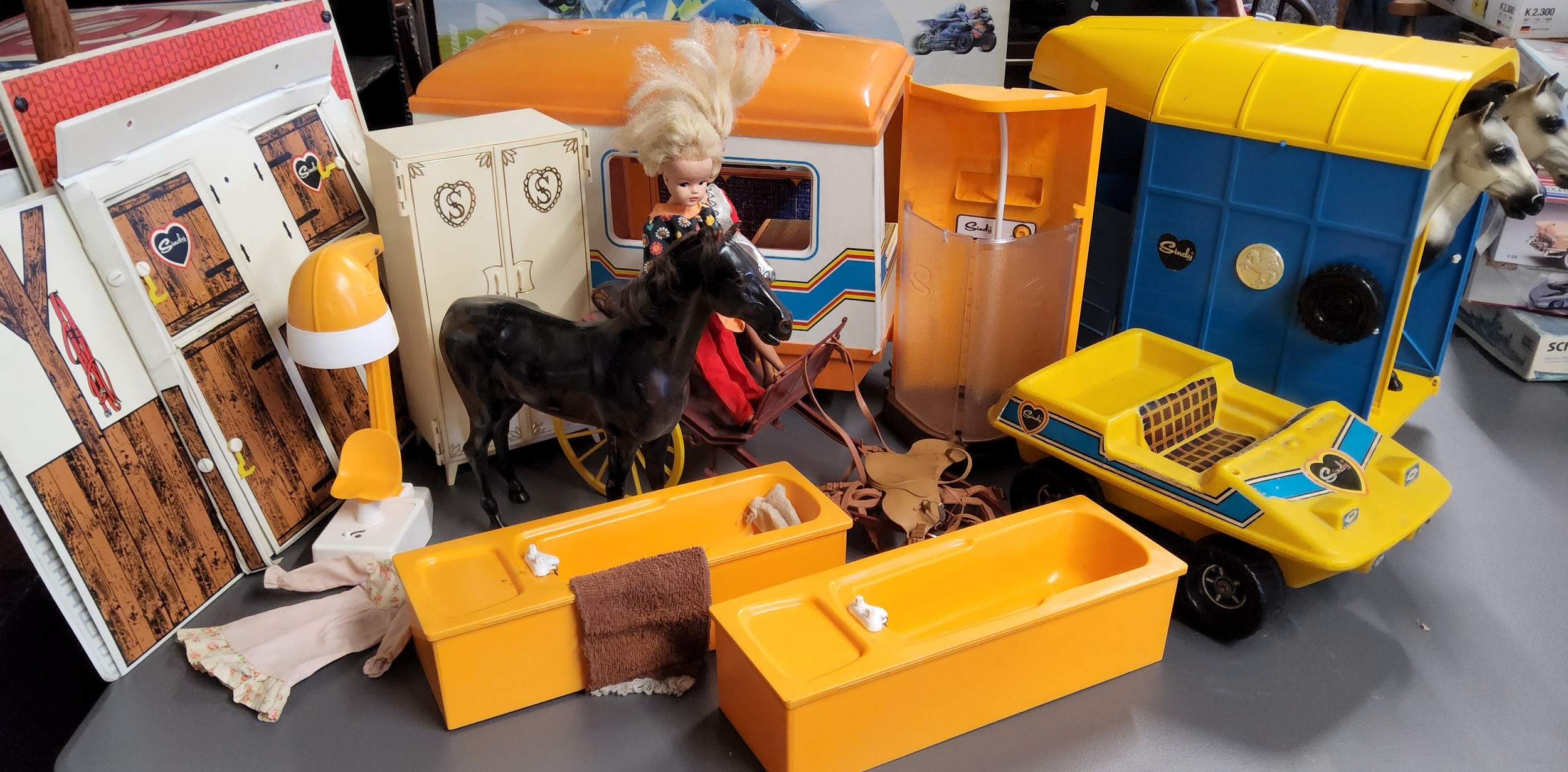 Sindy including a 033055X clothed Sindy, another (both af); Caravan no. 44579 & car c.1980's; bathroom accessories including two baths, shower & hair dryer; a Stable no. 44578; wardrobe c.1970's; horsebox trailer; two dapple & one chestnut ponies etc.