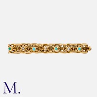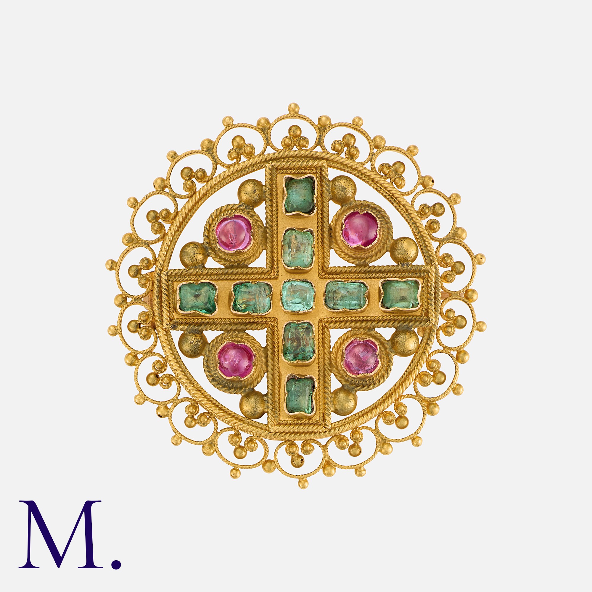 An Antique Ruby and Emerald Brooch in yellow gold, set with four cabochon rubies and nine faceted emeralds to an ornate filigree-work brooch. Unmarked; tests indicate 18ct gold.