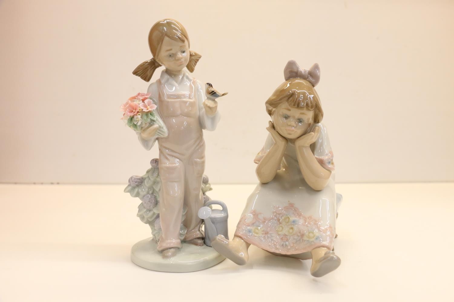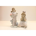 Lladro model of a girl holding flowers and a bird, 18cm, and another of a girl seated on a stool. 15cm (2)