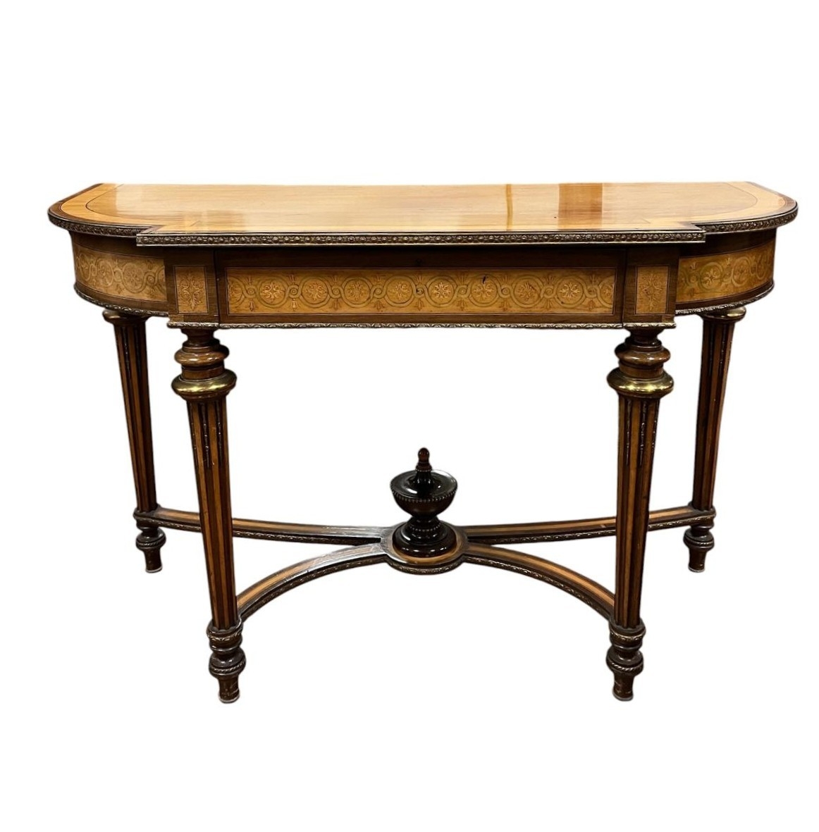 A LATE 19TH CENTURY MAHOGANY, SATINWOOD AND GILT BRASS MOUNTED CONSOLE TABLE of rectangular bowed outline the shaped top with frieze drawer raised on fluted and turned legs joined by a shaped stretcher with urn capital 73cm (h) x 114cm (w) x 41cm (d)