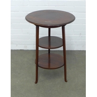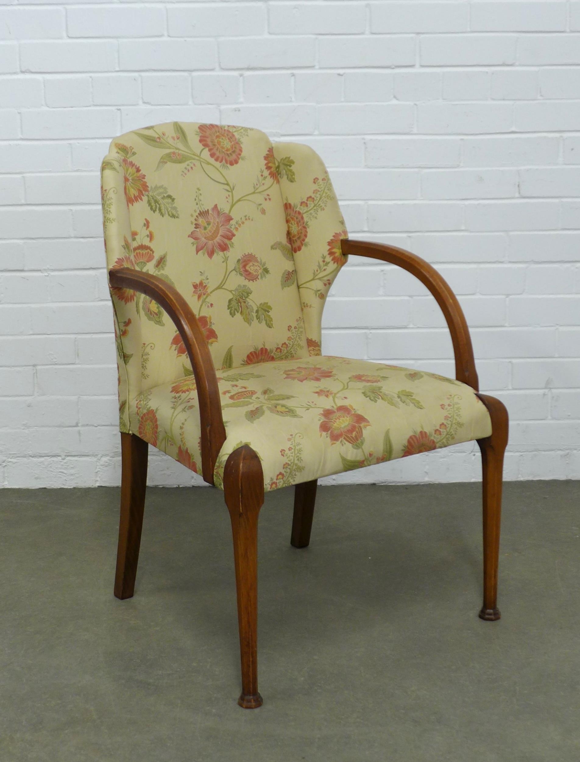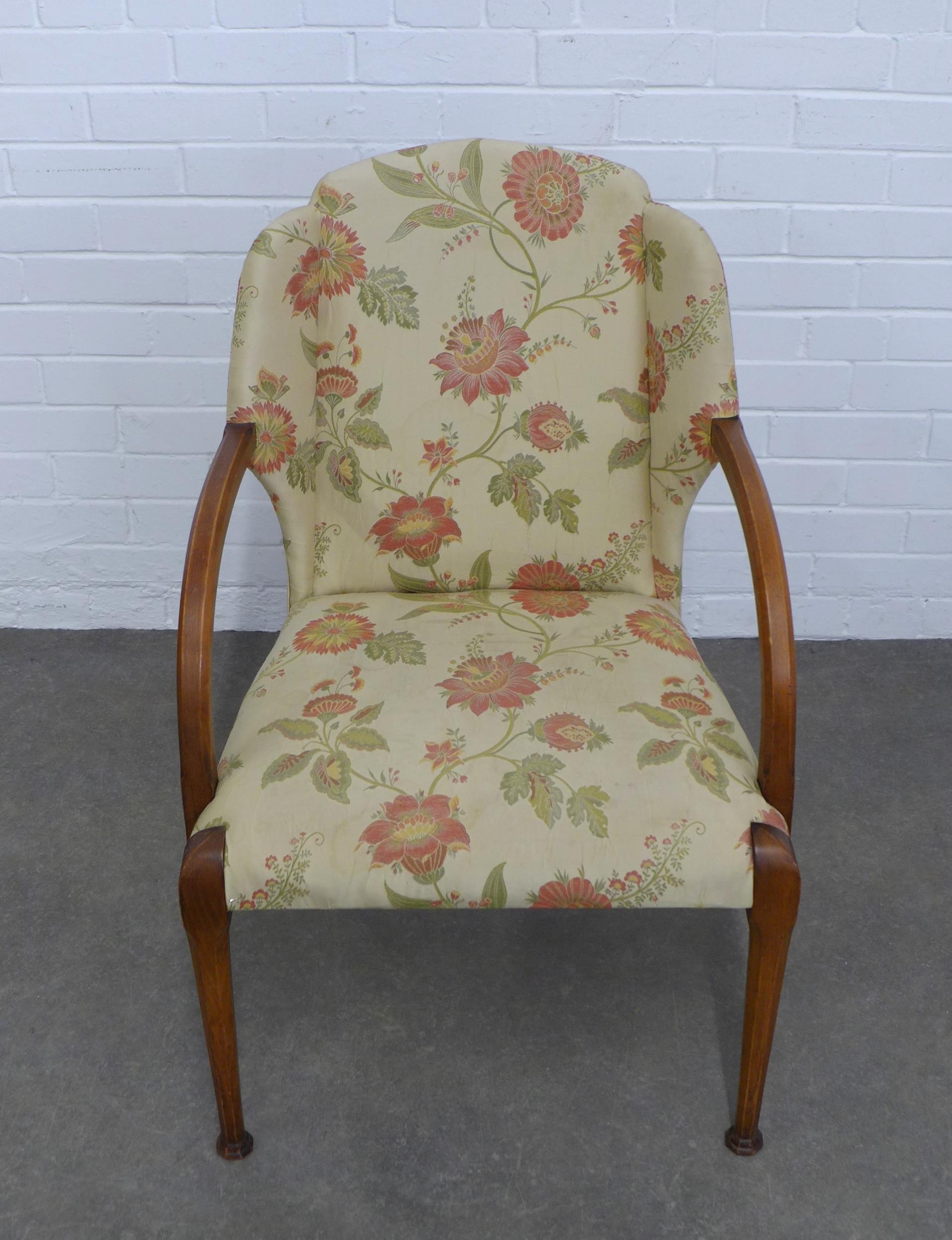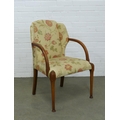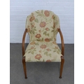 Arts & Crafts light oak open armchair with curved arms and tapering legs with flat hexagonal feet, floral upholstered back and seat, 58 x 89 x 46cm.