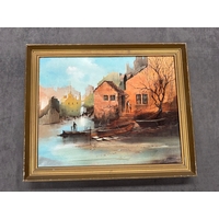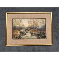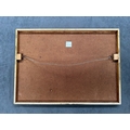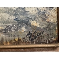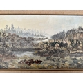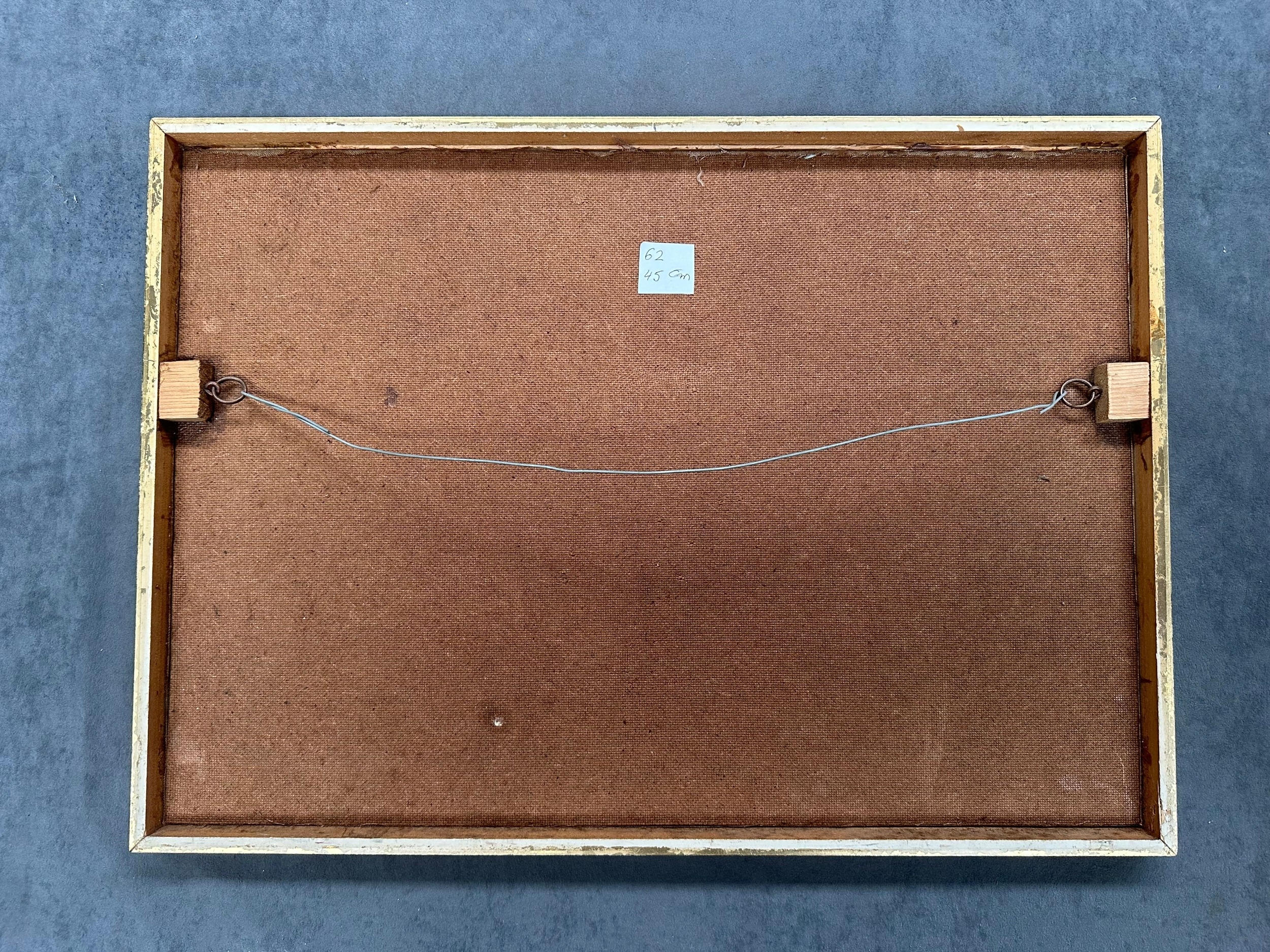 The use of impasto technique provides a rich texture, allowing the light to dance across the surface, giving depth and a tactile quality to the terrain. The work is framed in a simple gold frame with a linen mat, adding a timeless elegance.