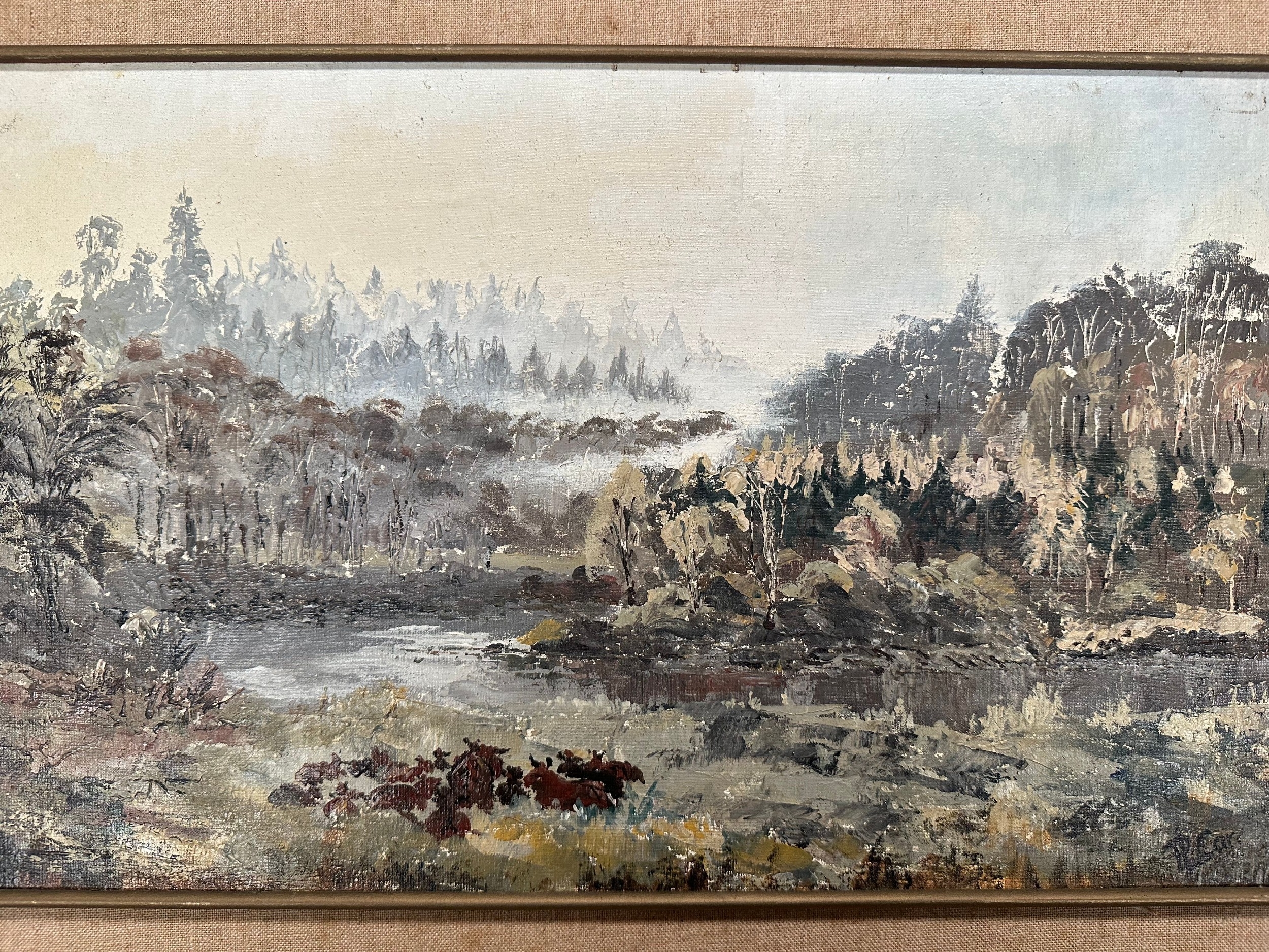 A beautifully atmospheric landscape rendered in thick, expressive brushwork, likely mid-20th century. The composition features a misty forested valley bordered by rugged terrain, with soft light breaking through the distant trees. Earthy tones of grey, brown, and green give this piece a moody, naturalistic feel that suggests early autumn or late winter.