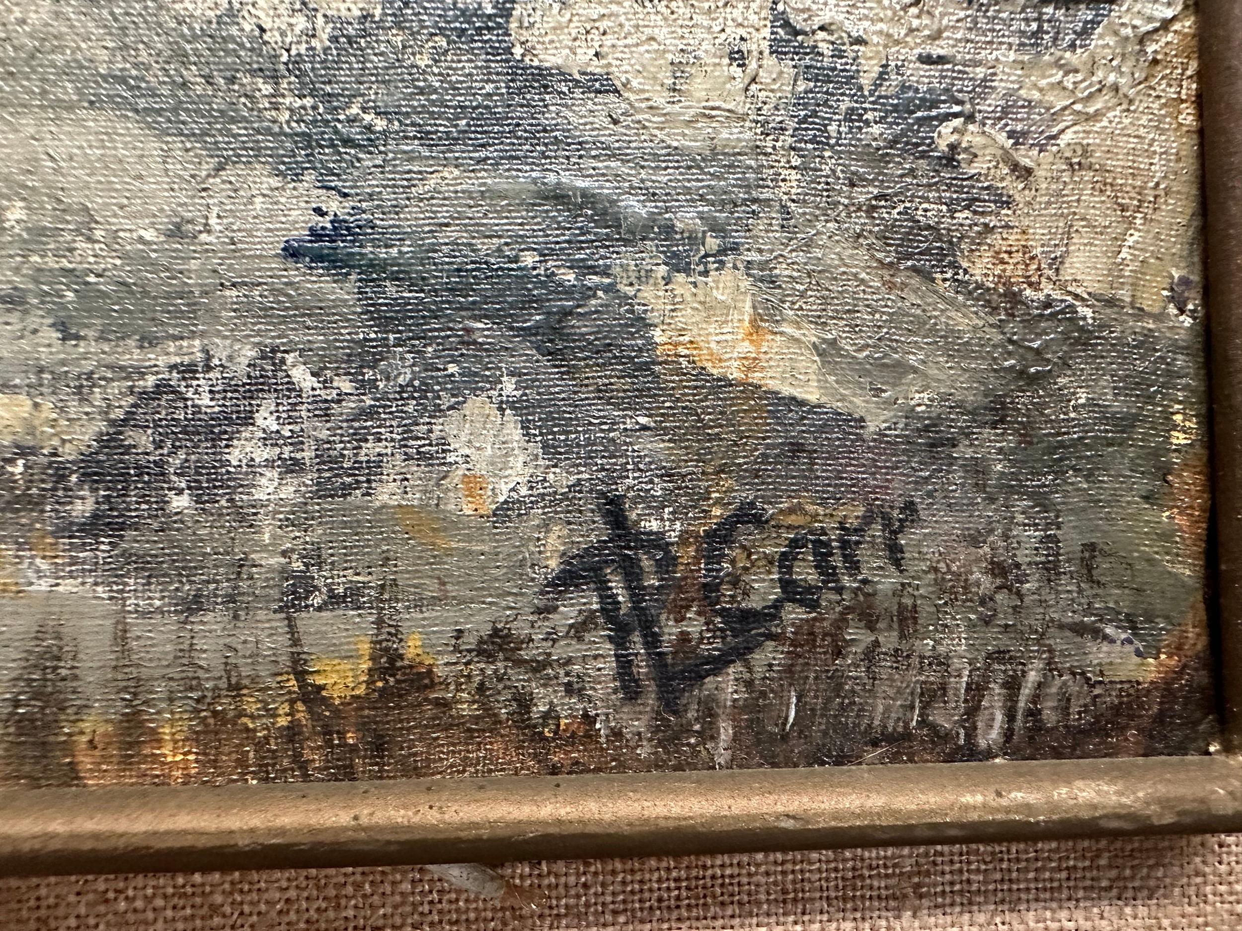 Though unsigned or with an indistinct signature, this painting evokes the tradition of European plein air landscapes and would make a striking addition to a traditional or rustic interior.