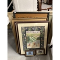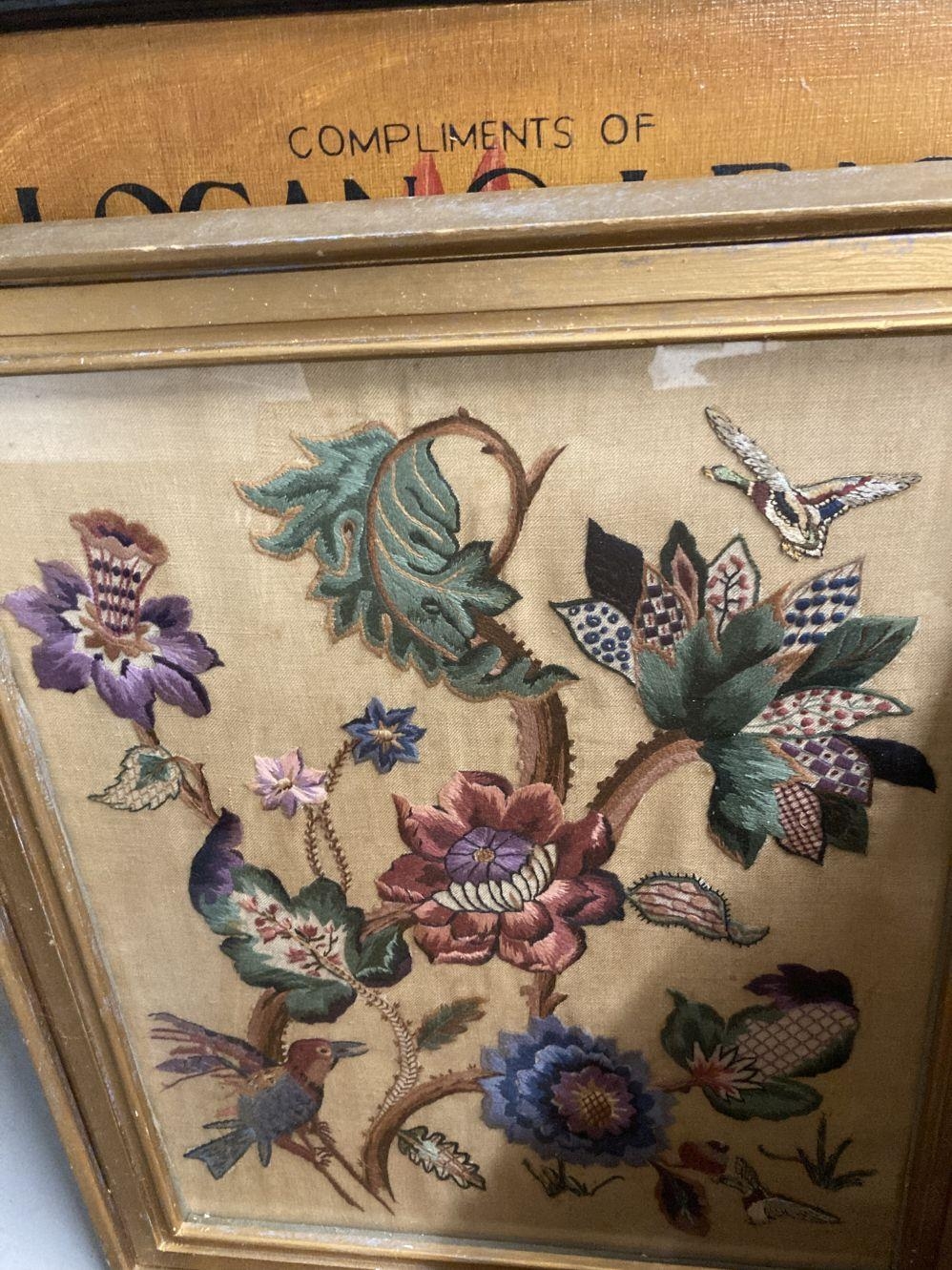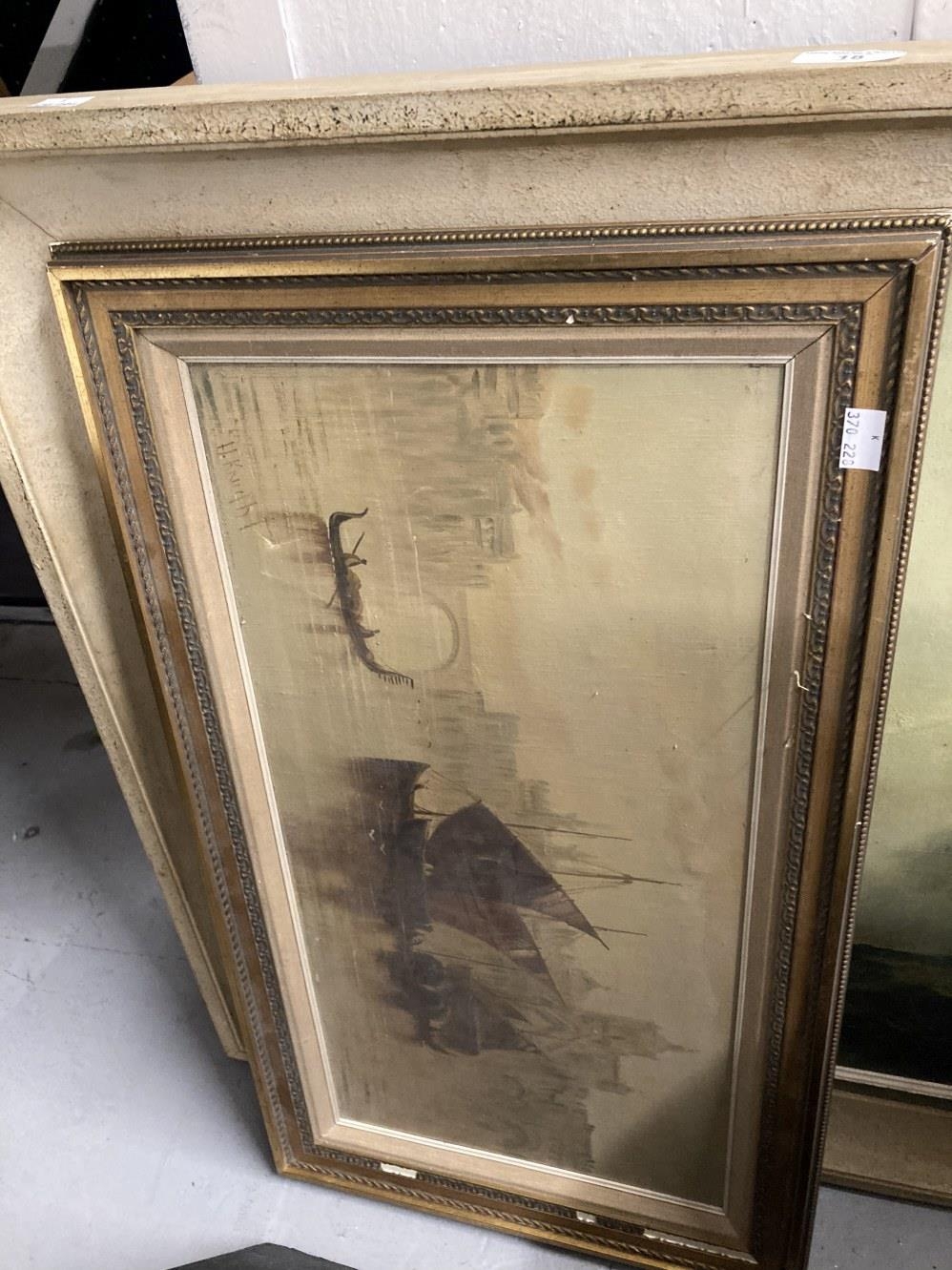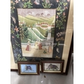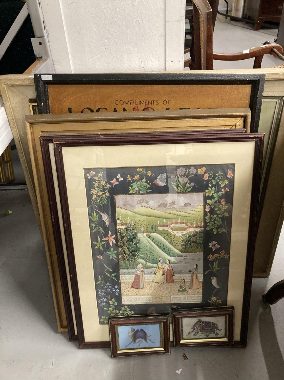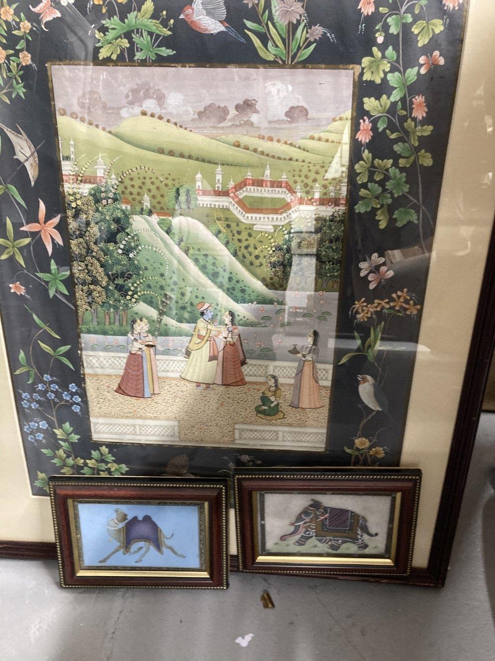 Henri Ghysen: 20th cent. Oil on canvas landscape, framed. 27ins. x 23ins. Plus 20th cent. Oil on canvas of Venice, signed H. Knight, framed. 23ins. x 11½ins. Early 20th cent. Woolwork picture, birds and flowers in glazed frame 28½ins. x 23½ins, a late 20th cent. cafe sign Loyon & Leach, oil on plywood 31ins. x 23½ins. Indian School: 20th cent. Pair of watercolours, a courting couple in a courtyard and figures attending a ceremony, framed and glazed. 21ins. x 15ins. Plus two small Indian pictures, a camel and an elephant.