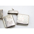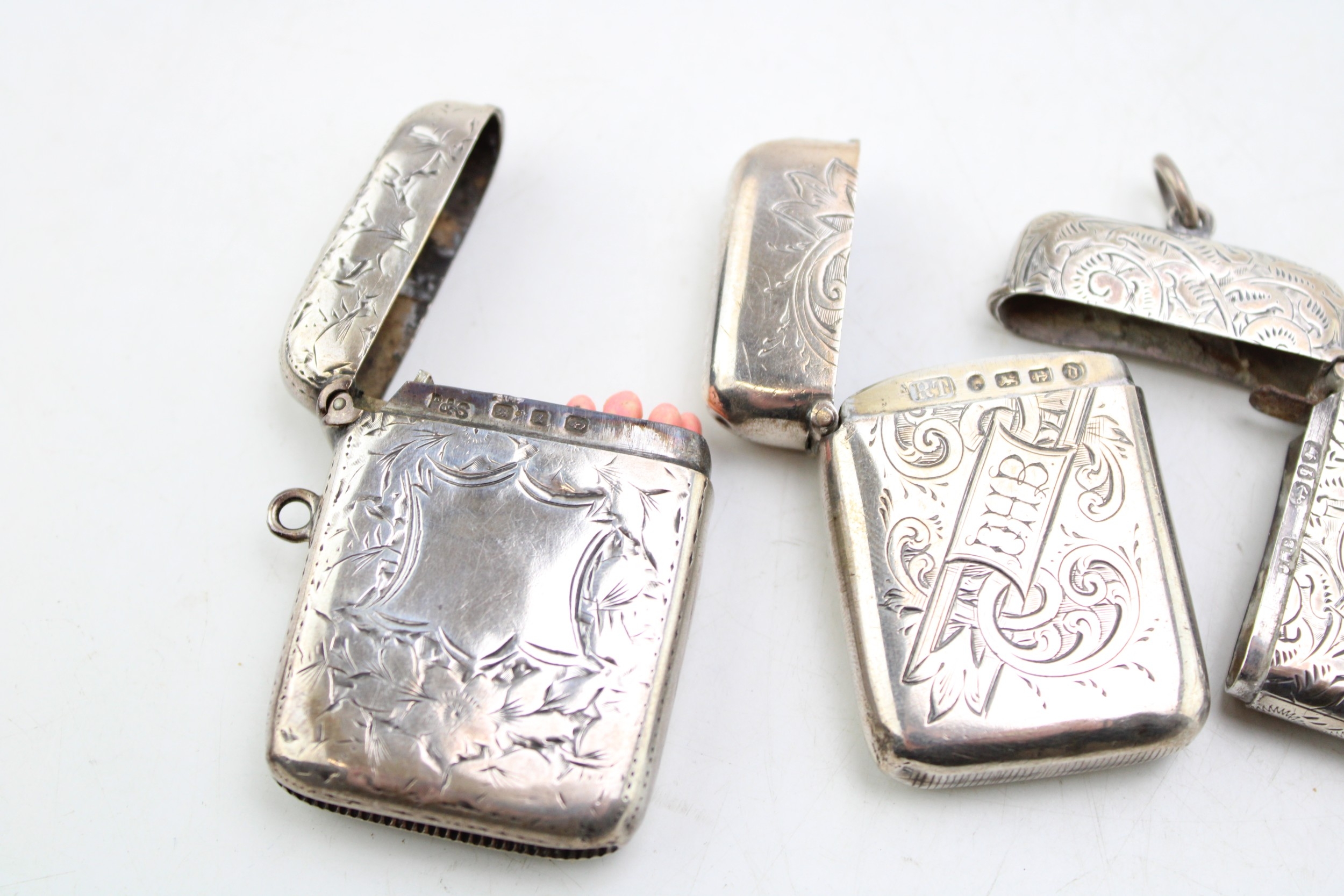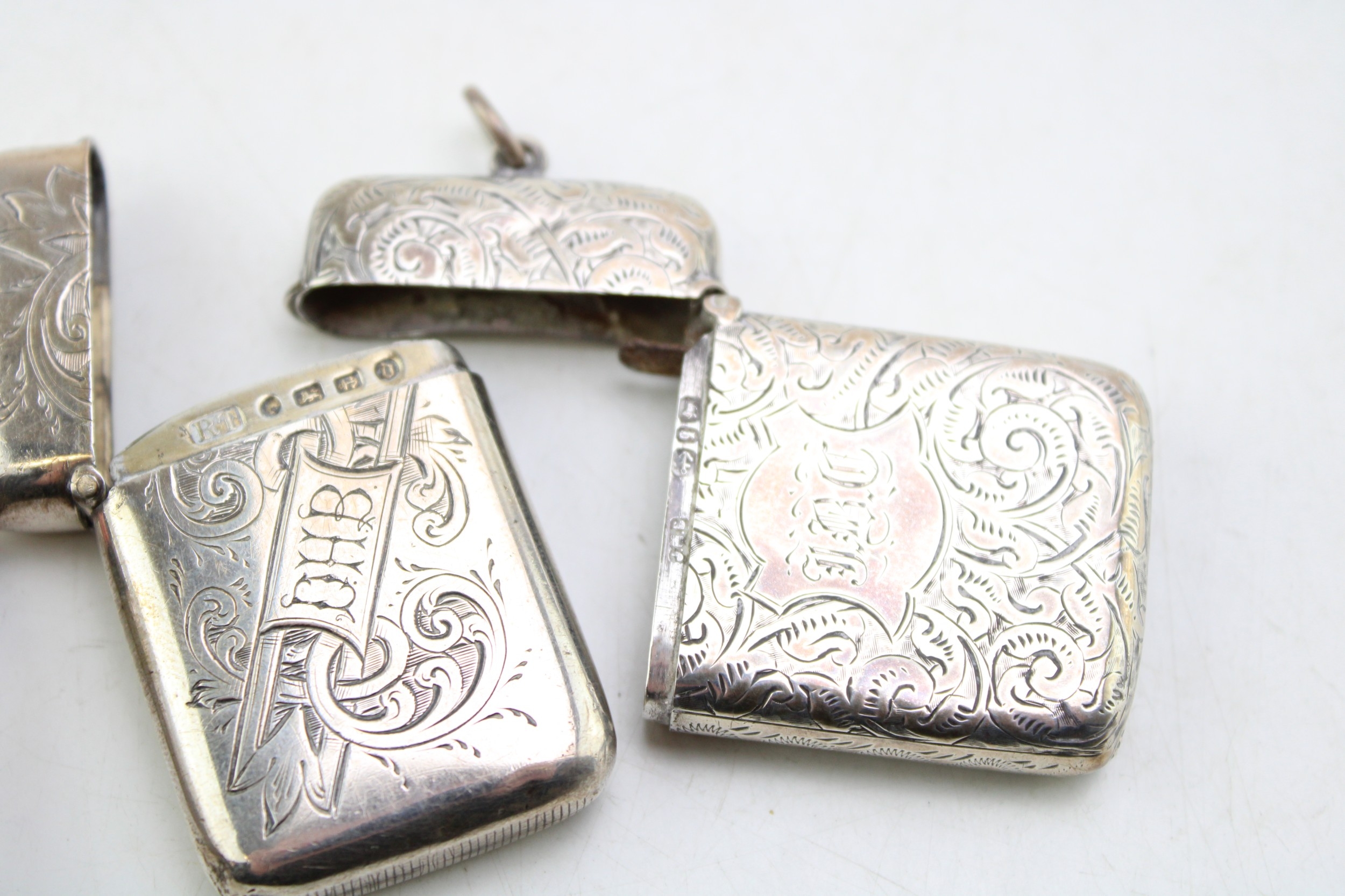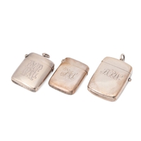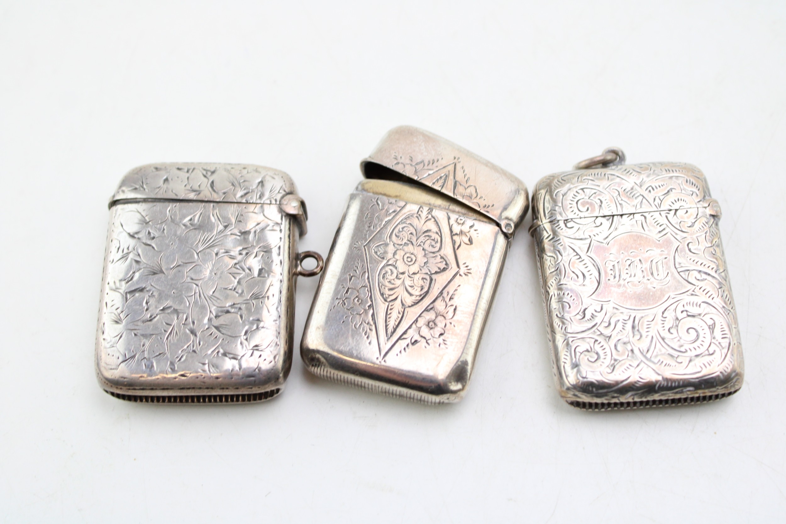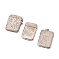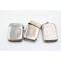 A group of three 19th century Victorian silver vesta cases of similar rectangular form with foliate and floral engraving, all Birmingham assay office, comprising an example by Robert Thornton, 1878, another John Millward Banks, 1890, and the last E. V. Pledge & Son, 1899, combined weight 62.9g, 2.0toz.