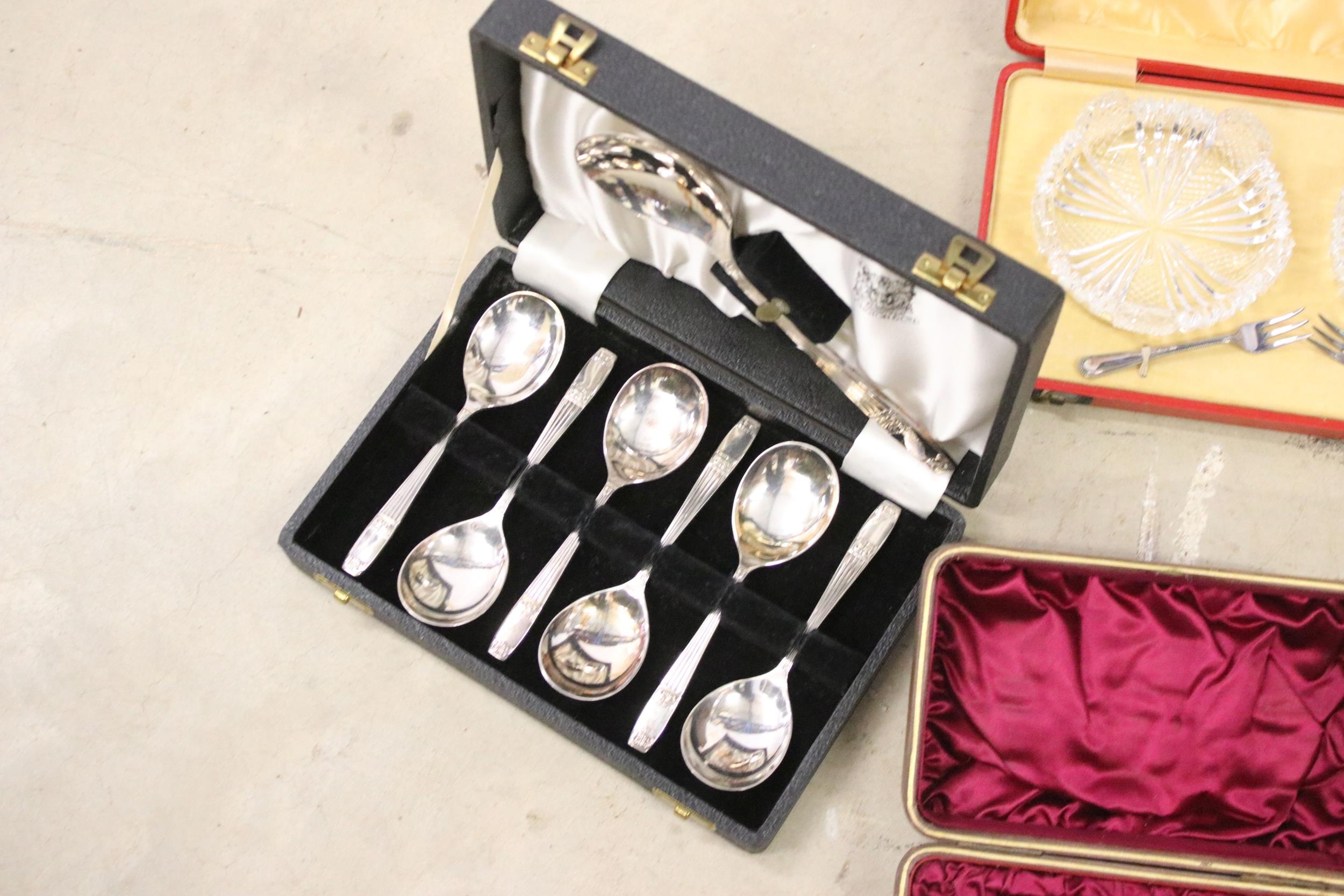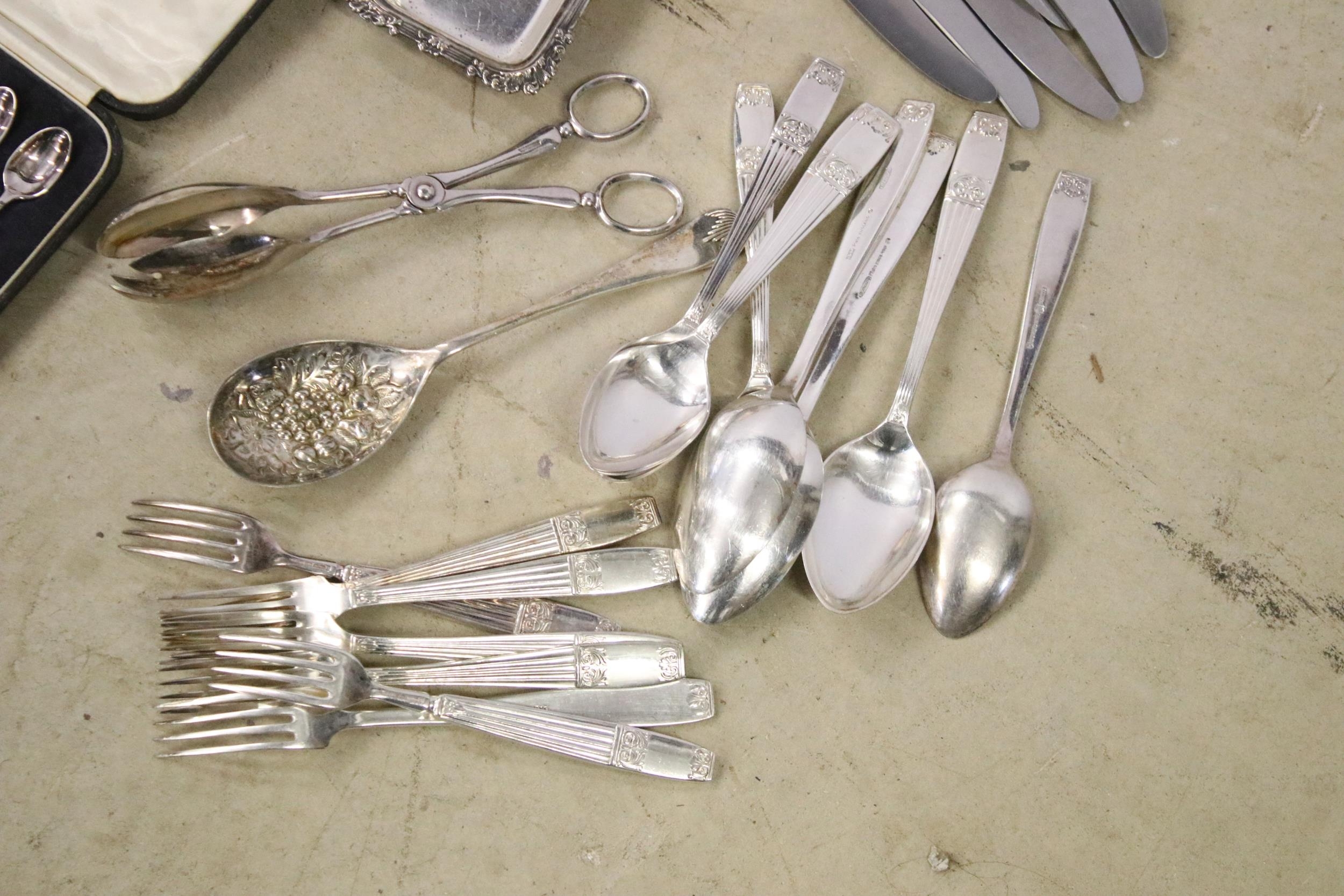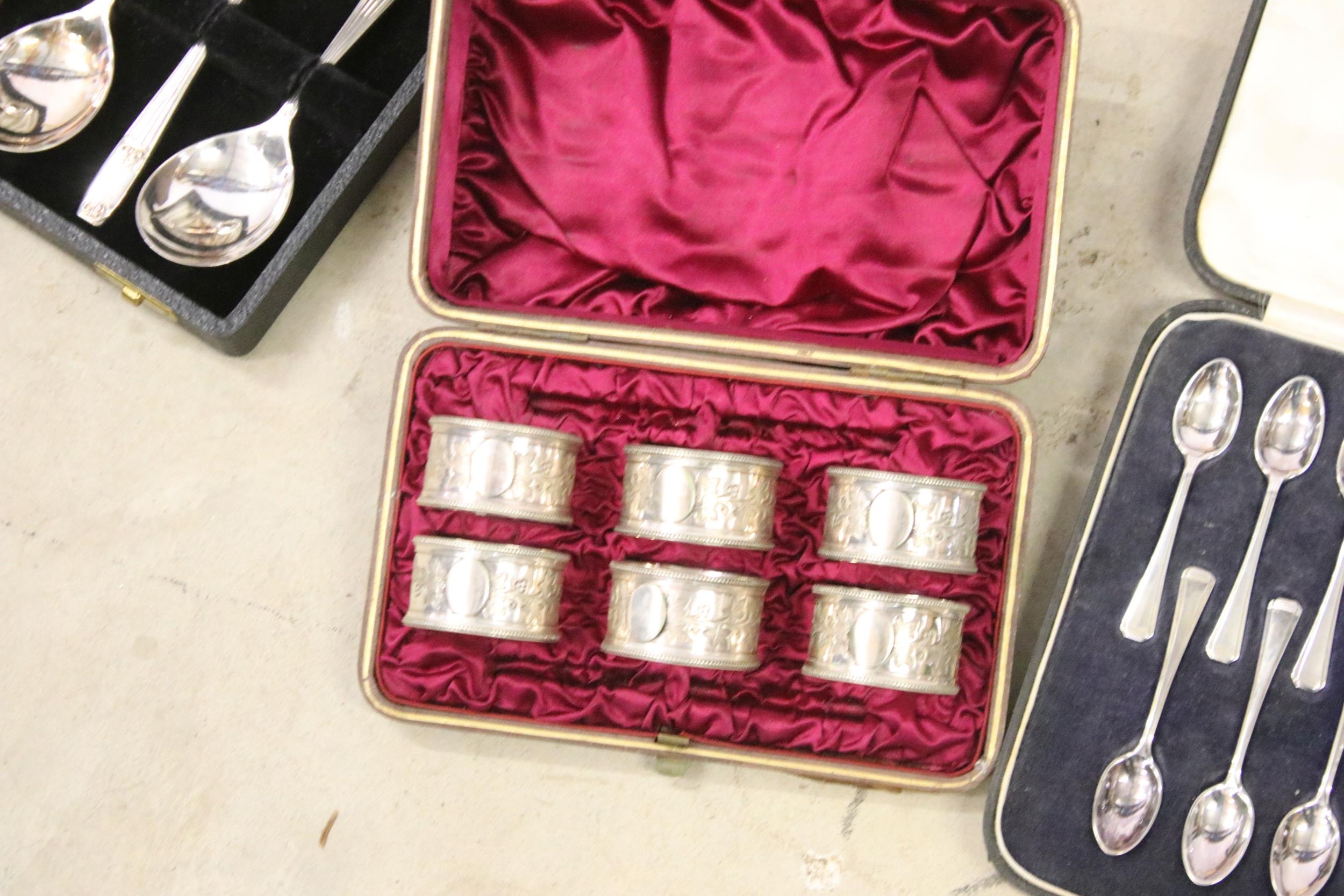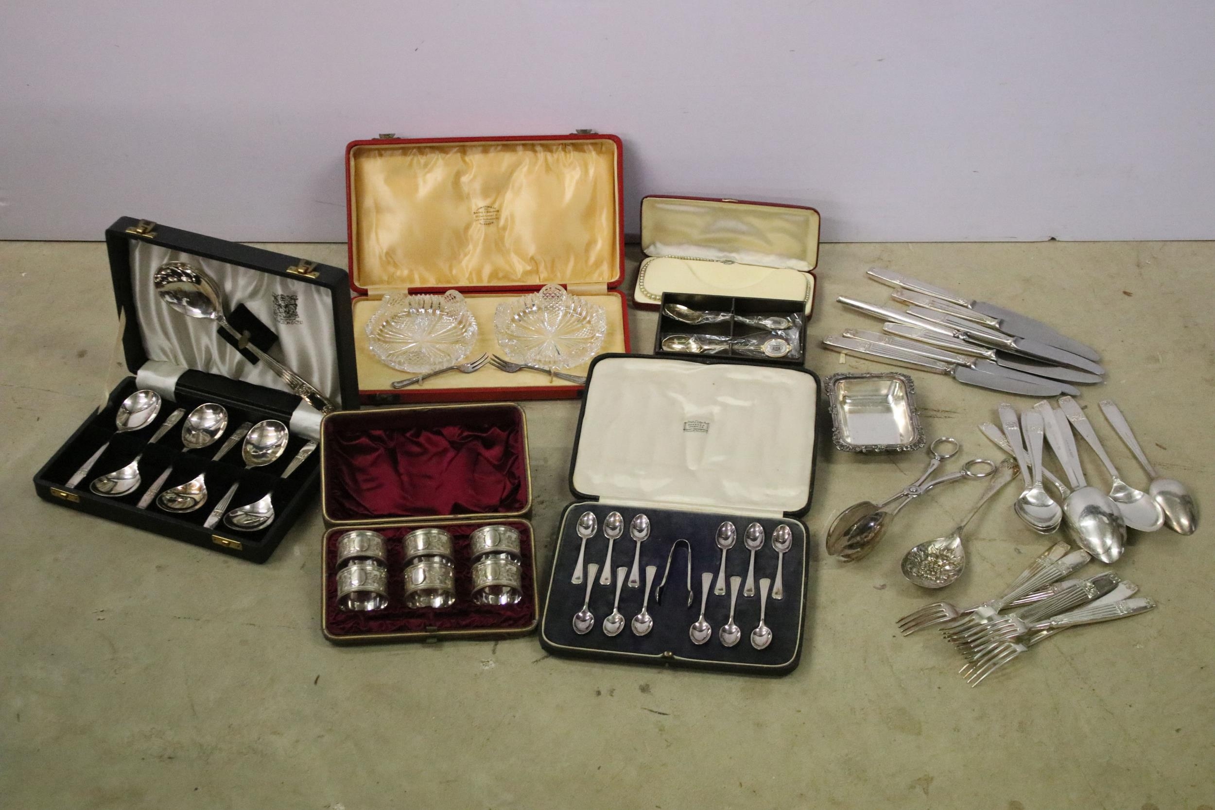 Collection of mixed silver plate to include cased Elkington & Co. spoon set, cased Harrods A1 silver plate set of 12 x teaspoons and 1 x sugar tong, cased napkin ring set, Elkington & Co stainless steel cutlery set, Johnston & Co. bowls and pickle forks set, etc