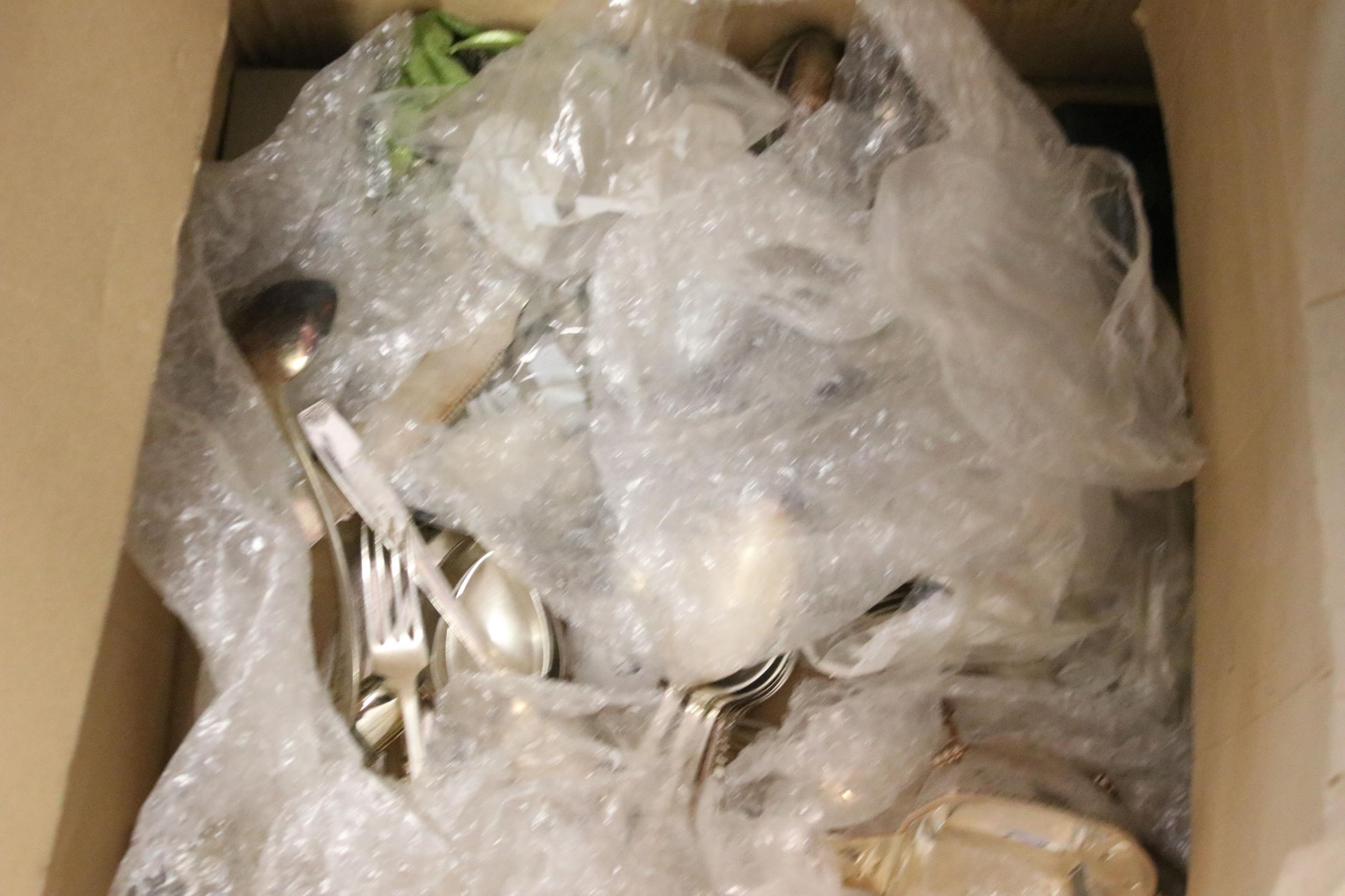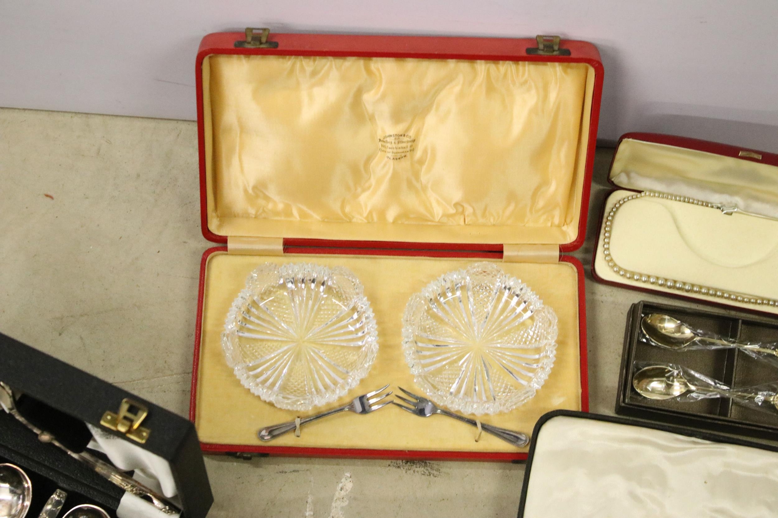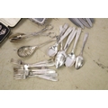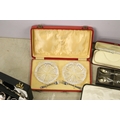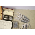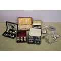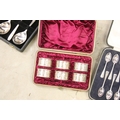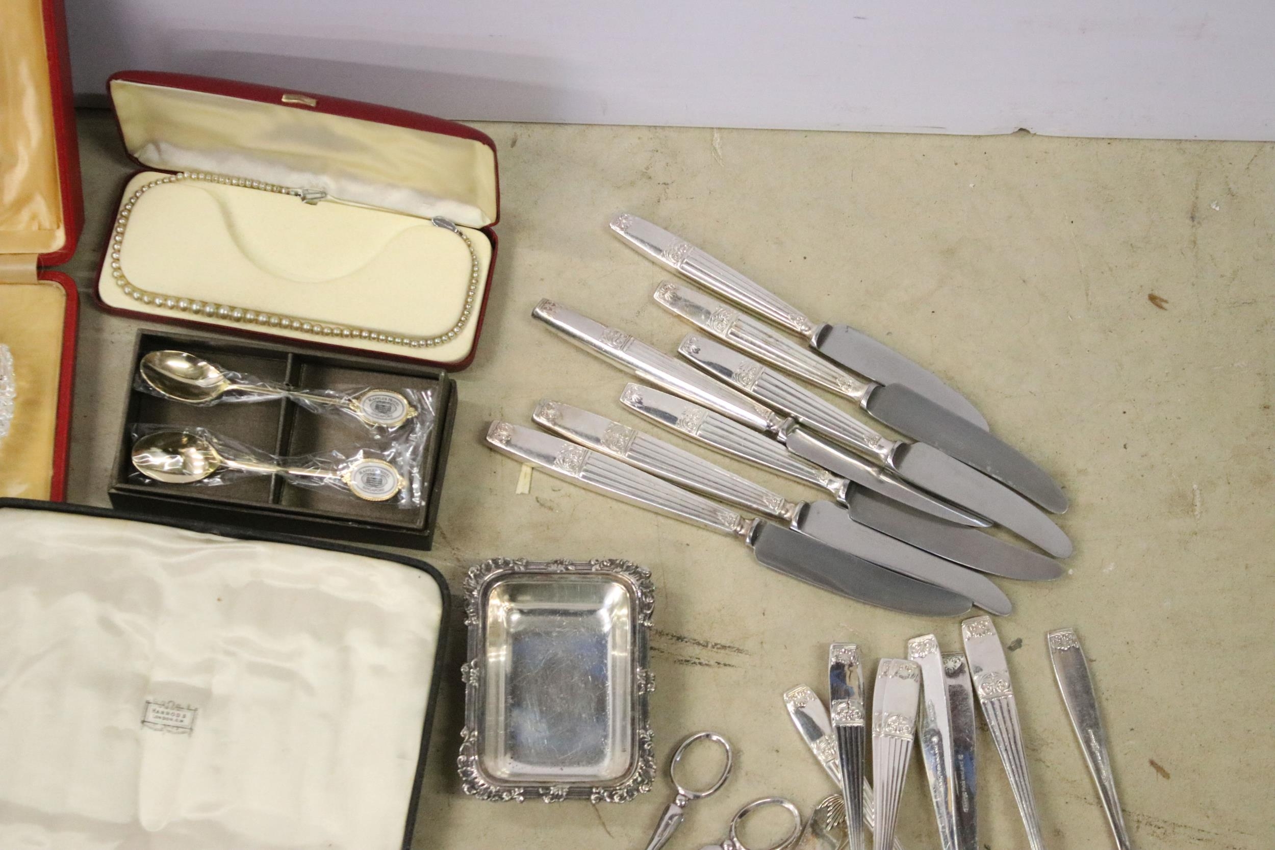 Collection of mixed silver plate to include cased Elkington & Co. spoon set, cased Harrods A1 silver plate set of 12 x teaspoons and 1 x sugar tong, cased napkin ring set, Elkington & Co stainless steel cutlery set, Johnston & Co. bowls and pickle forks set, etc