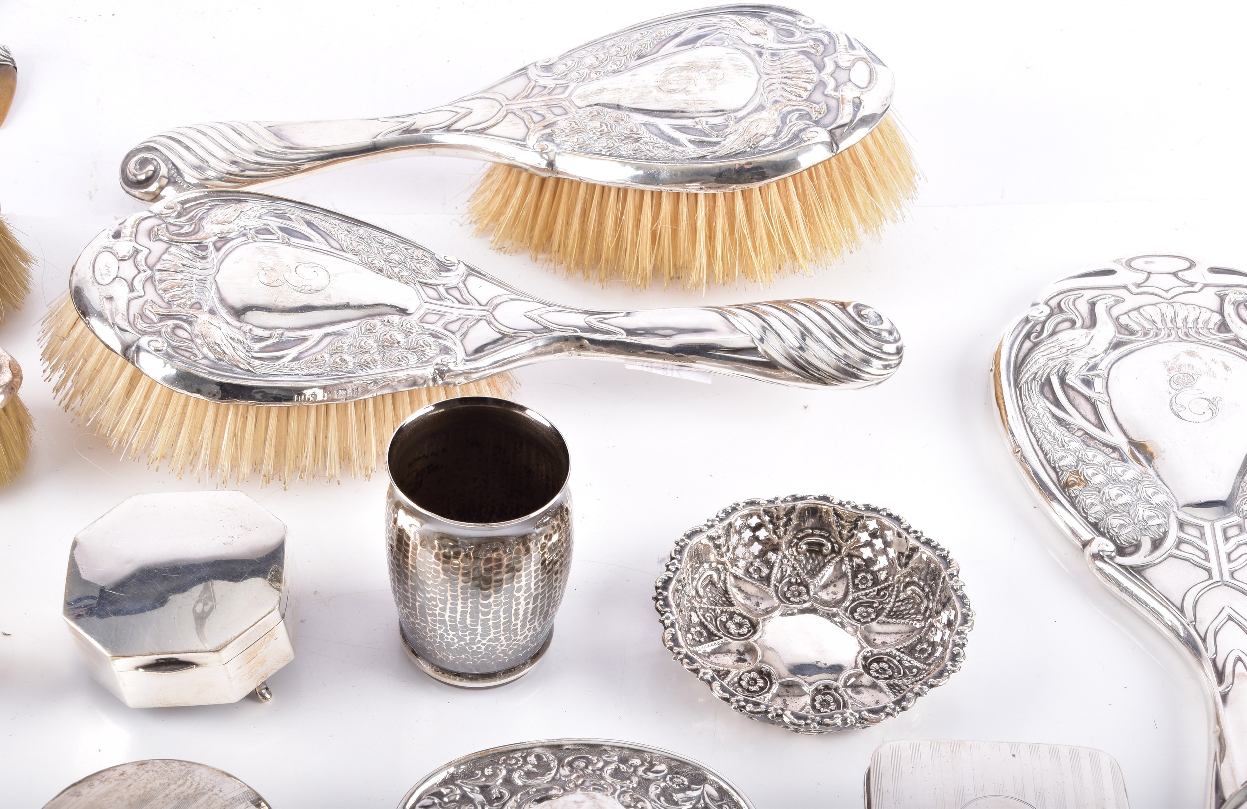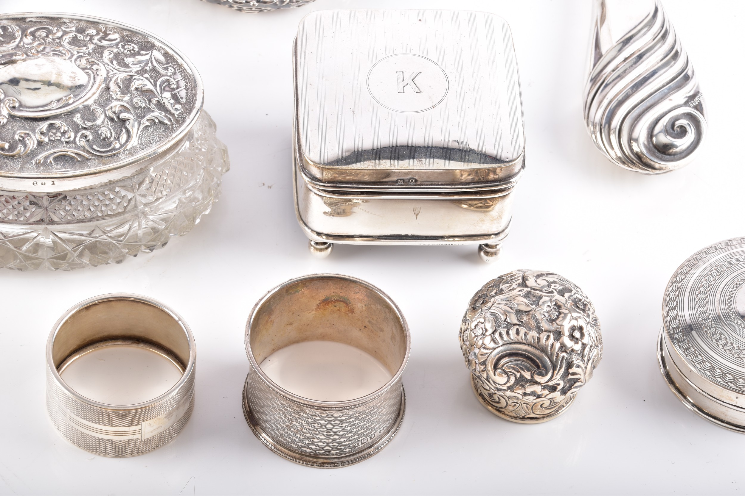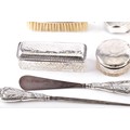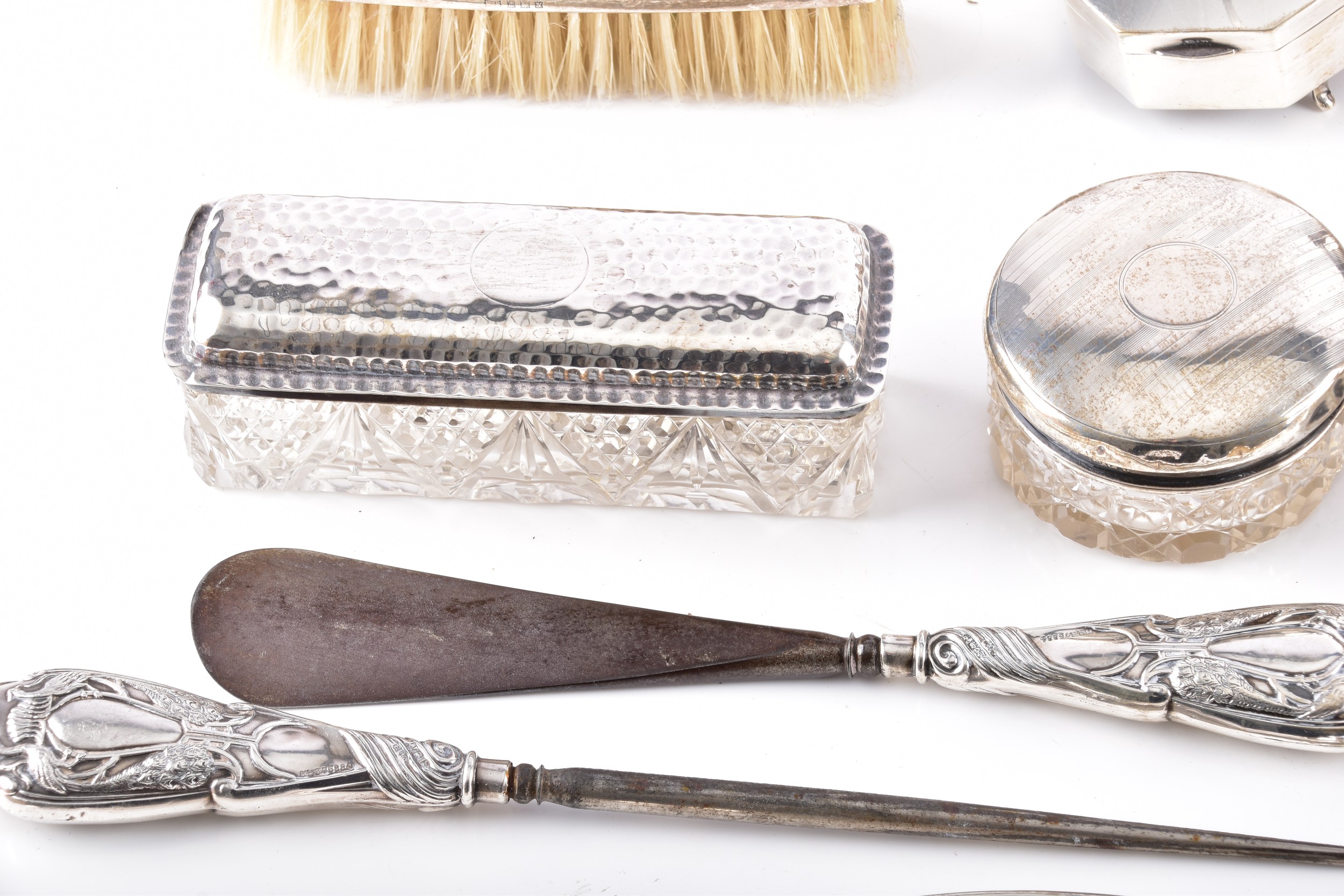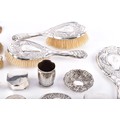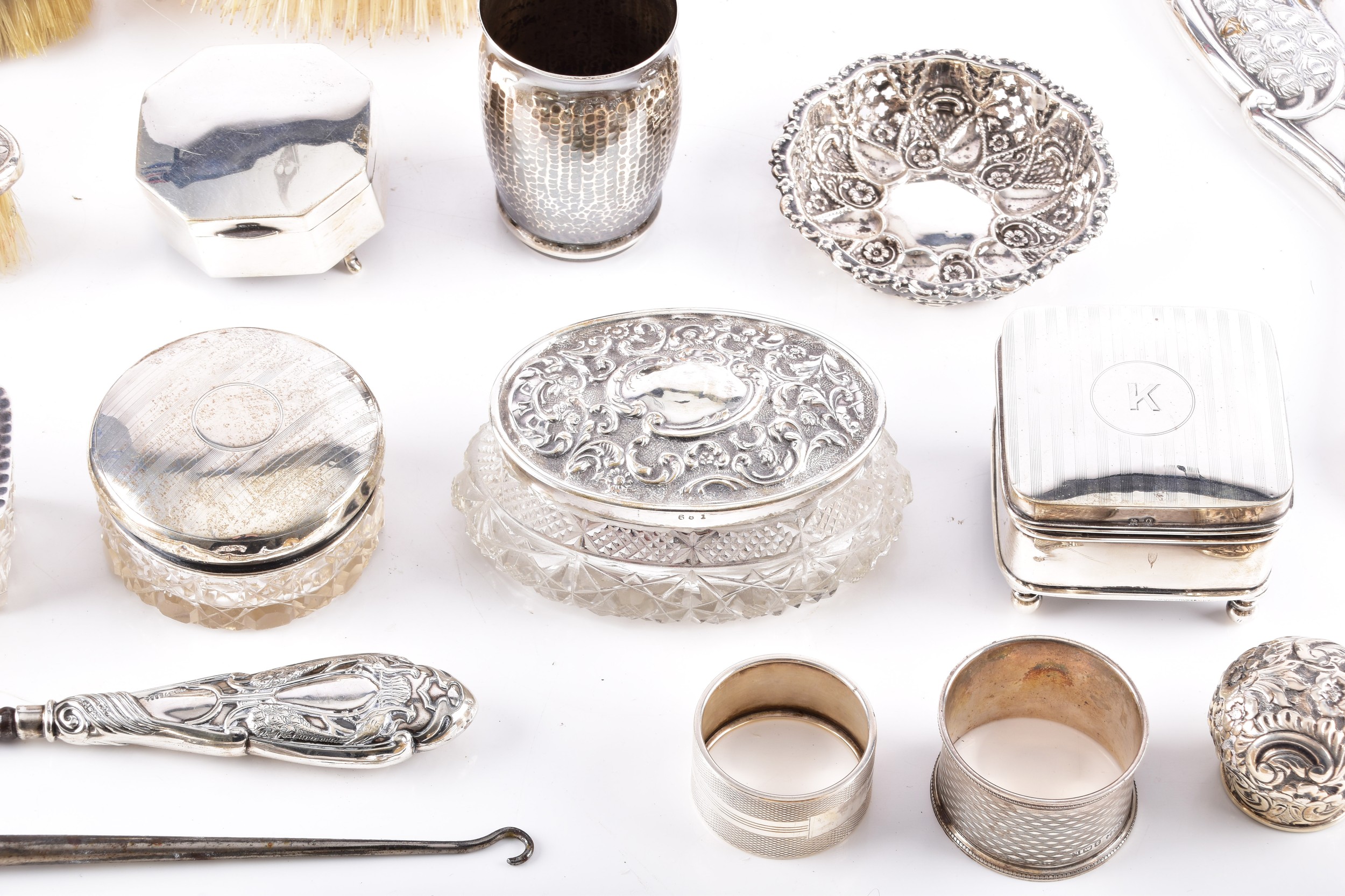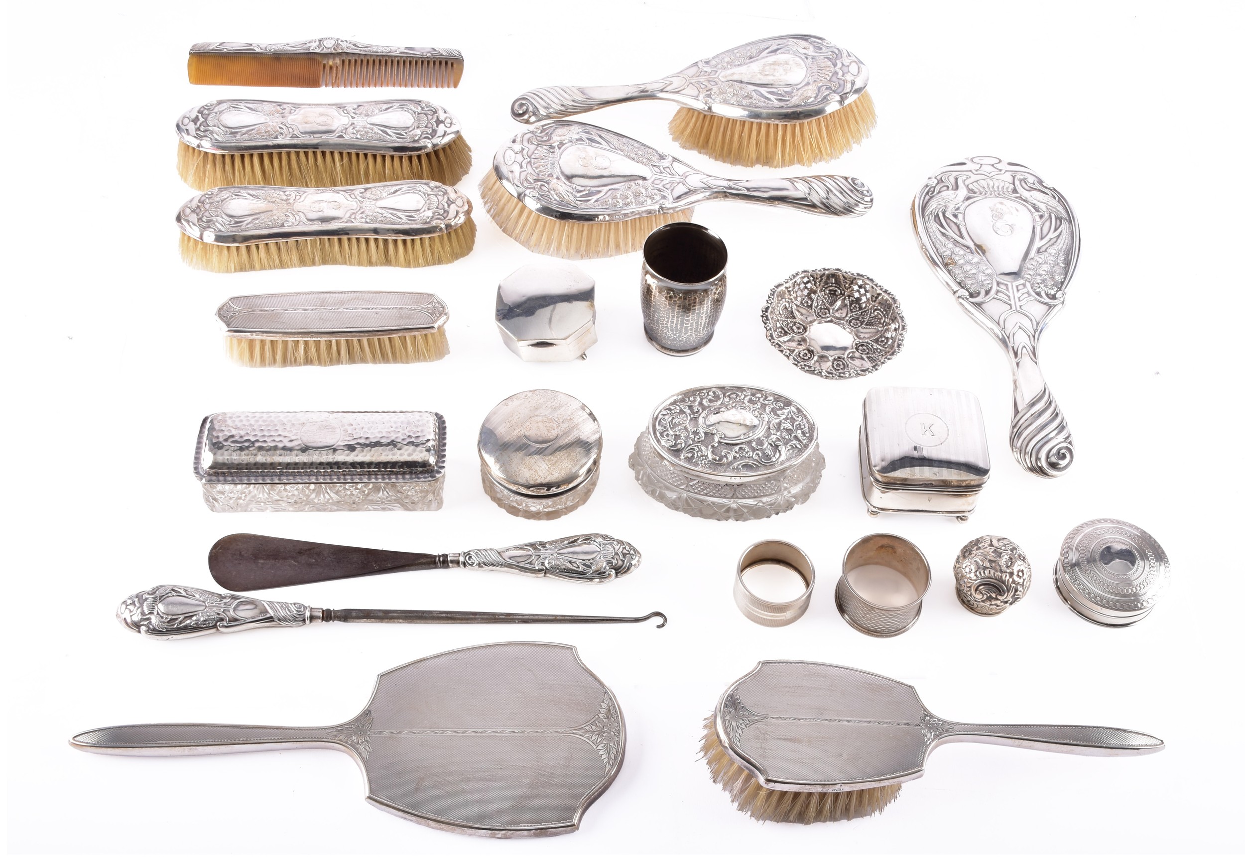 with repousse floral and foliate decoration, two hair brushes, two clothes brushes and shoe horn, Birmingham 1901 by Henry Matthews, another Dressing table set comprising on a hand mirror, hairbrush and clothes brush featuring engine-turned decoration and foliate detail, hallmarked for Birmingham 1962 by Walker & Hall, three silver lidded cut glass trinket boxes, a silver handled button hook, two silver footed and lined trinket boxes, two napkin rings, pill box and cup, together with a loose silver lid and white metal decorative small dish.
