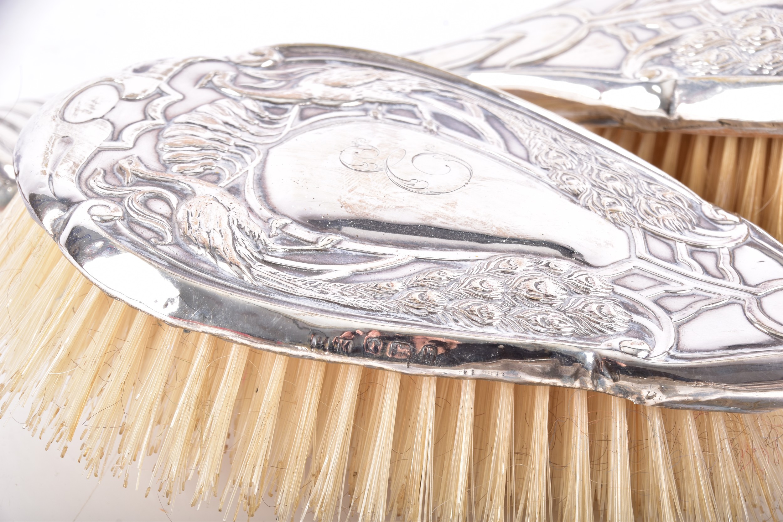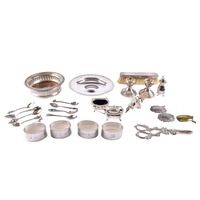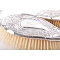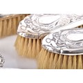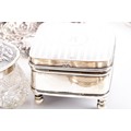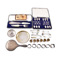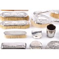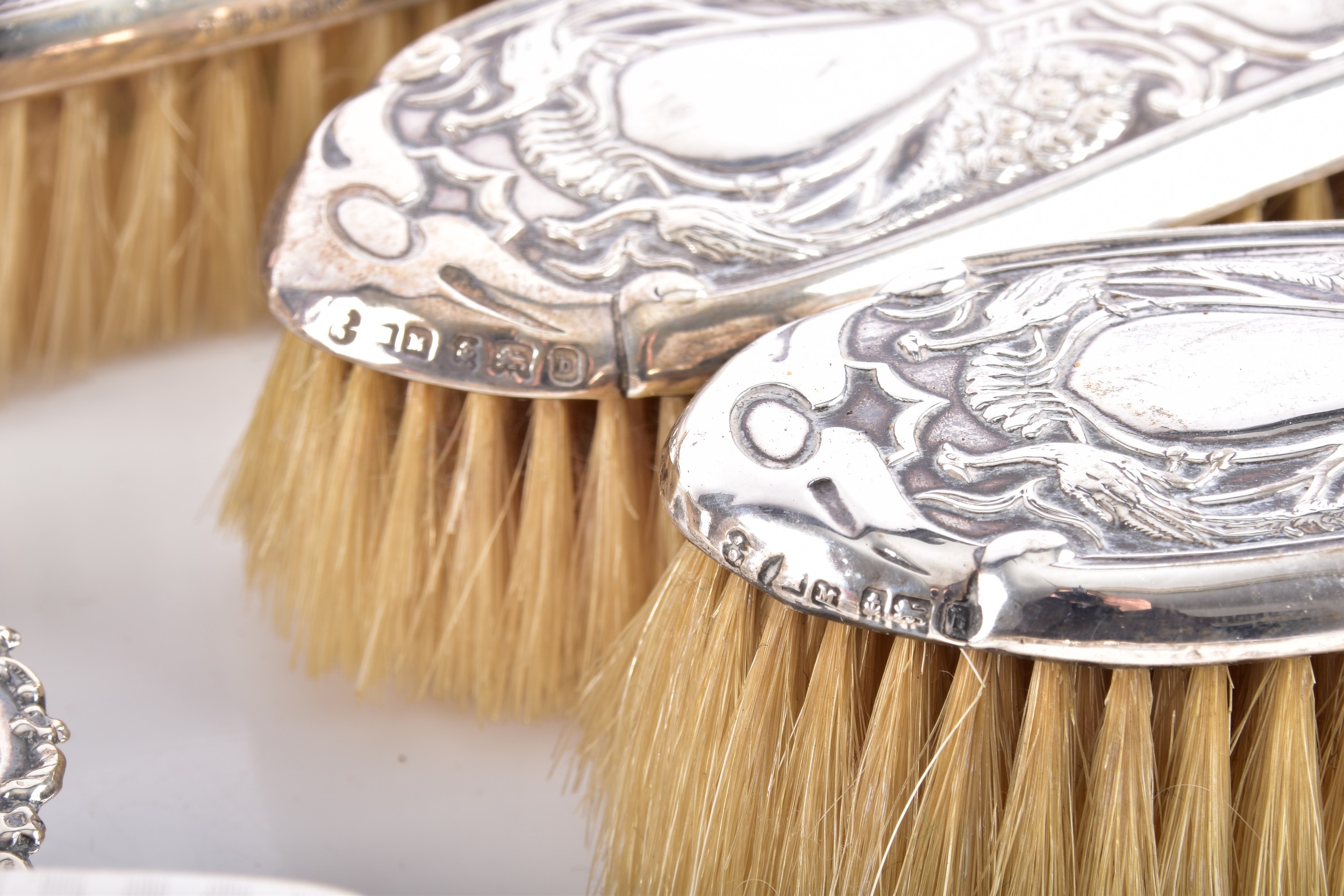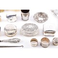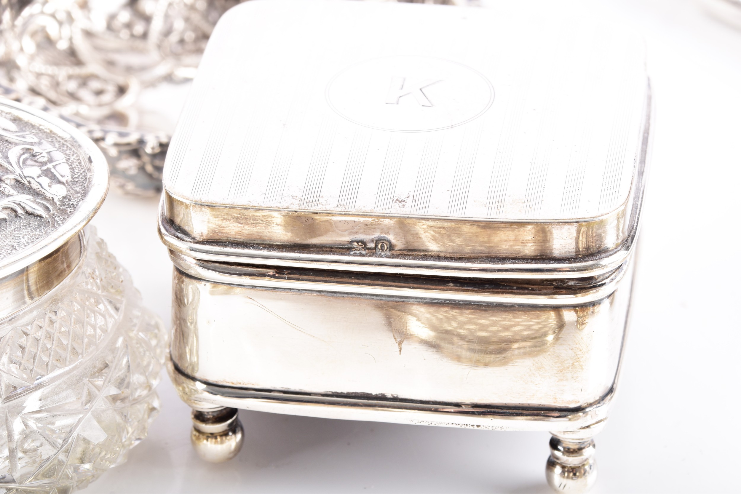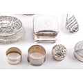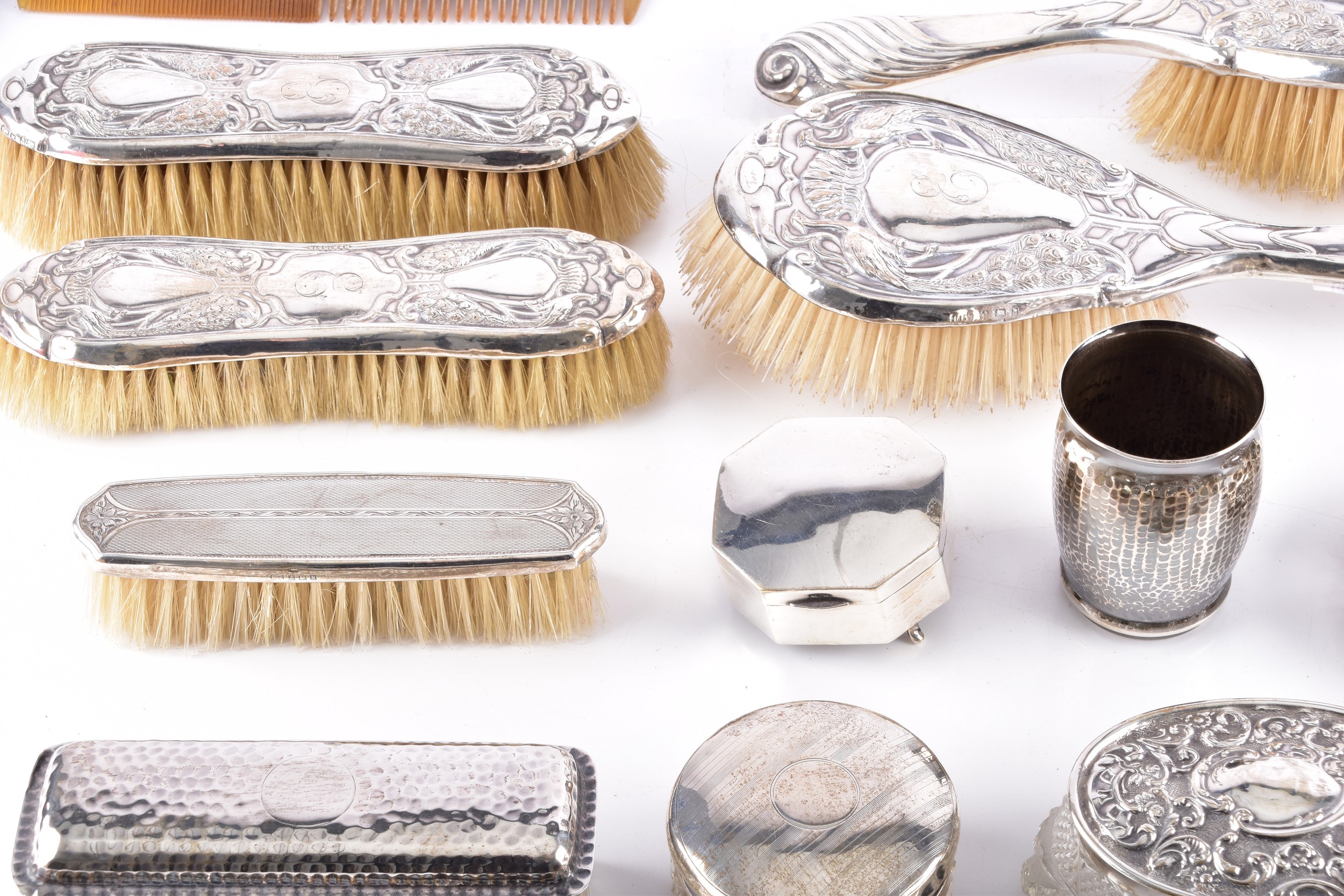 with repousse floral and foliate decoration, two hair brushes, two clothes brushes and shoe horn, Birmingham 1901 by Henry Matthews, another Dressing table set comprising on a hand mirror, hairbrush and clothes brush featuring engine-turned decoration and foliate detail, hallmarked for Birmingham 1962 by Walker & Hall, three silver lidded cut glass trinket boxes, a silver handled button hook, two silver footed and lined trinket boxes, two napkin rings, pill box and cup, together with a loose silver lid and white metal decorative small dish.