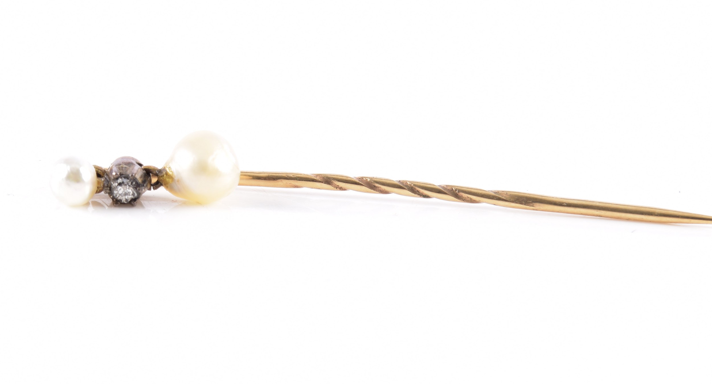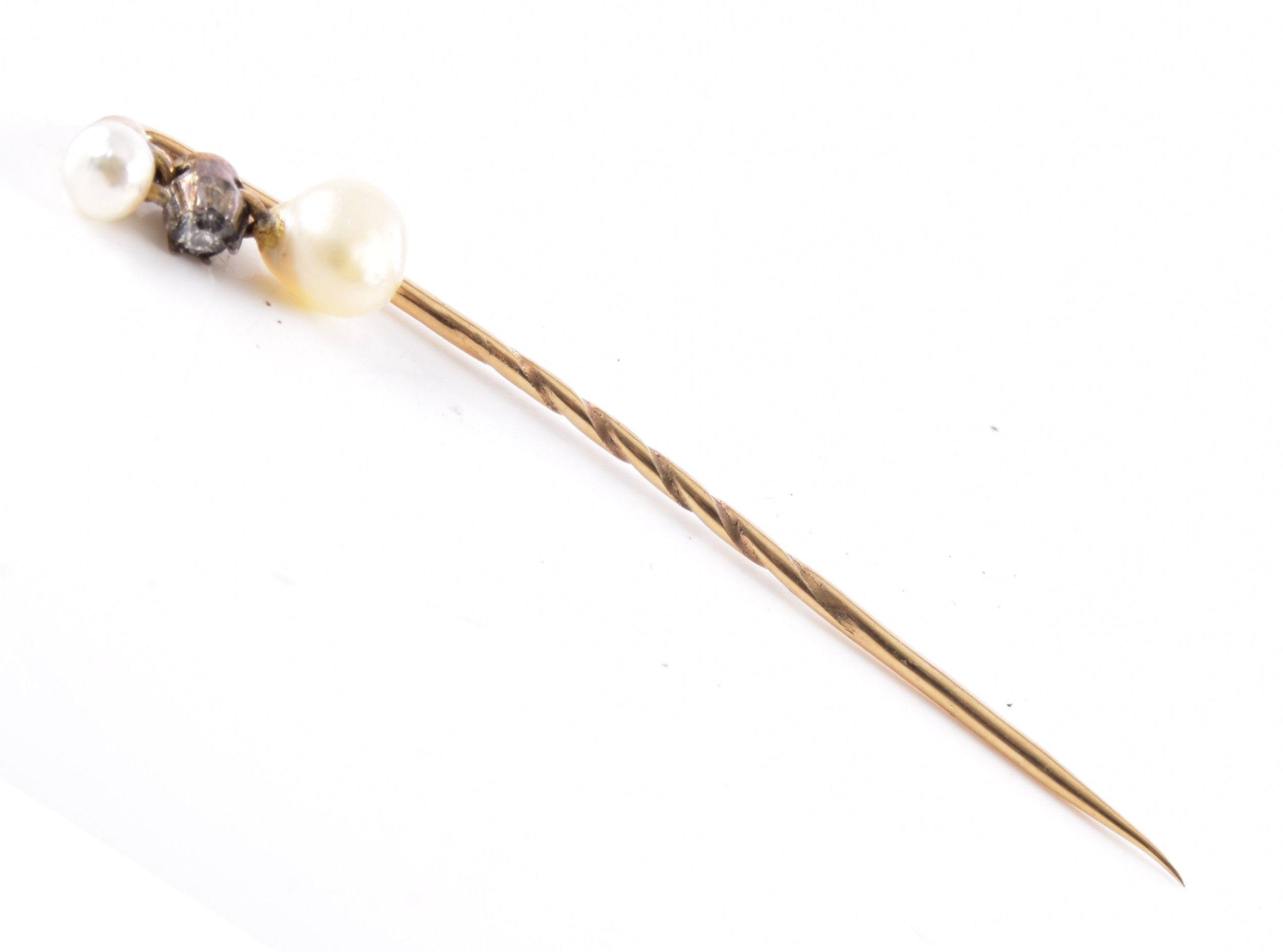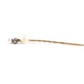 Pearl and diamond pin unmarked, tests as 9ct gold.