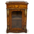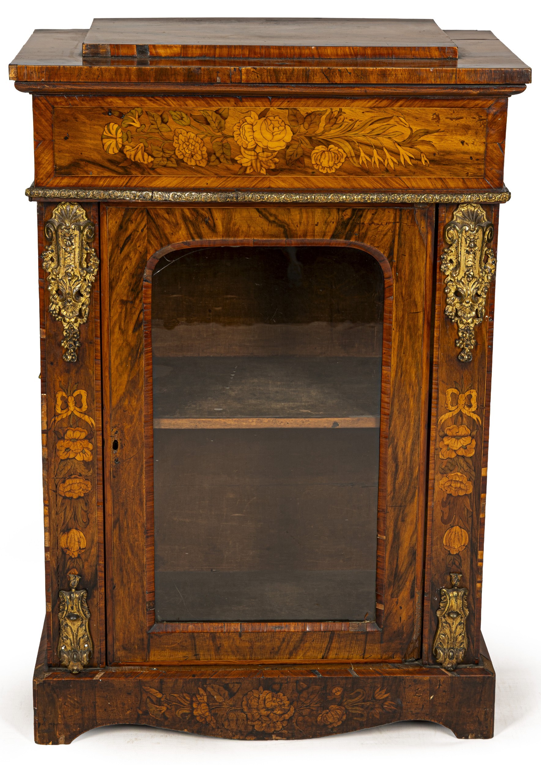 The rectangular top above a floral inlaid frieze, a single glazed door below enclosing a single shelf, the corners and sides adorned in ormulu mounts cast in scroll and acanthus leaf designs on a plinth base, distress