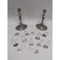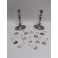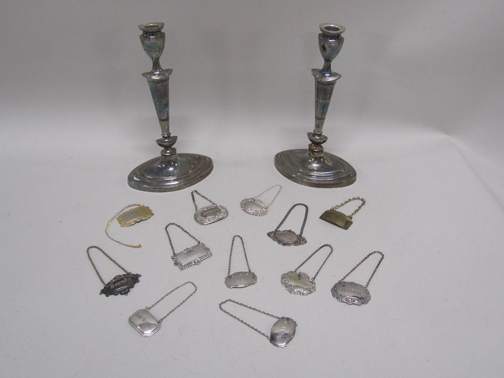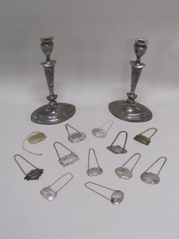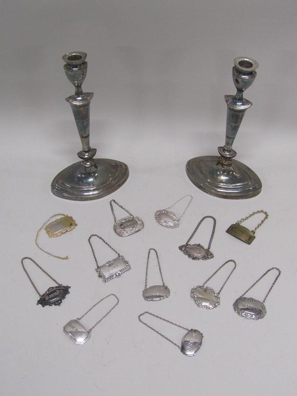 TWO SILVER PLATED CANDLESTICKS AND A QTY OF BOTTLE LABELS