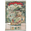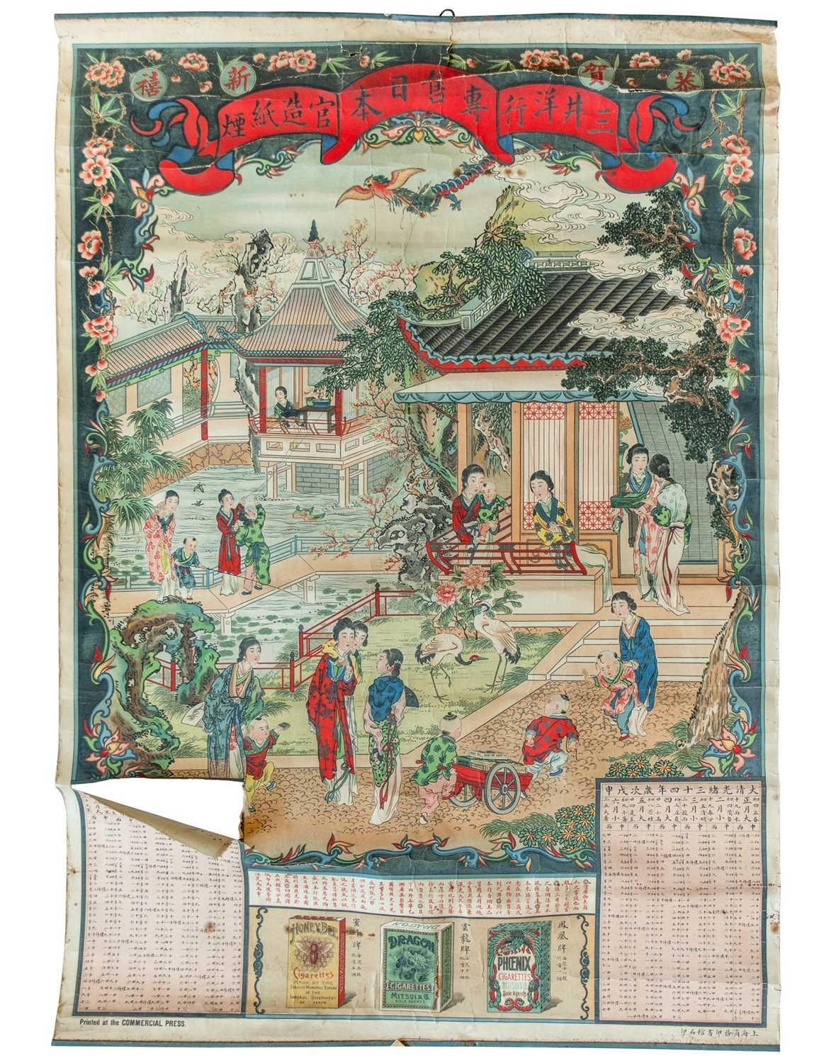A Chinese cigarette advertising calendar, early 20th century. 'Printed at the Commercial Press', 82 x 58cm. Very torn and creased.