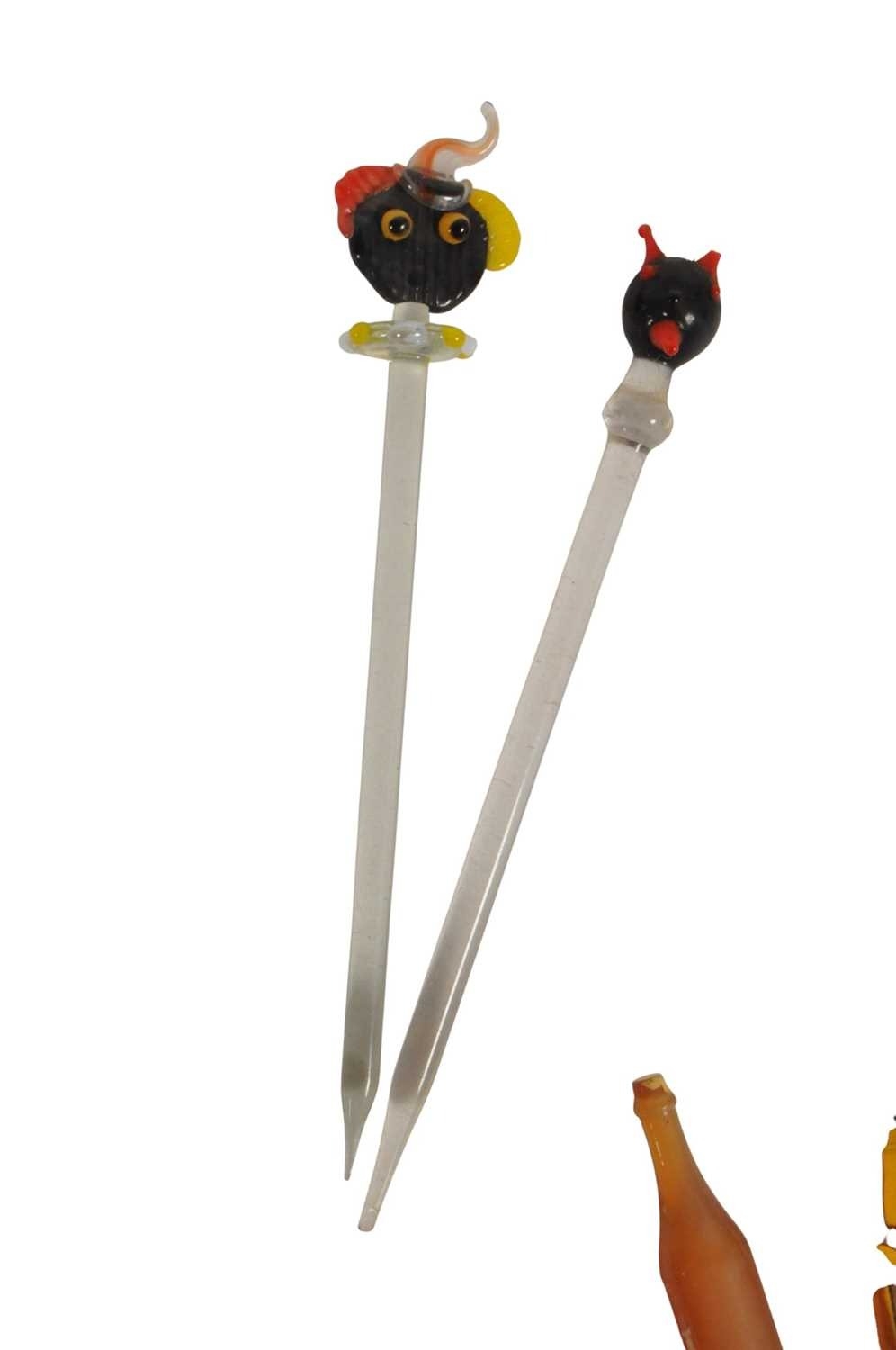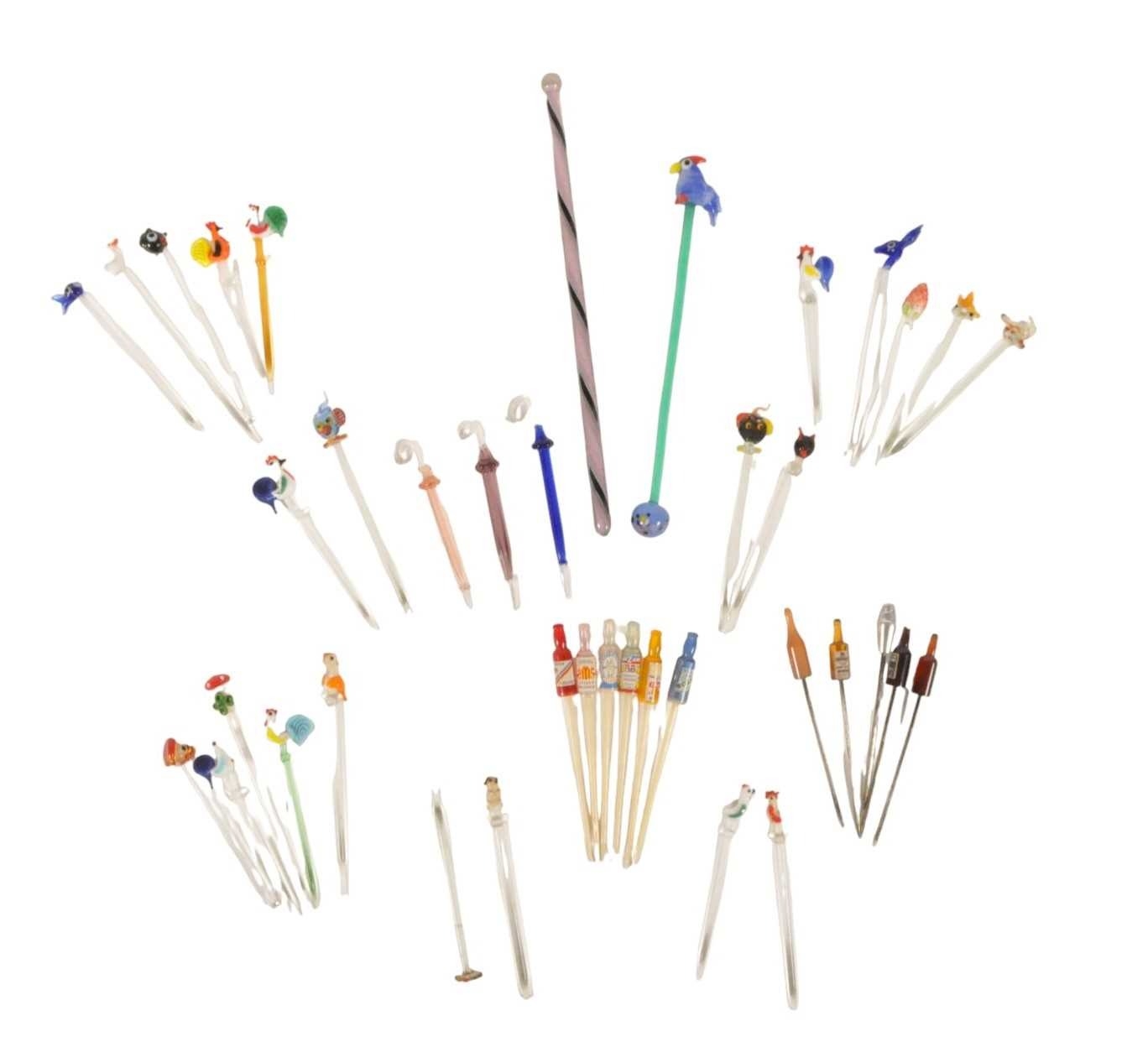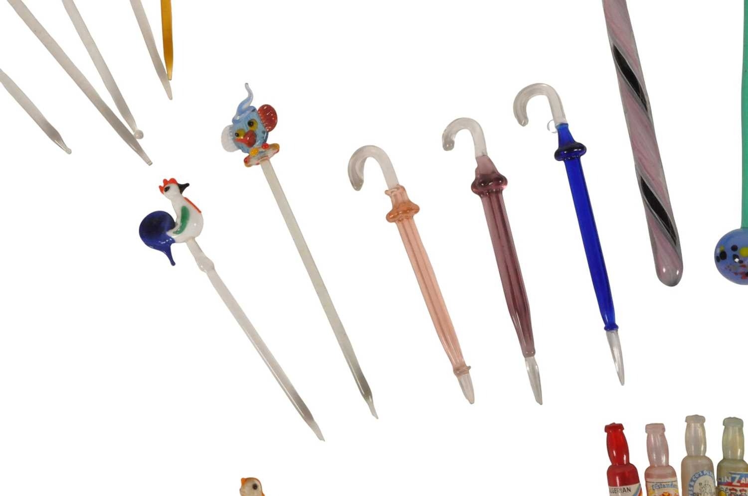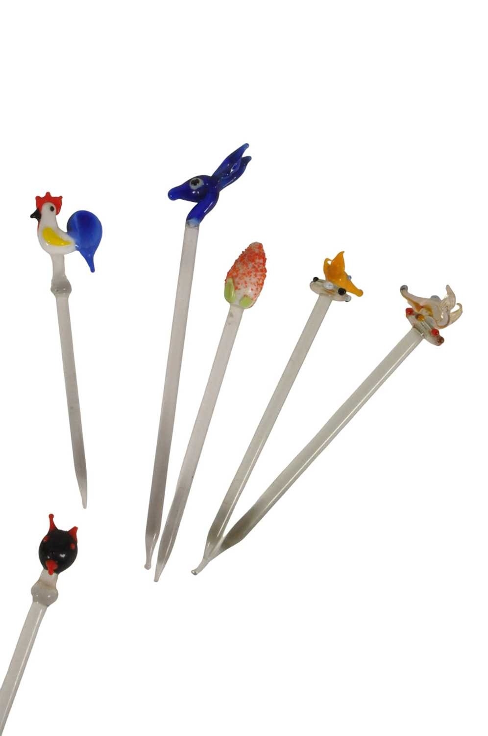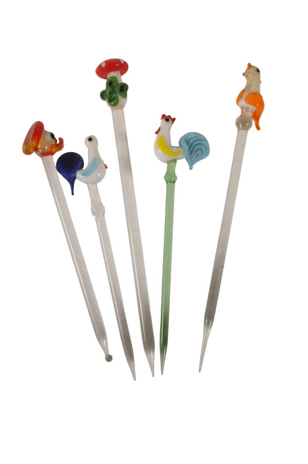 Collection of mid century vintage novelty glass cocktail sticks / swizzlers. To include chickens, bottles, umbrella, toadstool, fish, and more. Longest measuring approx. 15cm in length.