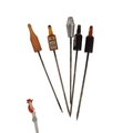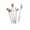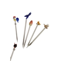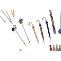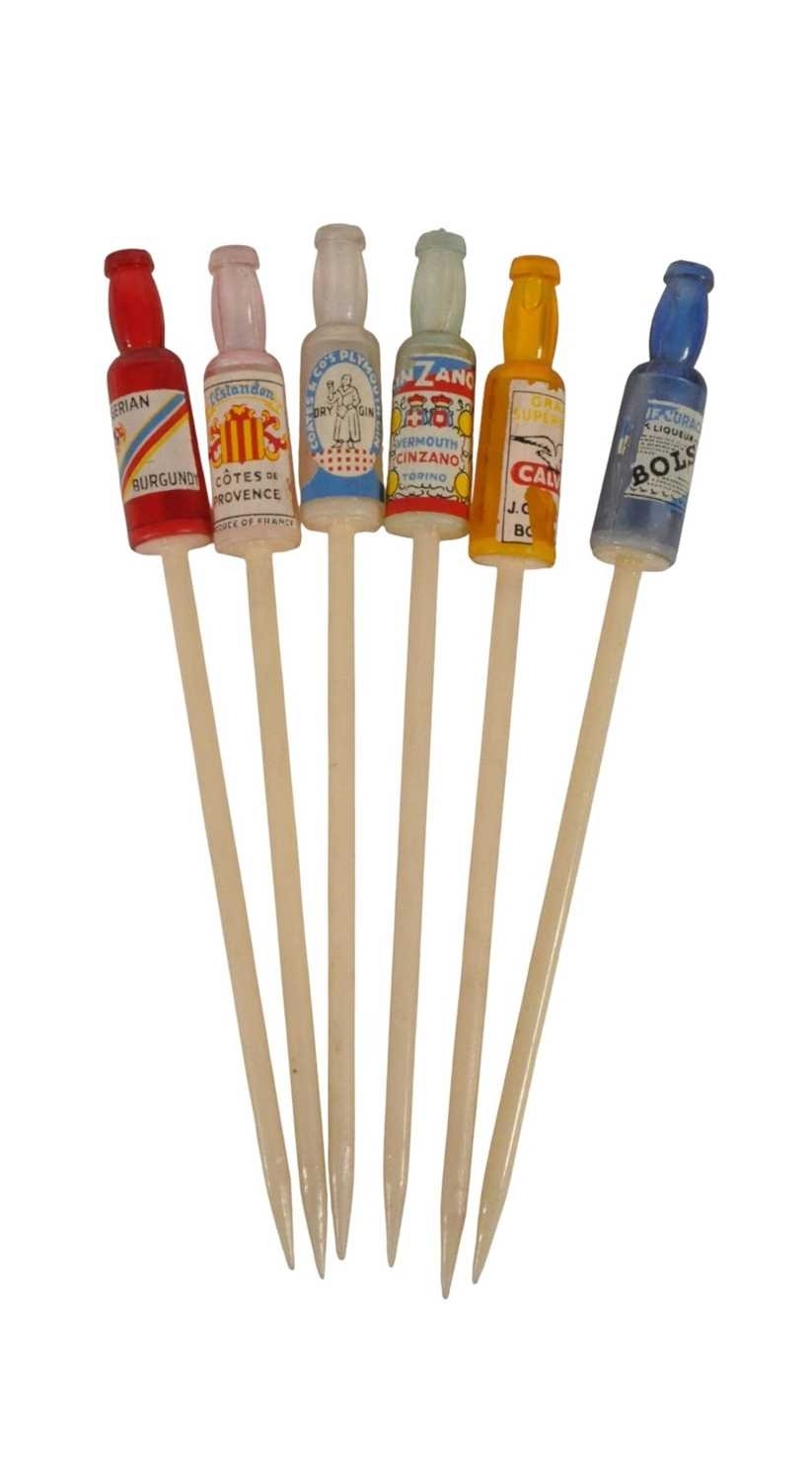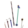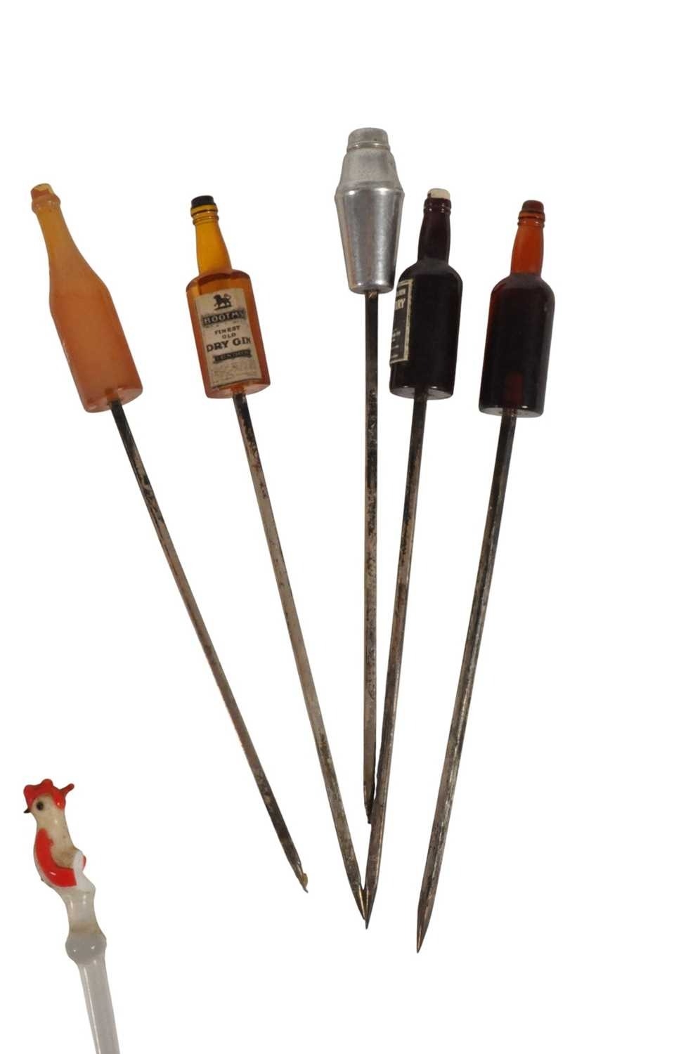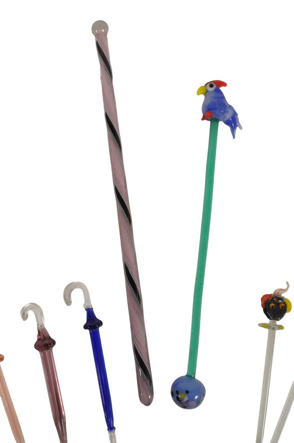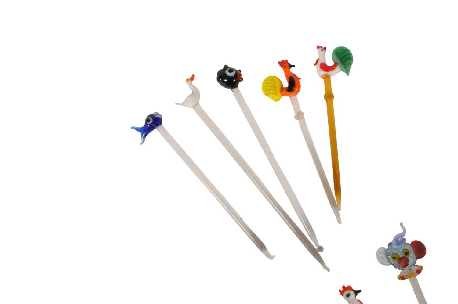 Collection of mid century vintage novelty glass cocktail sticks / swizzlers. To include chickens, bottles, umbrella, toadstool, fish, and more. Longest measuring approx. 15cm in length.