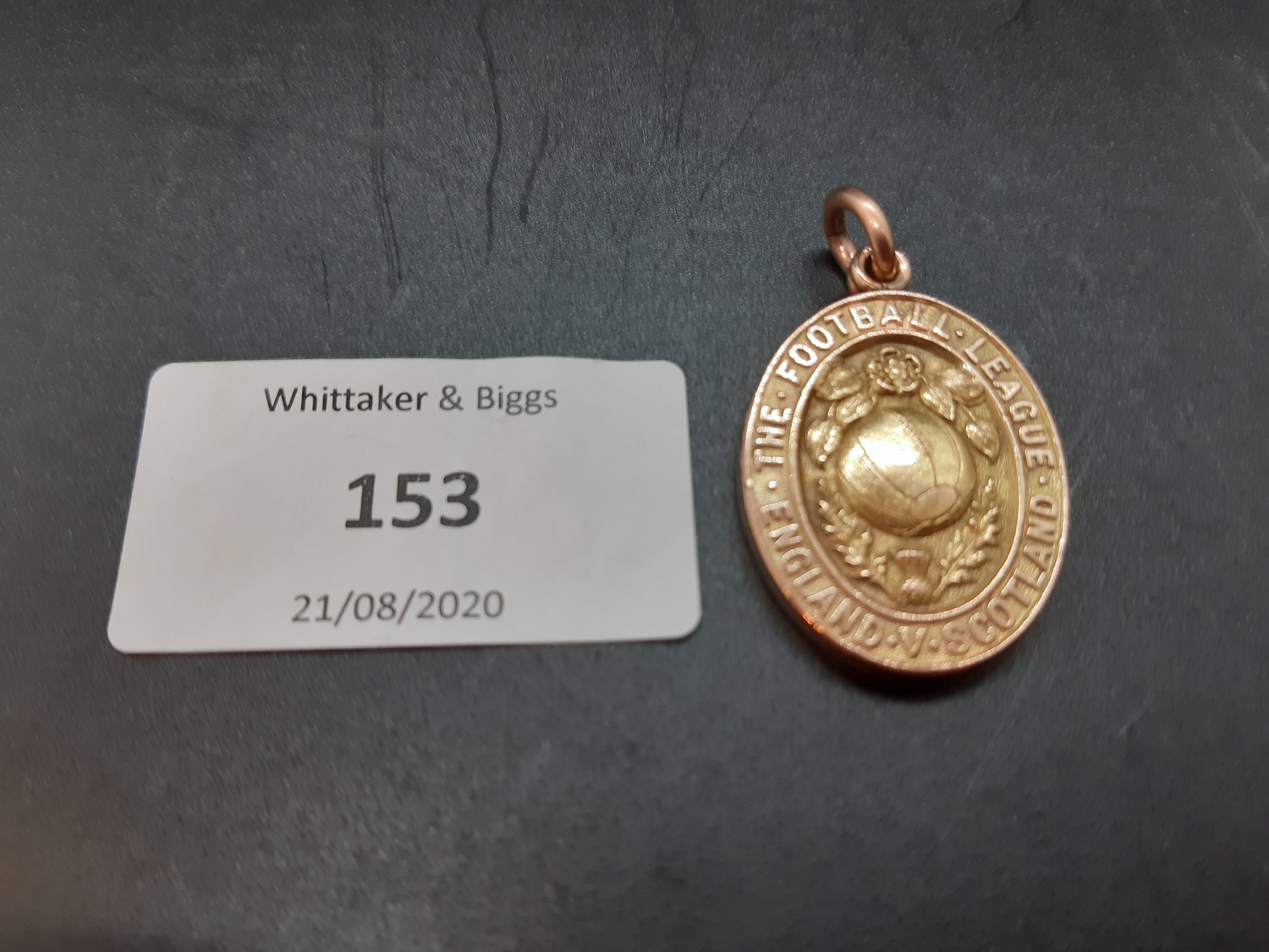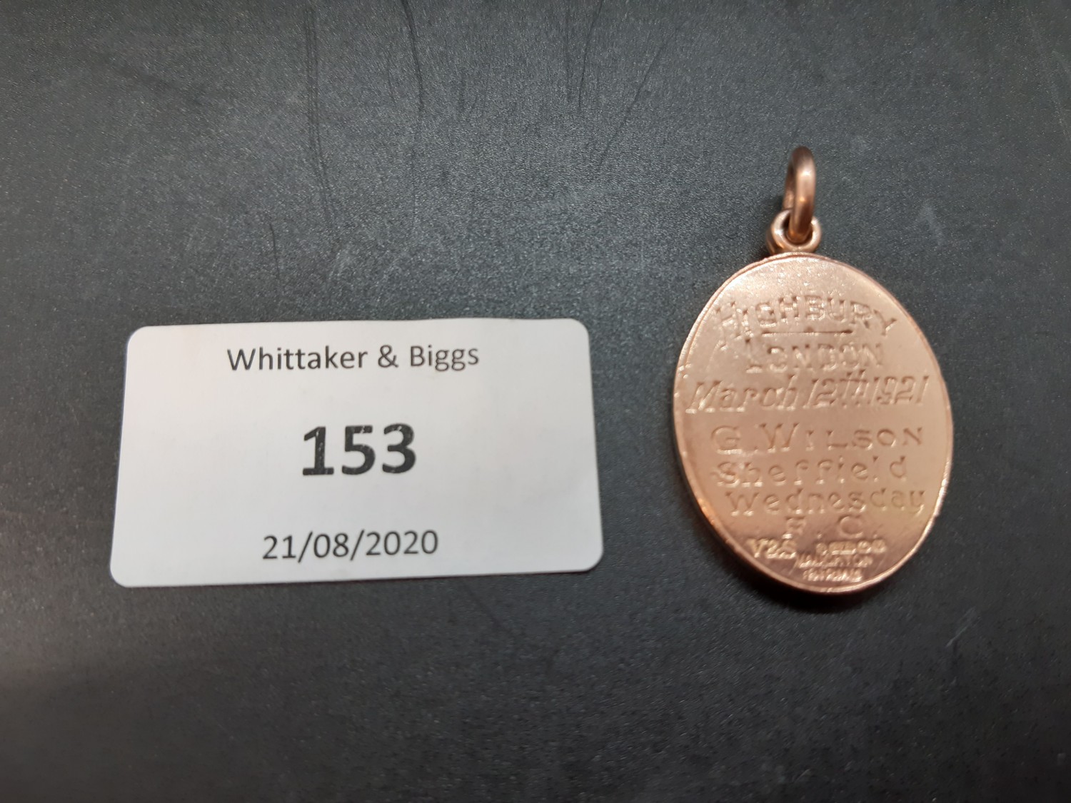 A hallmarked 9ct gold medal awarded to George Wilson for captaining the English Football League XI in their 1-0 victory vs the Scottish Football League XI on 12th March 1921 at Highbury, London - weight approx. 15 grams and measuring approx. 3cm in height and 2.1cm in width