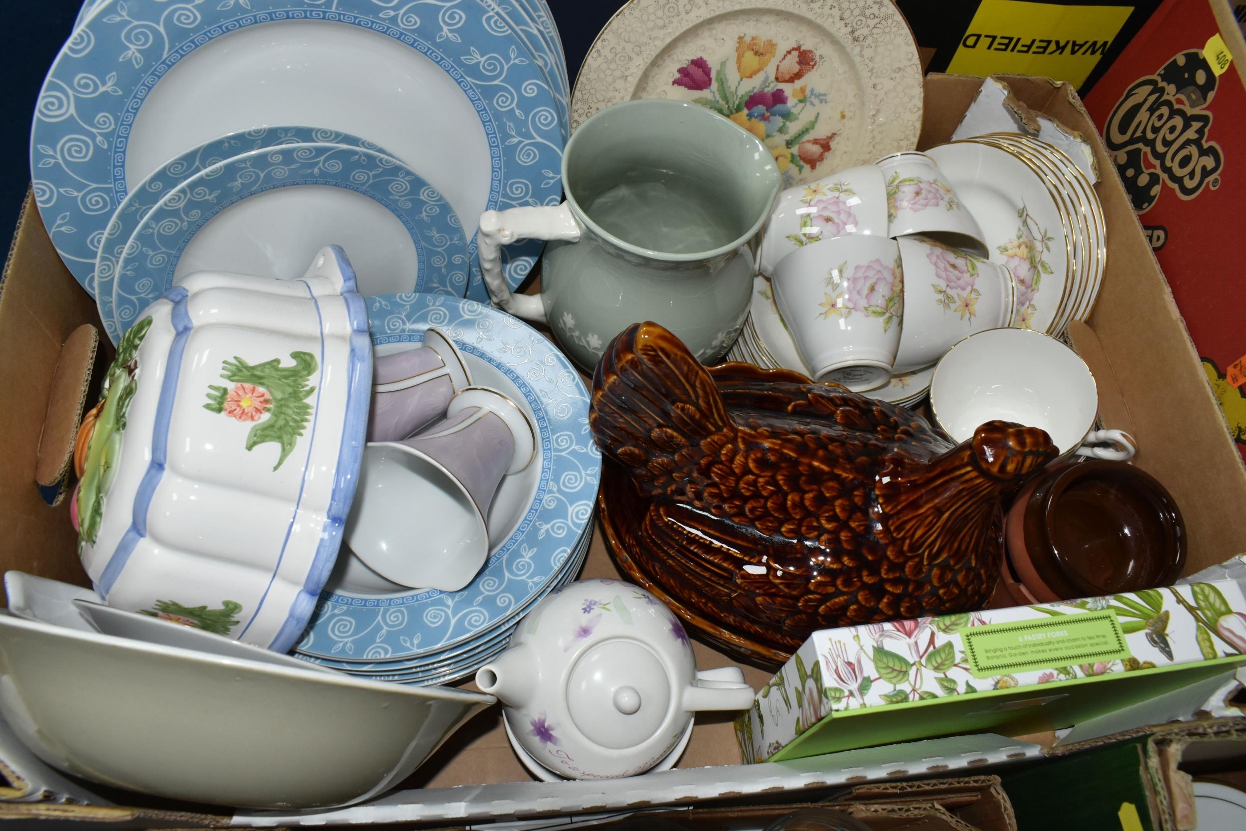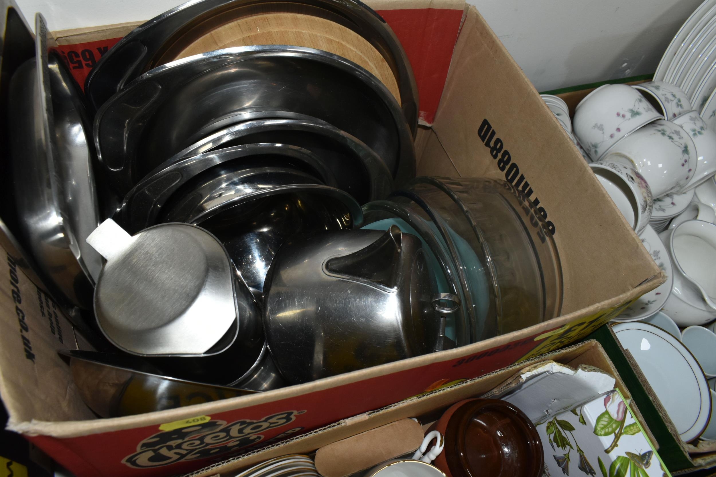 FOUR BOXES OF CERAMICS, GLASS AND METALWARE, including a boxed set of six Portmeirion Botanic Garden pastry forks, a quantity of Royal Doulton Expressions 'Strawberry Fayre' pattern dinner and tea ware, stainless steel serving dishes, etc (4 boxes)