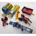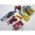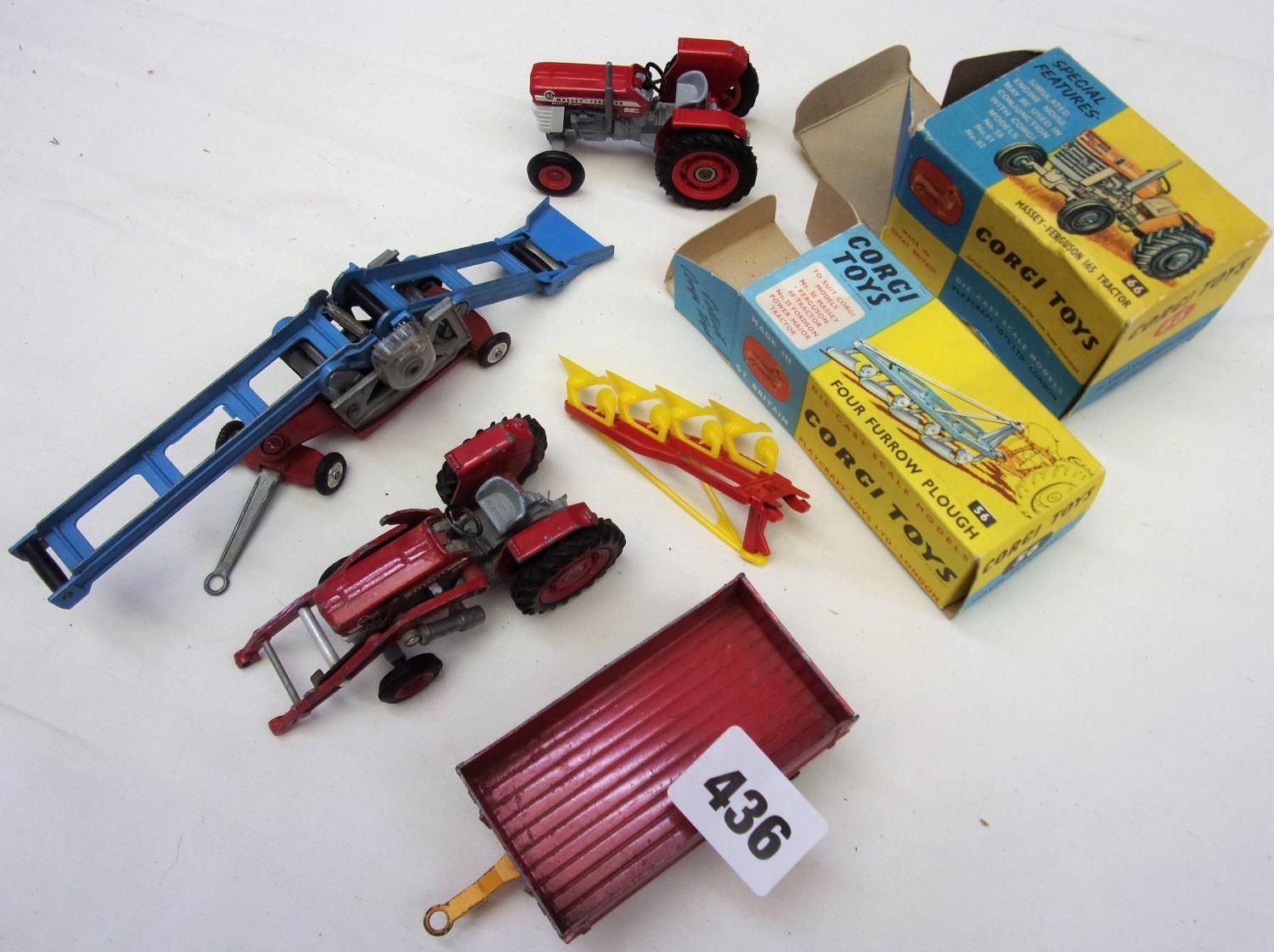 CORGI TOYS MASSEY FERGUSON 165 TRACTOR NUMBER 66 IN BOX, T/W 56 FOUR FARROW PLOUGH BOXED PLUS ELEVATOR U/B, TRACTOR AND TRAILER UNBOXED