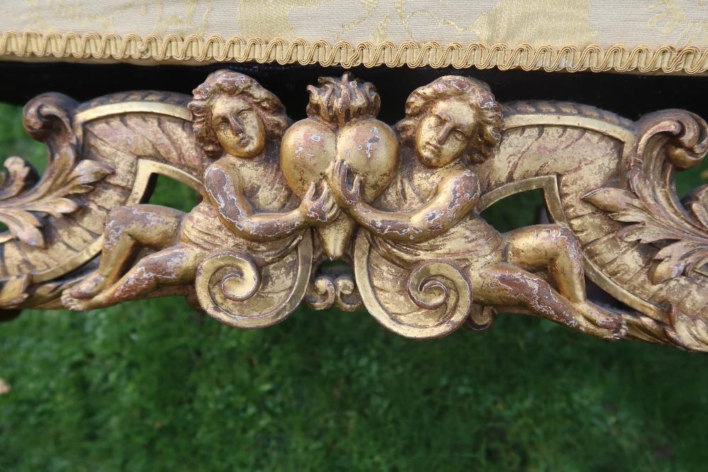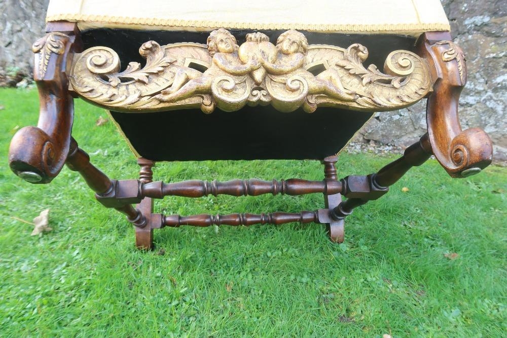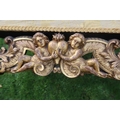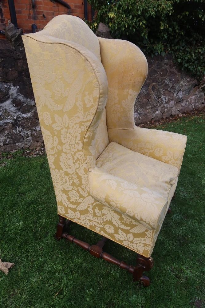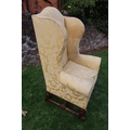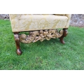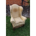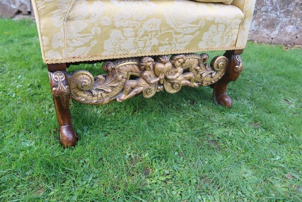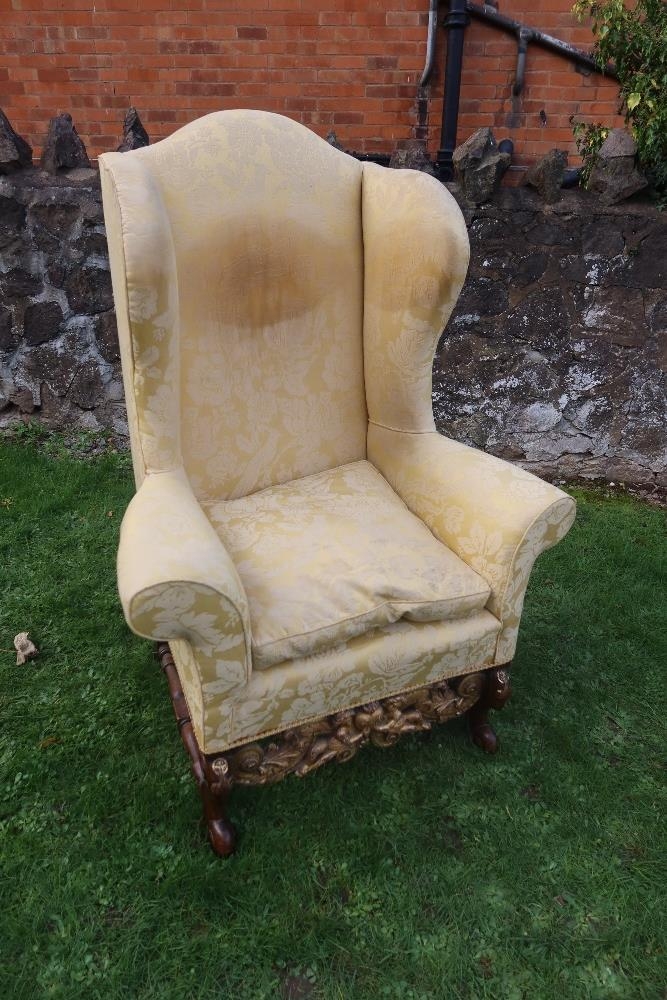 An 18th century Georgian wing back armchair, raised on carved front feet with carved frieze of cherubs