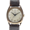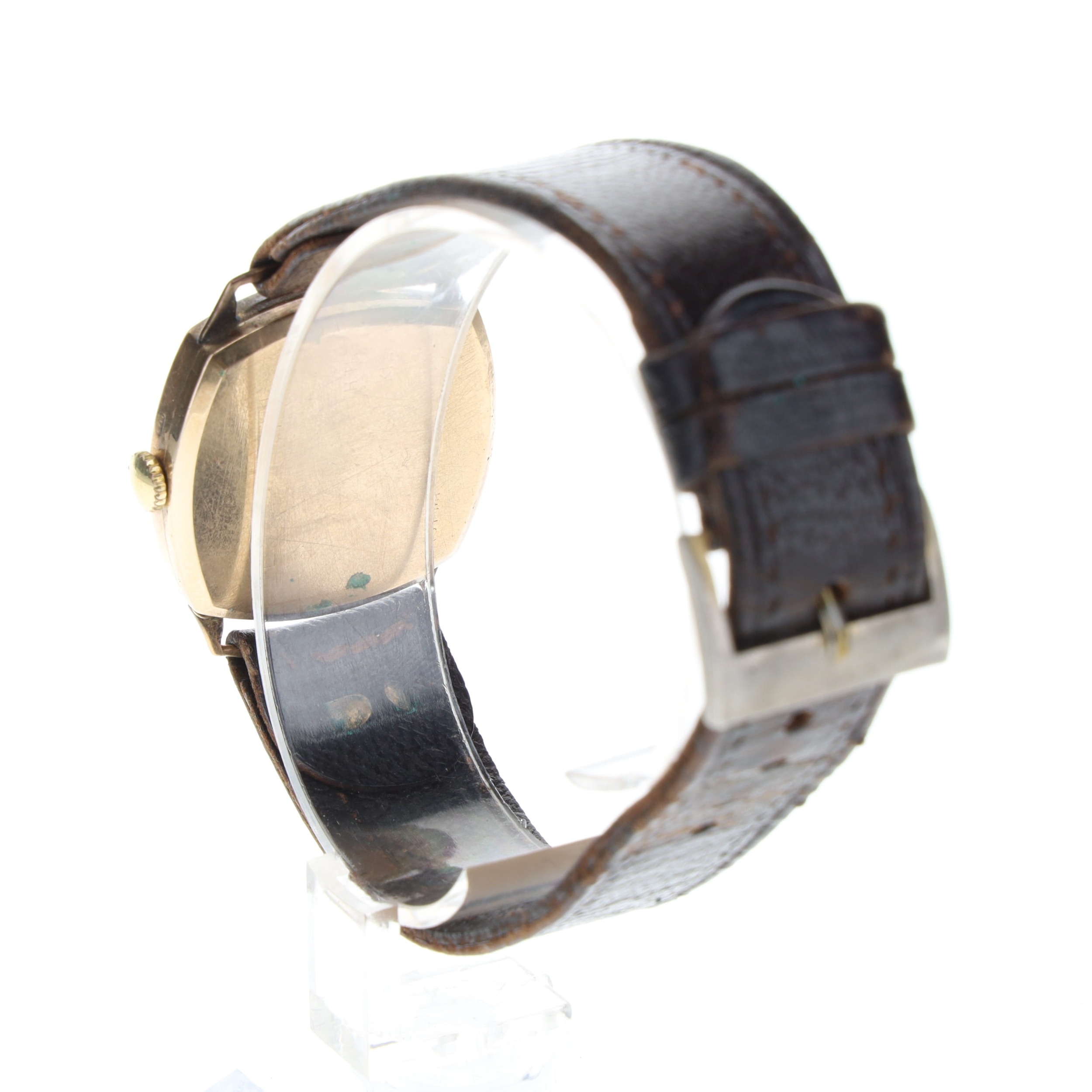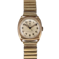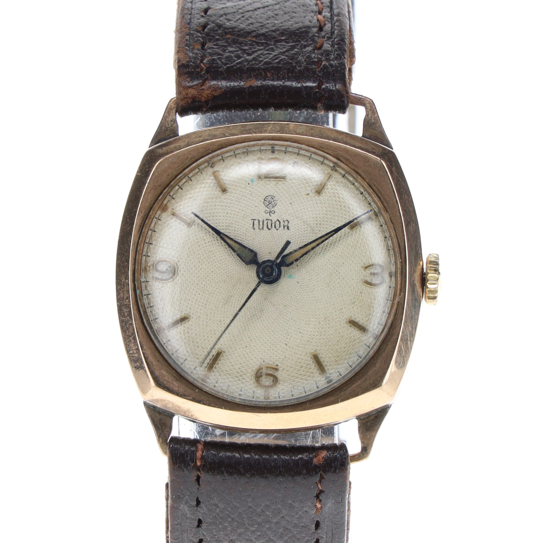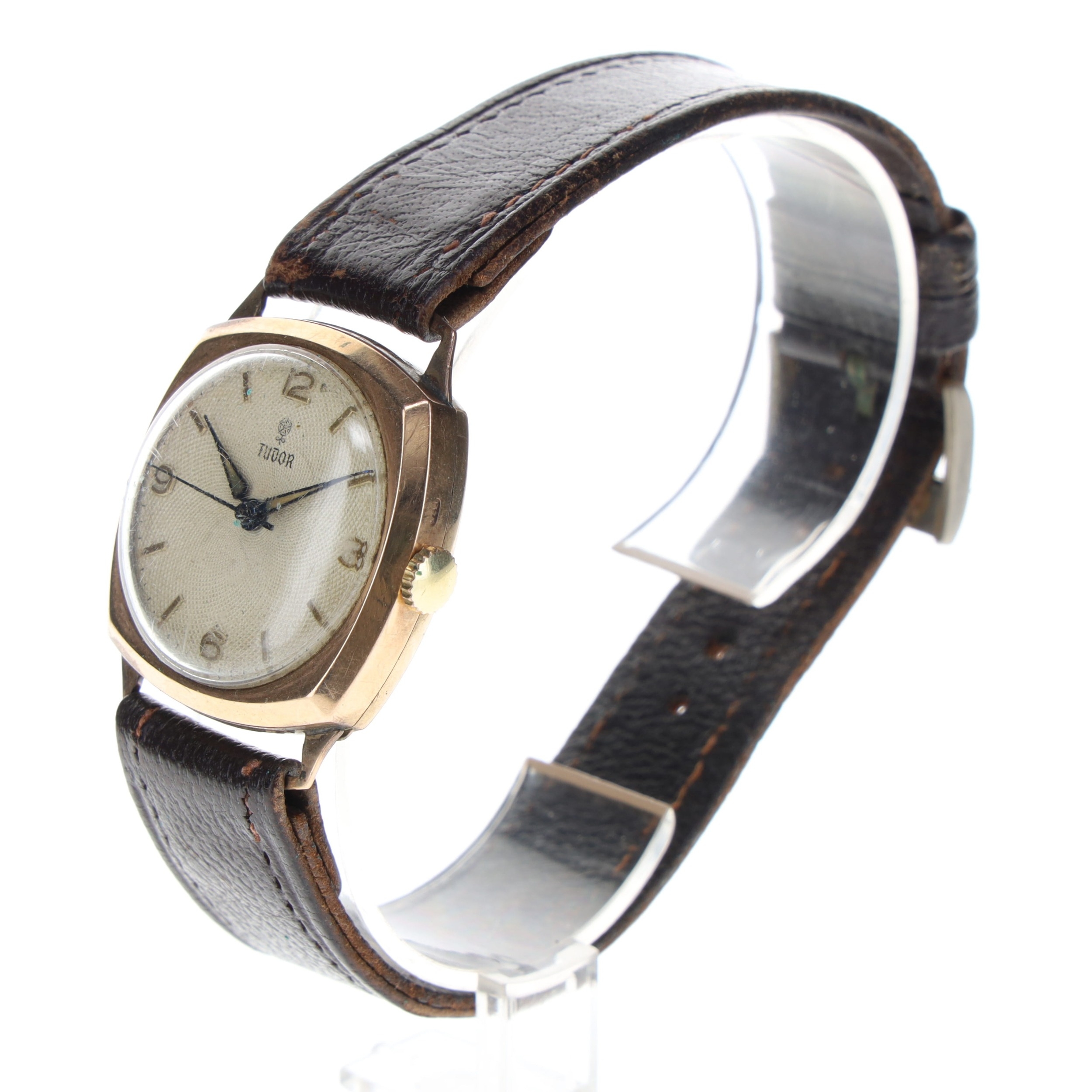 Tudor - 9ct Gold Vintage Watch. Tudor Signed Hand-wind movement. 9ct Gold case and Leather strap. Acrylic crystal has some scratches present. Watch is running at the time of listing offered without original box or papers. RWC signed cushion case fully hallmarked.