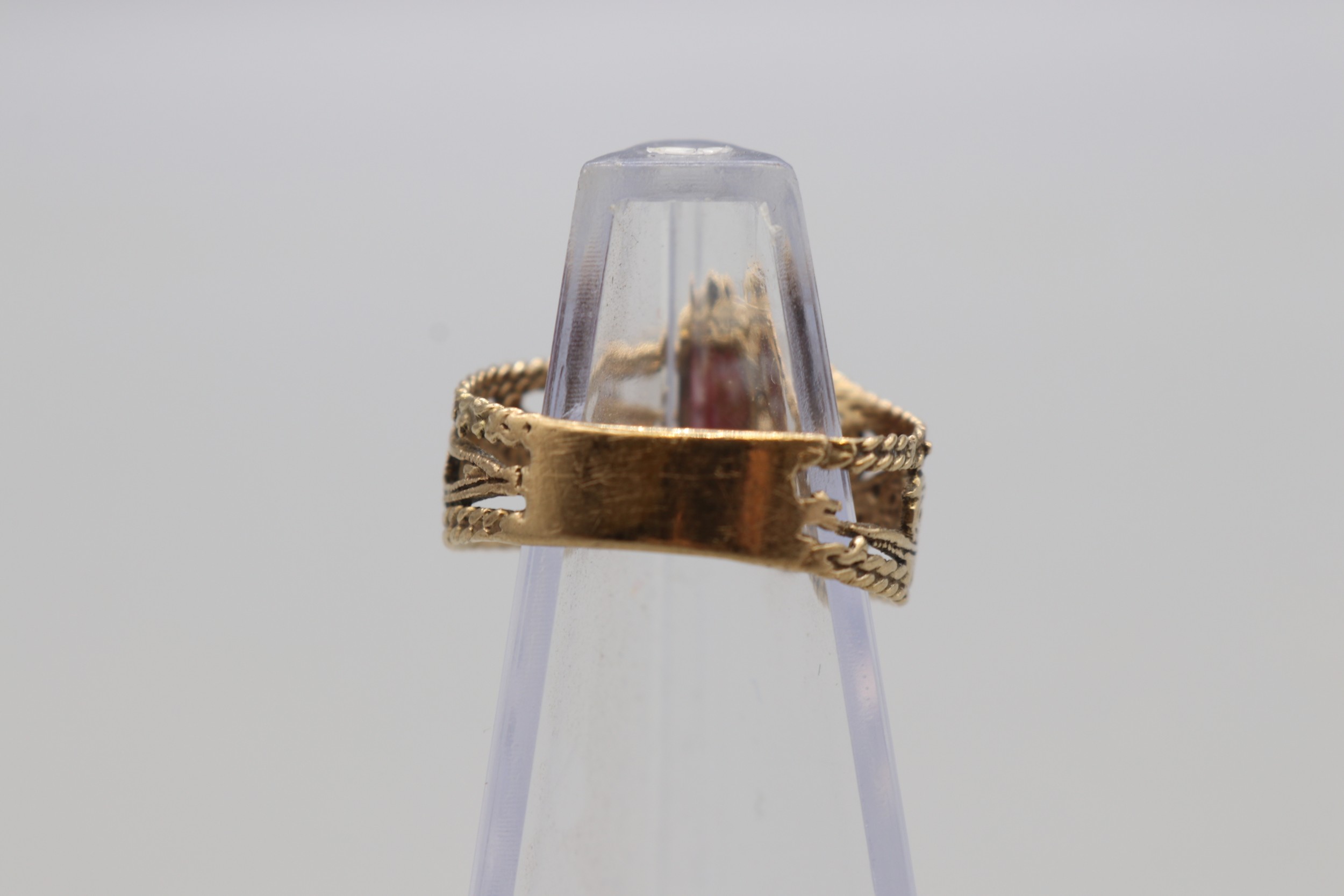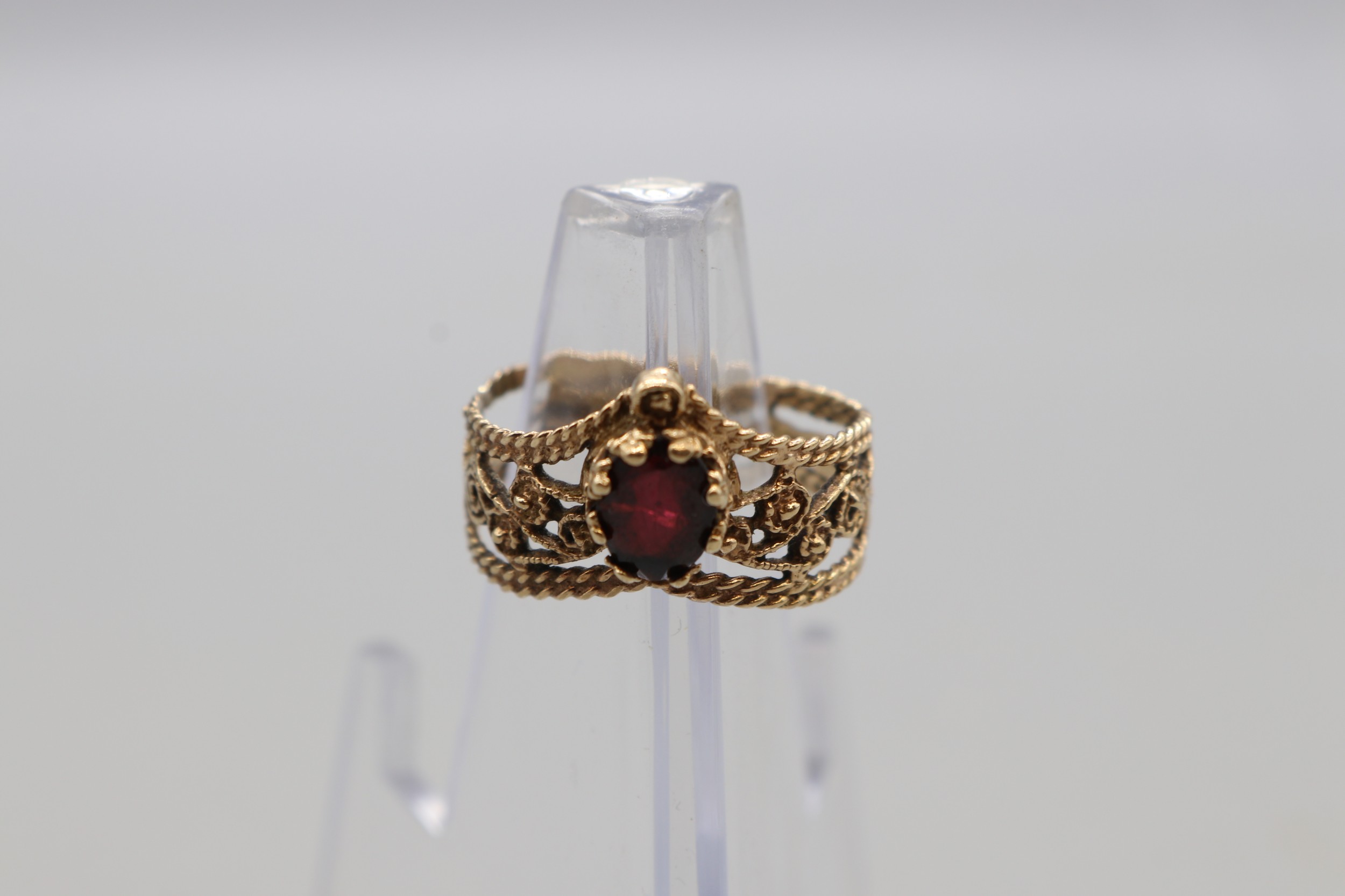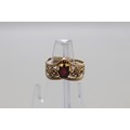 Hallmarked 9ct yellow gold oval garnet wishbone ring with scrollwork, weight 3.38g, size T