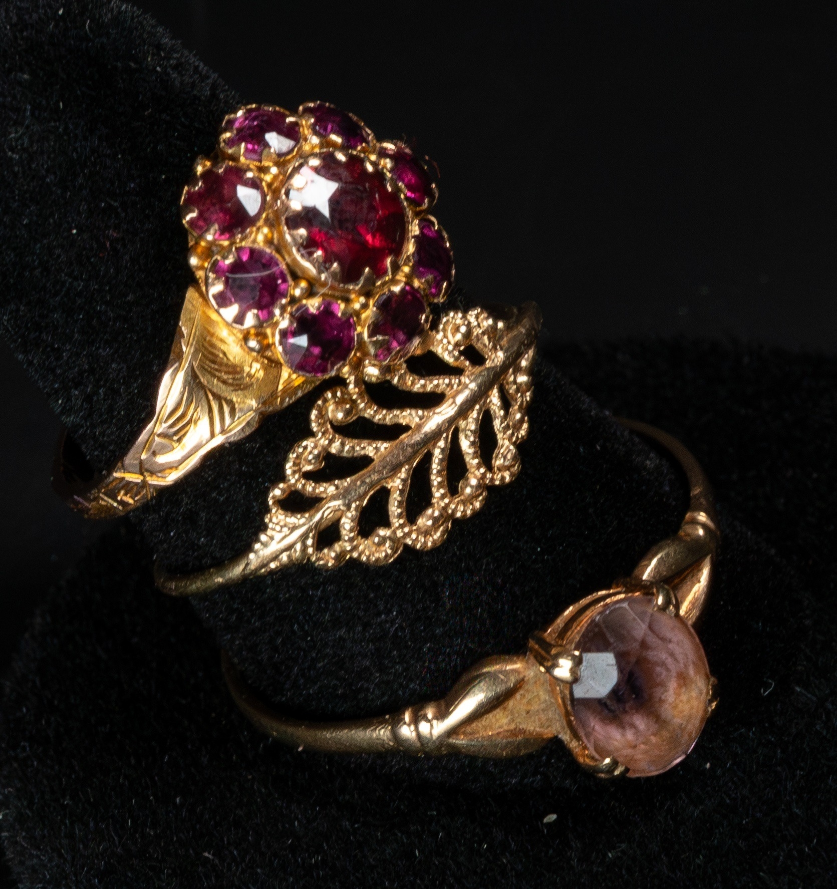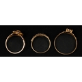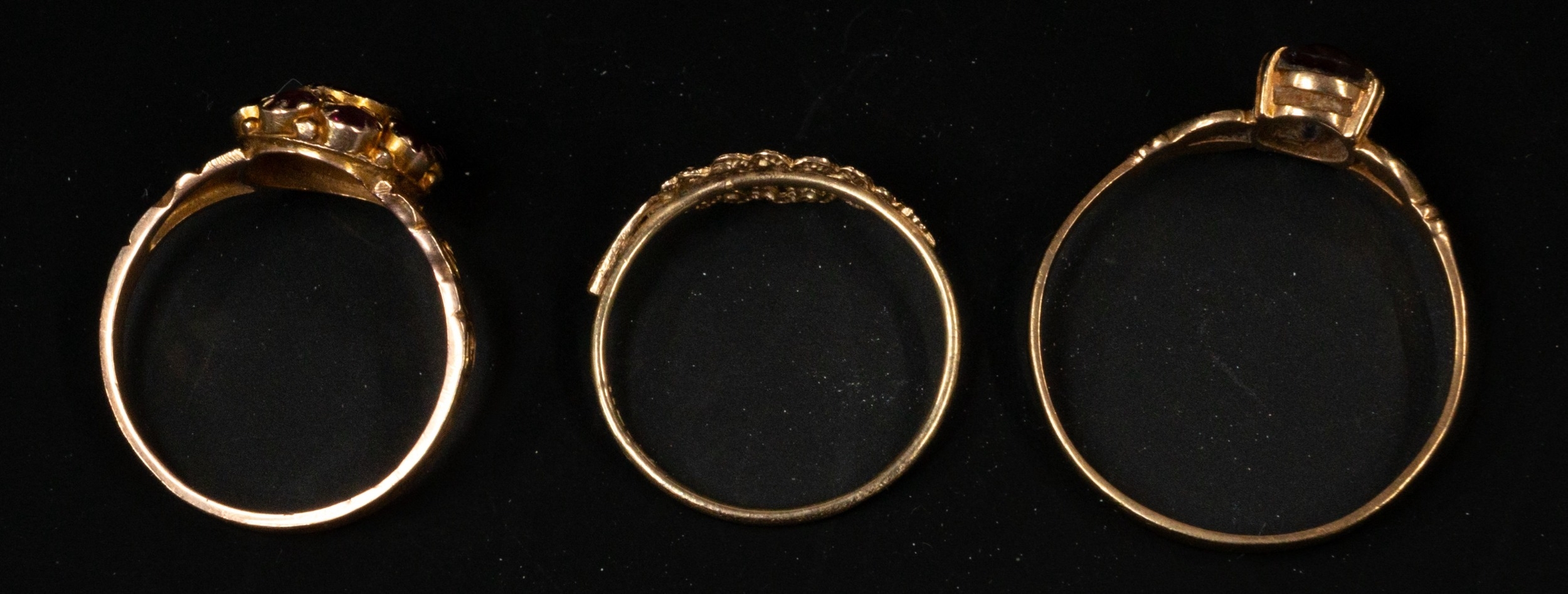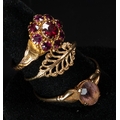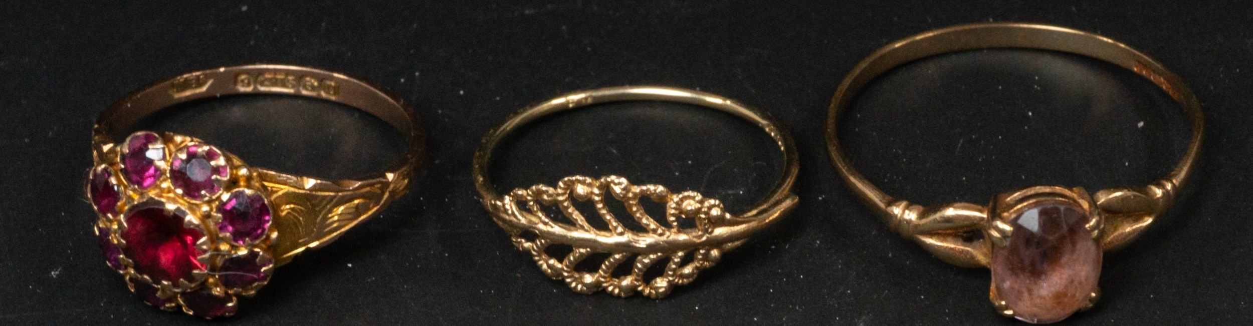 Jewellery: a 9ct gold and garnet cluster ring, UK size O; a 9ct gold and amethyst solitaire ring, UK size W, and a 9ct gold leaf style fretwork ring, UK size N, combined weight 4.4g.