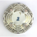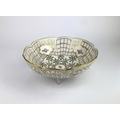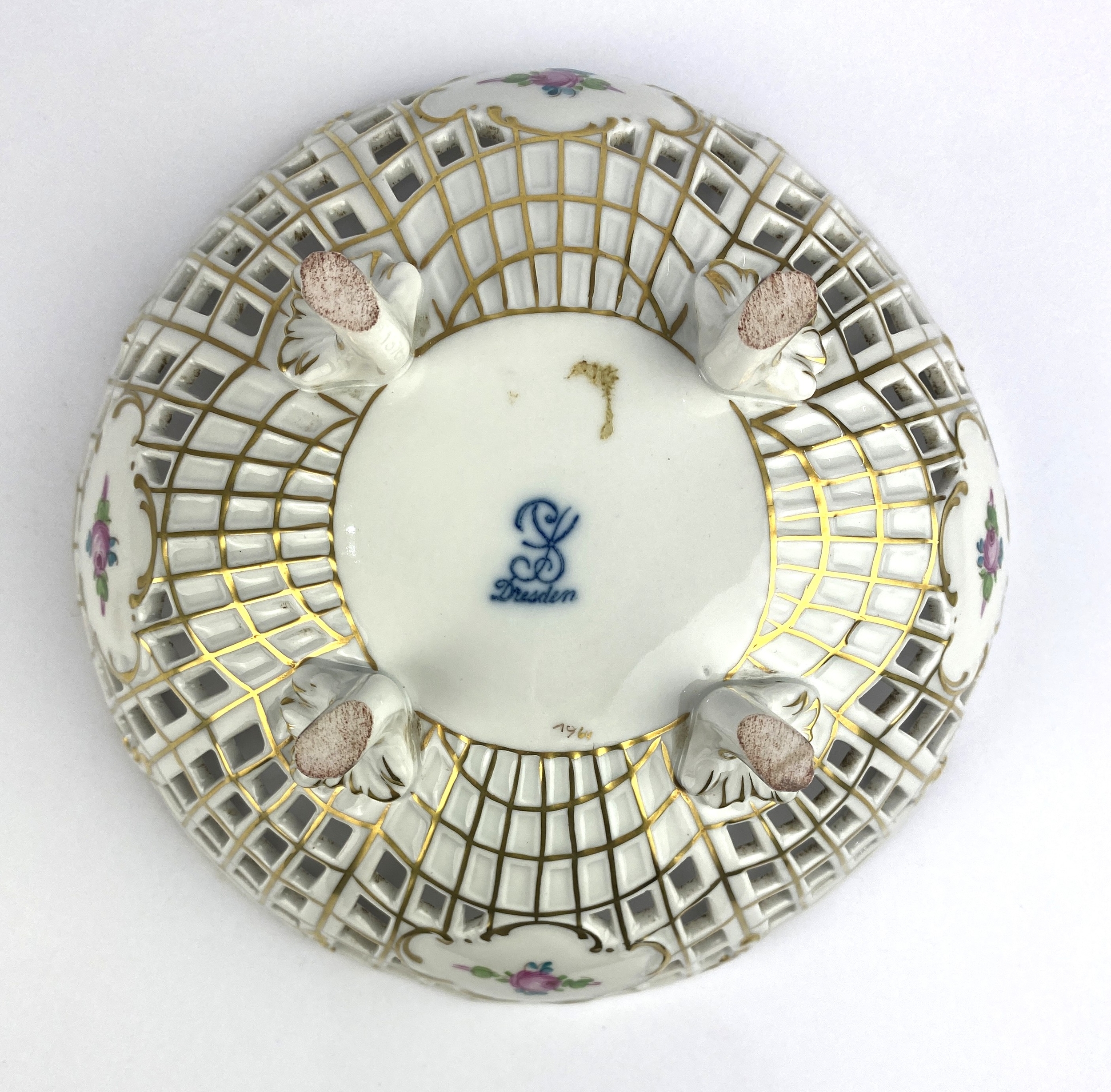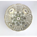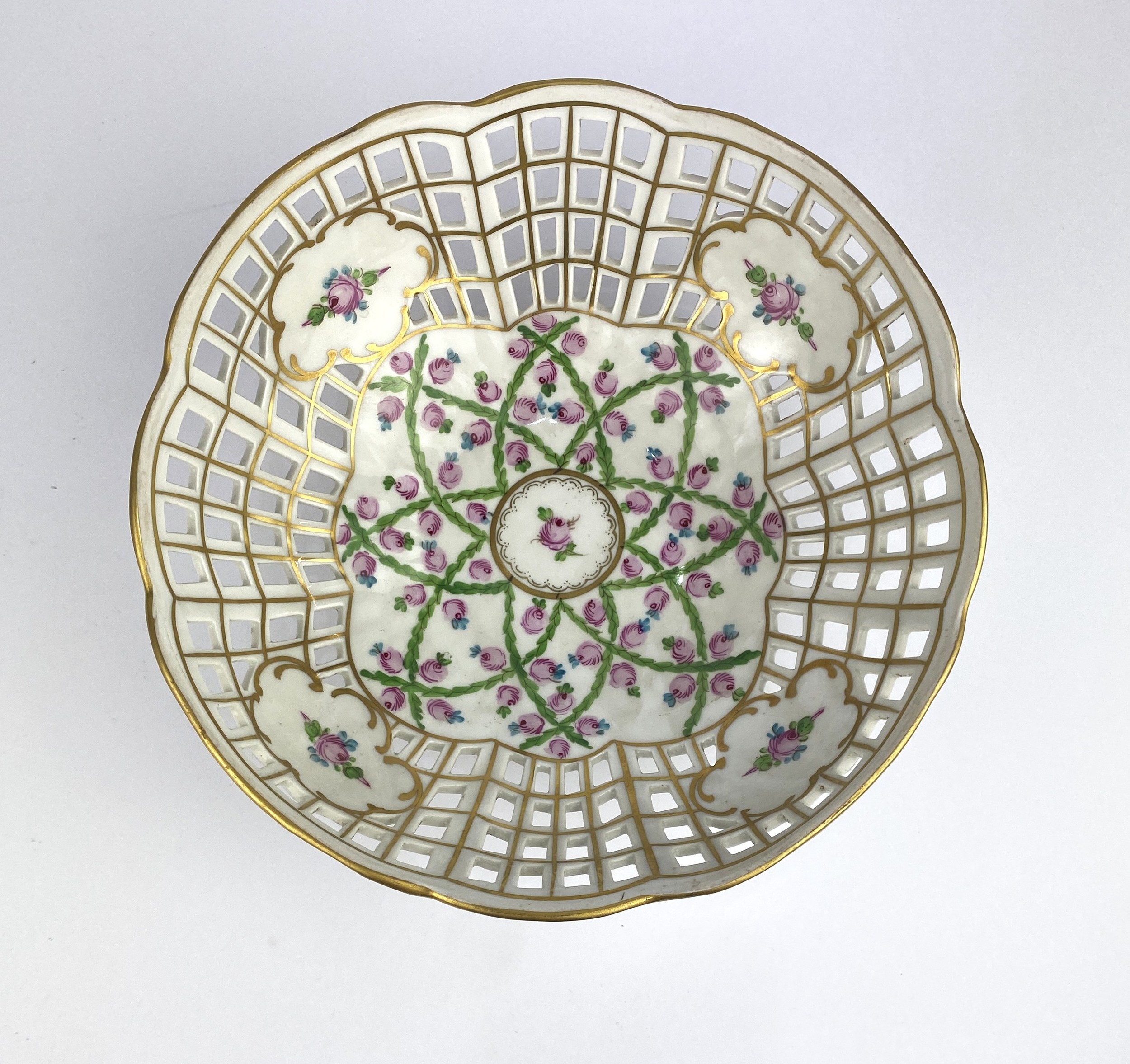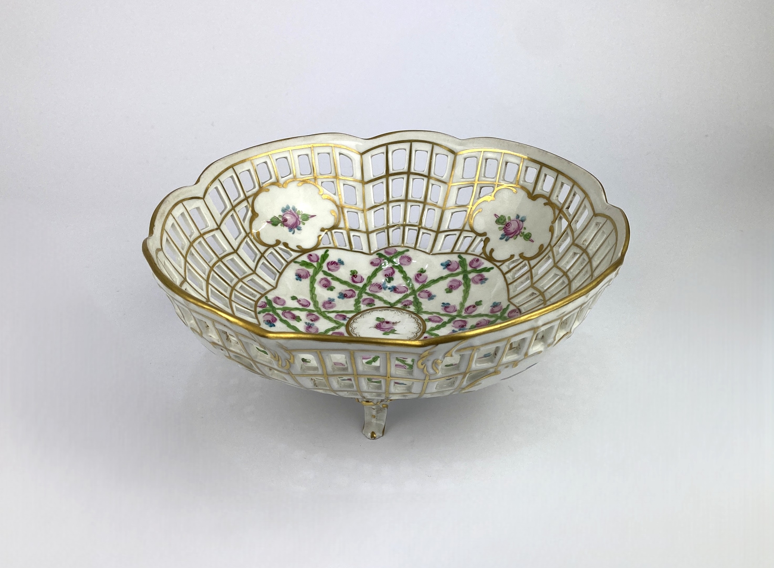 A Dresden reticulated porcelain bowl with pink floral decoration and gilt embellishments on four feet 19.5cm diameter